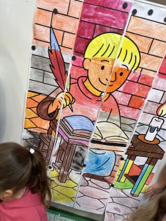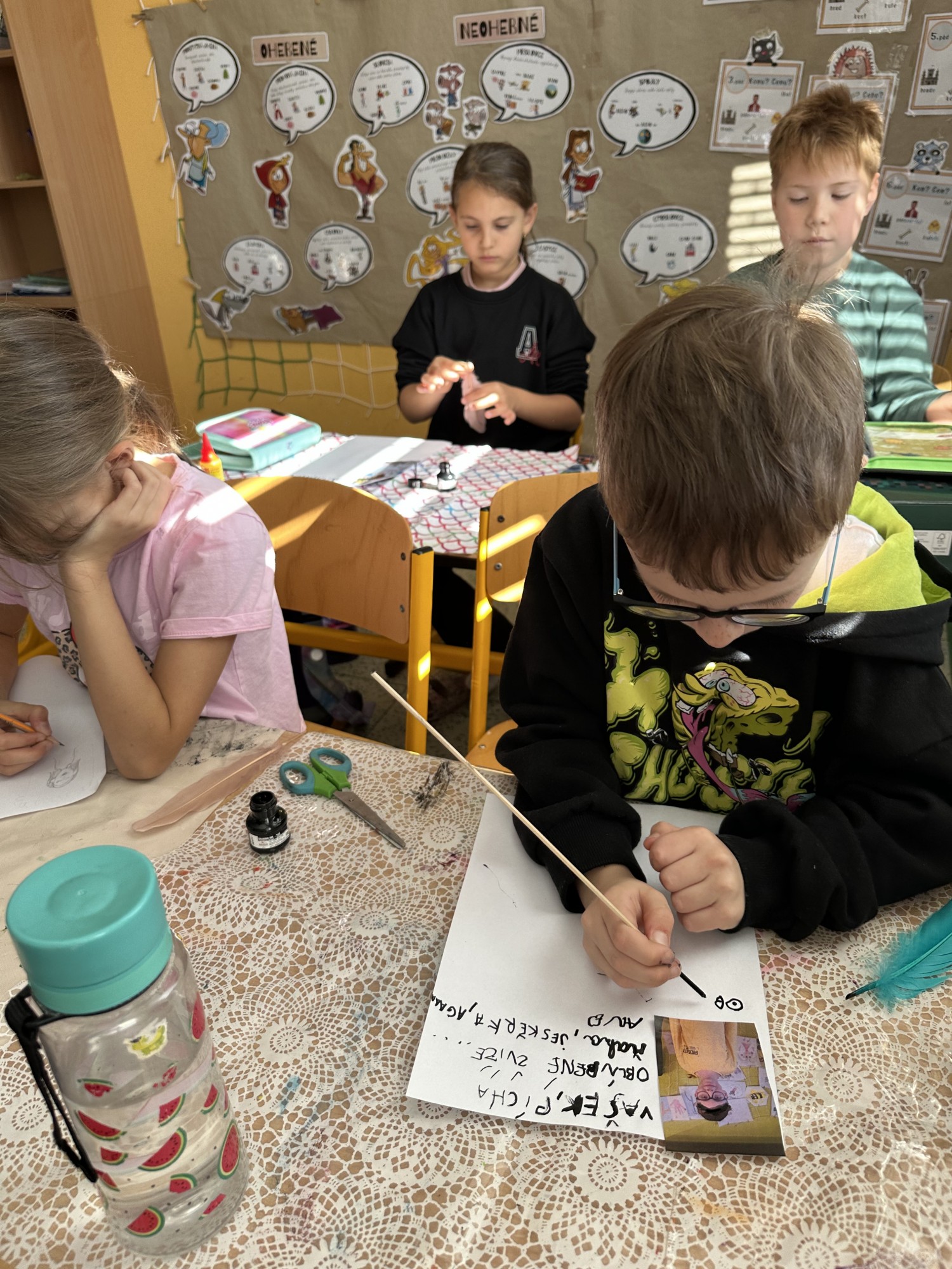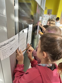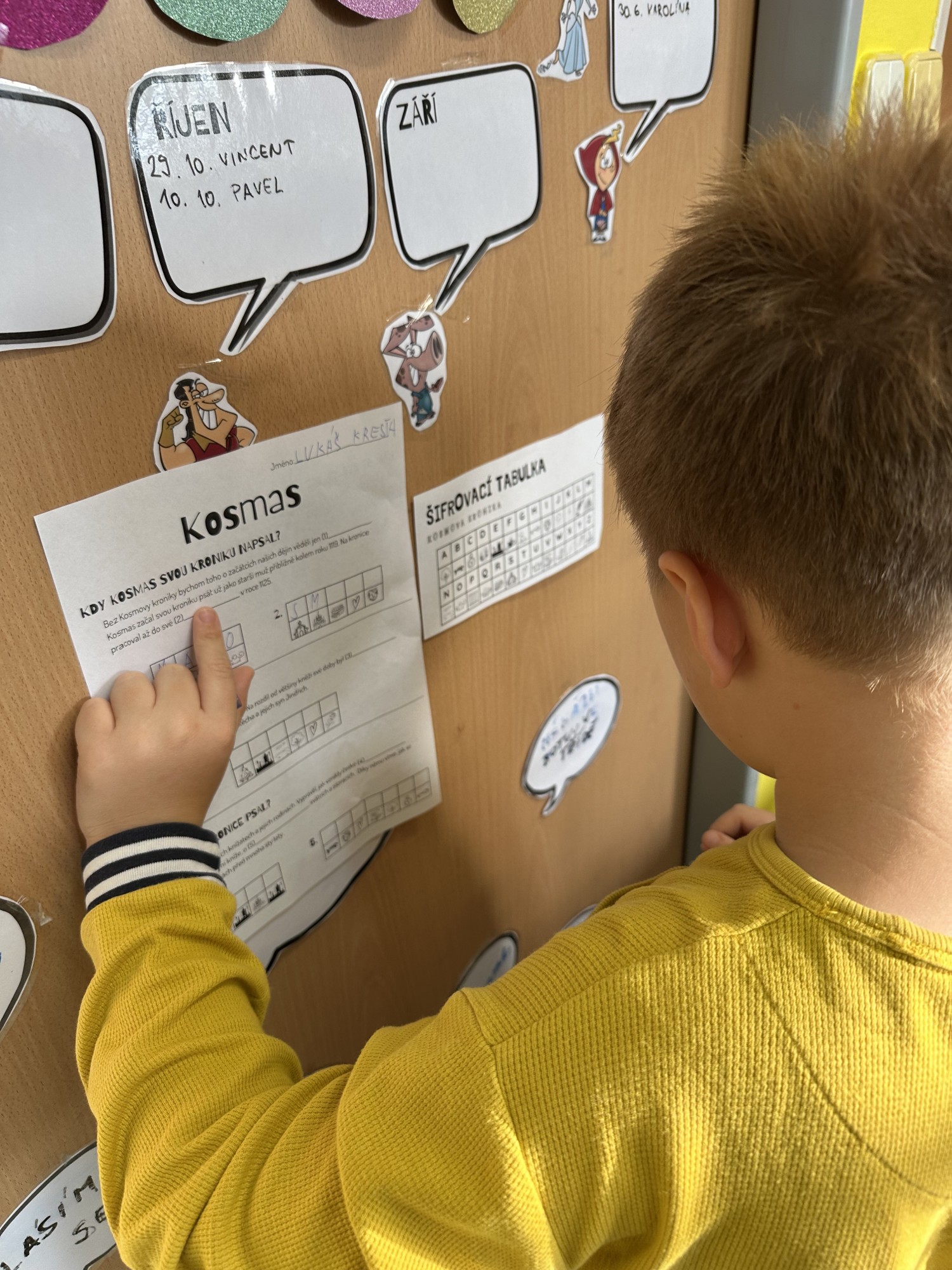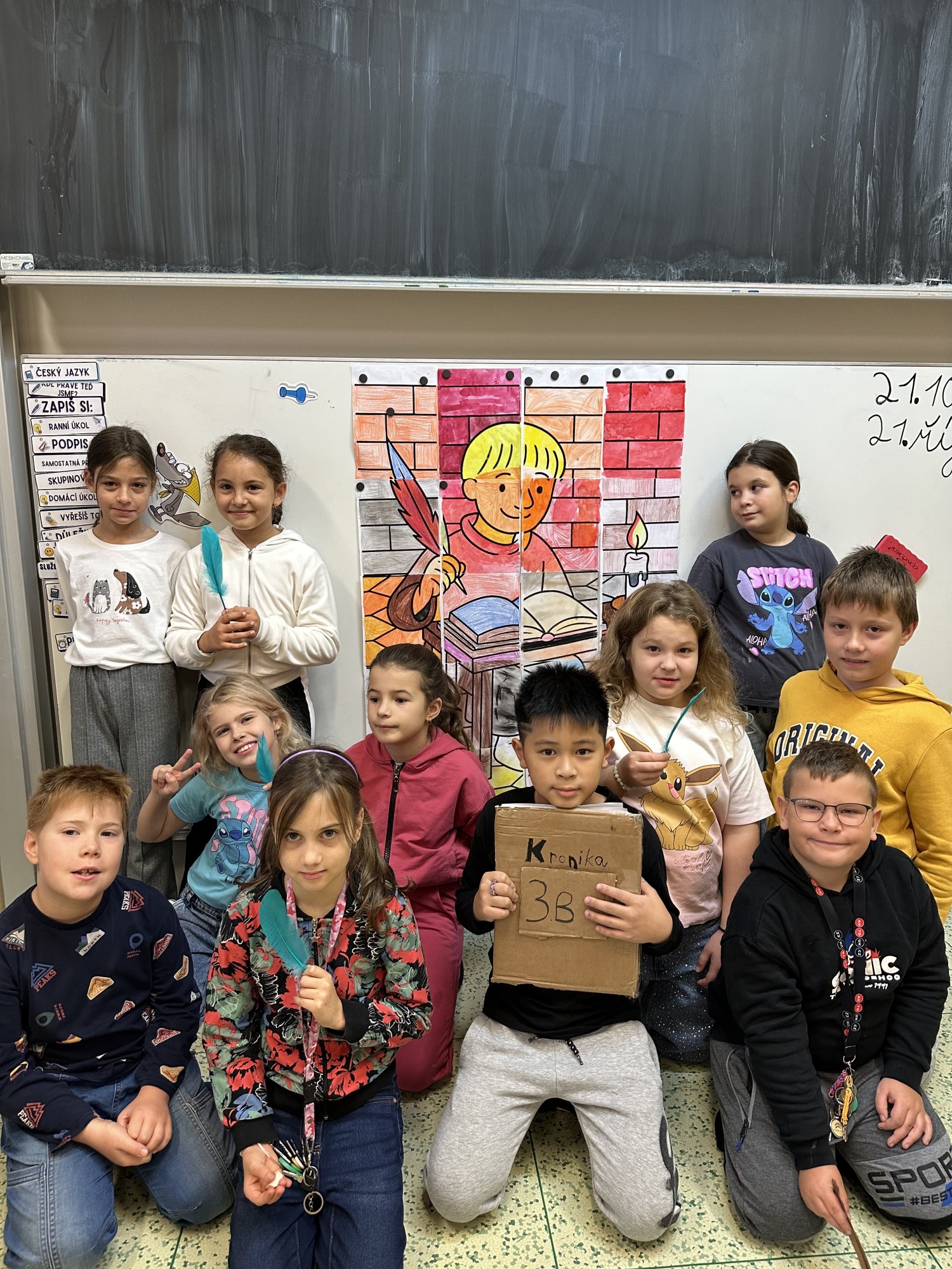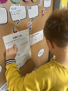 Pomocí šifry zjišťovali zajímavé informace o jeho životě, doplňovali chybějící slova, tvořili vlastní „Kroniku 3.B“ a společnými silami vytvořili velký kooperativní obraz Kosmase.