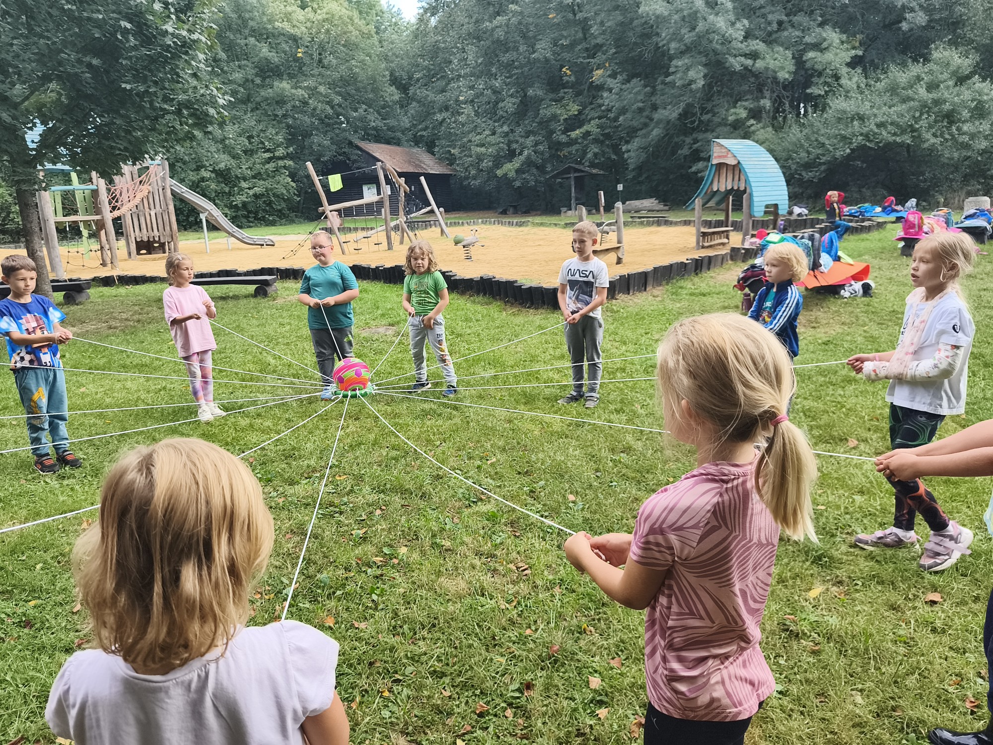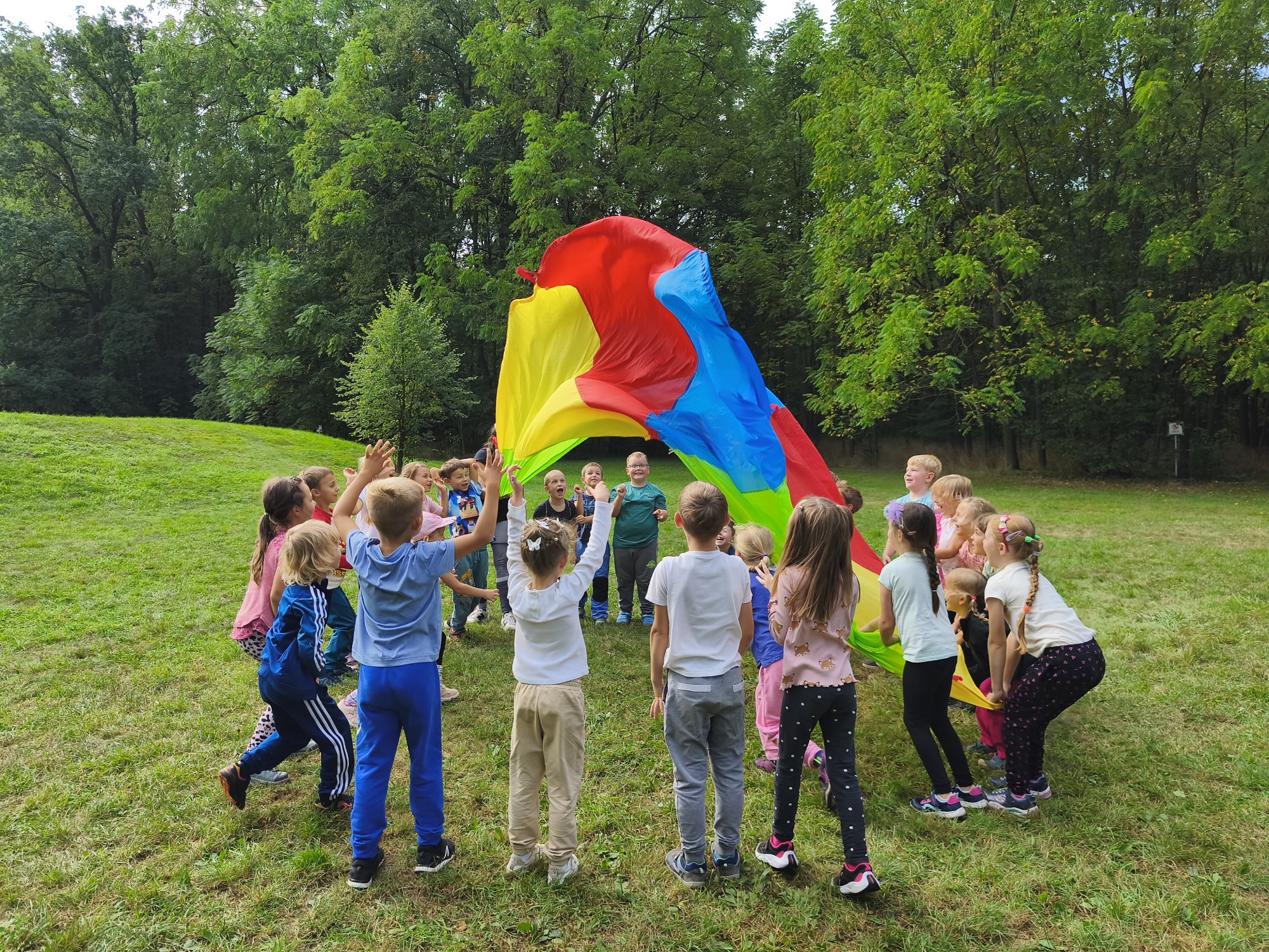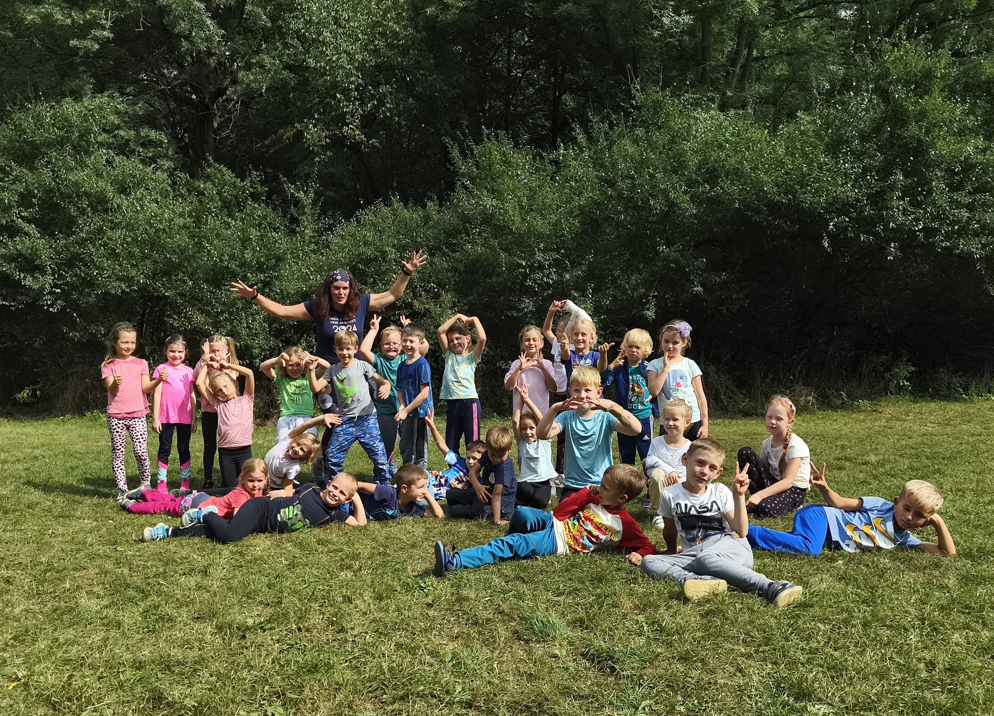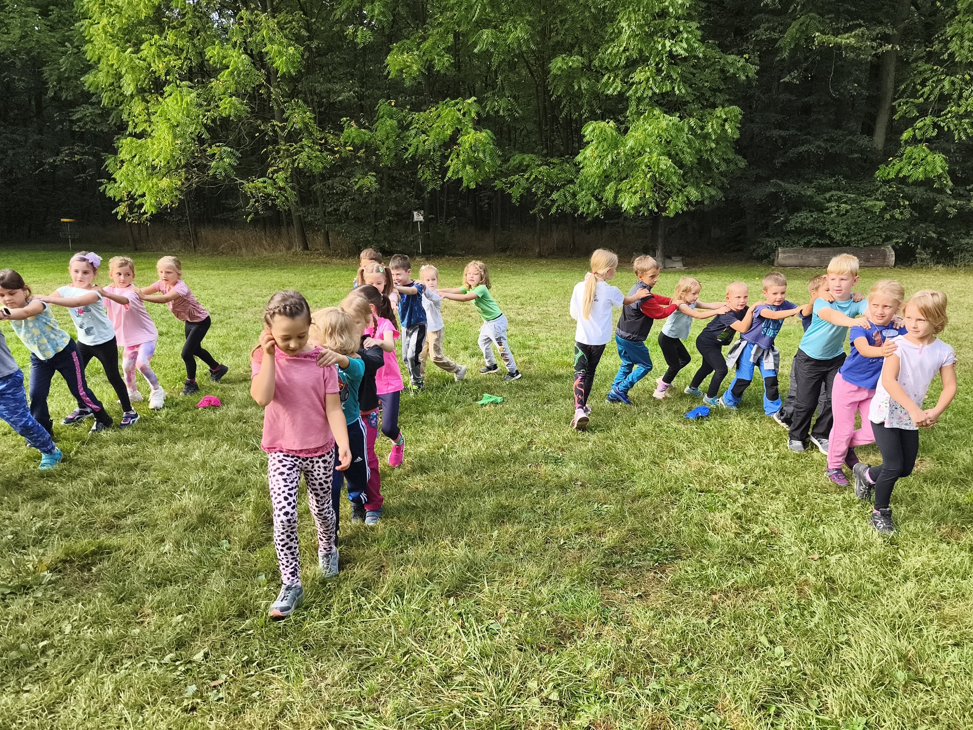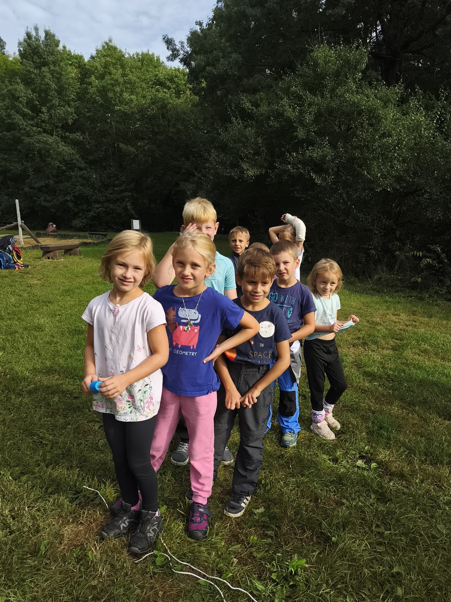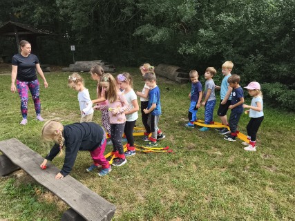 Paní psycholožka Vendula Slezáčková nám připravila pestrý program zaměřený na spolupráci, důvěru a týmového ducha. Nechyběla ani kruhová plachta, záchrana spolužáka, vajíčko na lžičce a další množství kreativních úkolů. Koordinaci a schopnost komunikace prověřil obyčejný míč, který děti musely společně vzít na procházku po Kunovském lese. Háček byl v tom, že ho musely přepravit pouze pomocí provázků. Za splněné úkoly následovala vždy odměna – odpočinek na dětském hřišti.