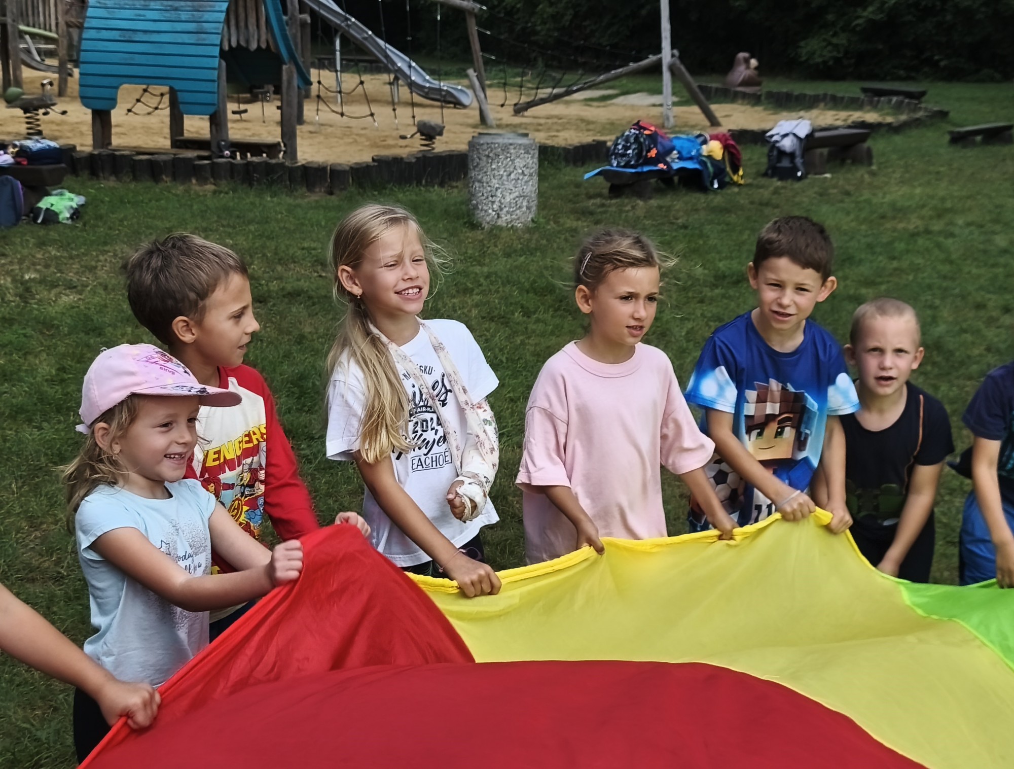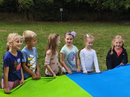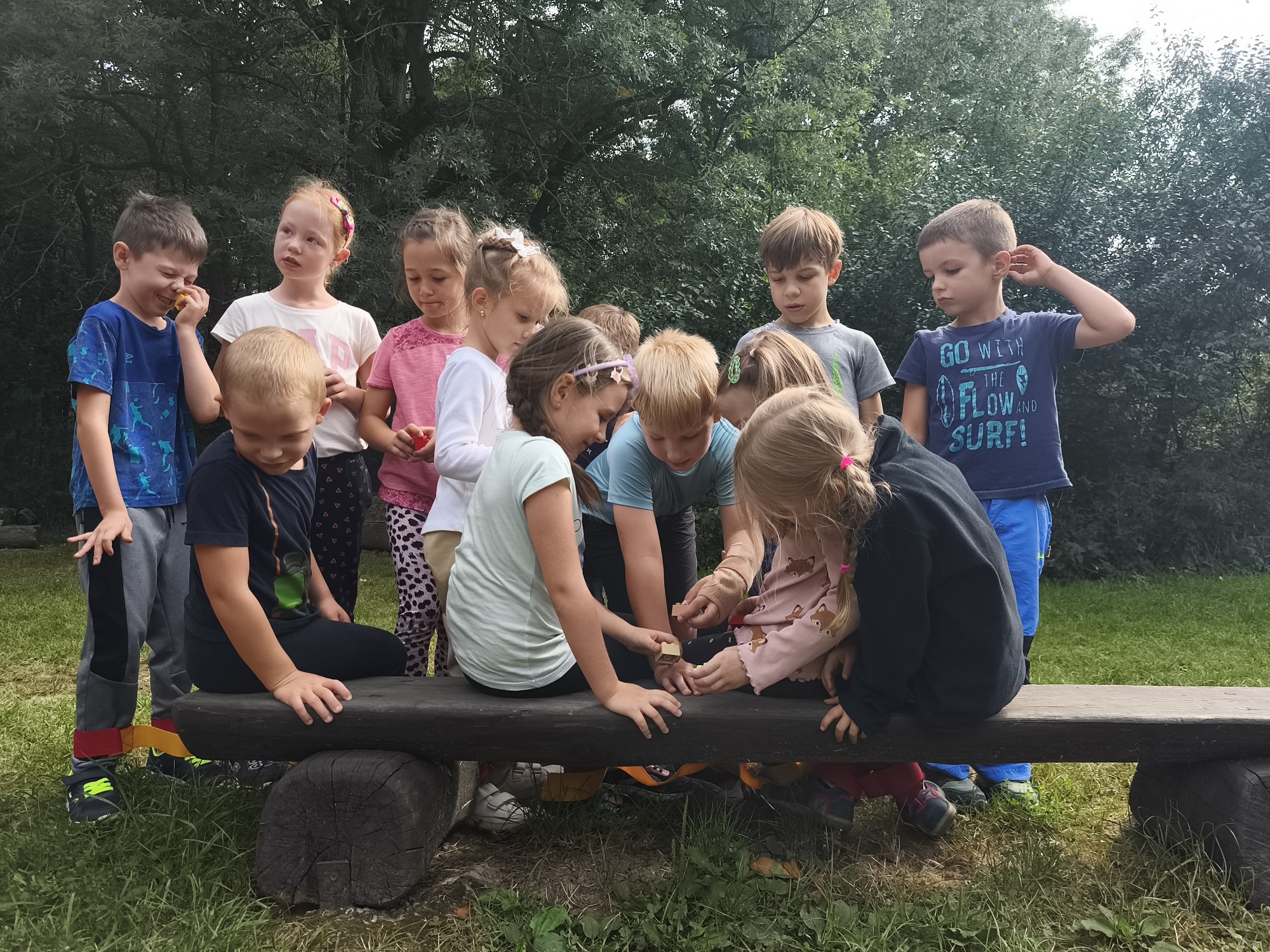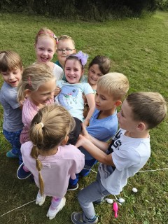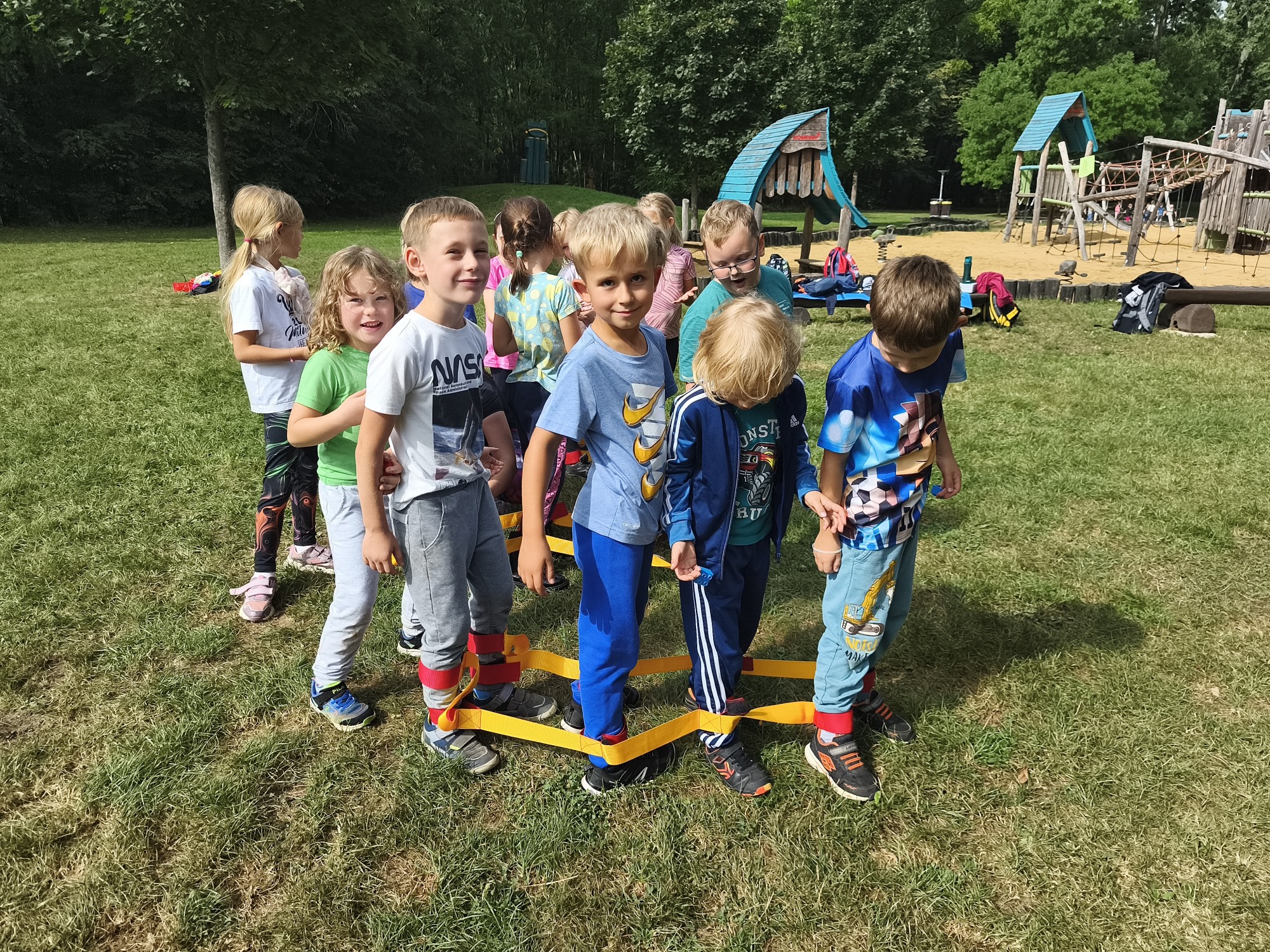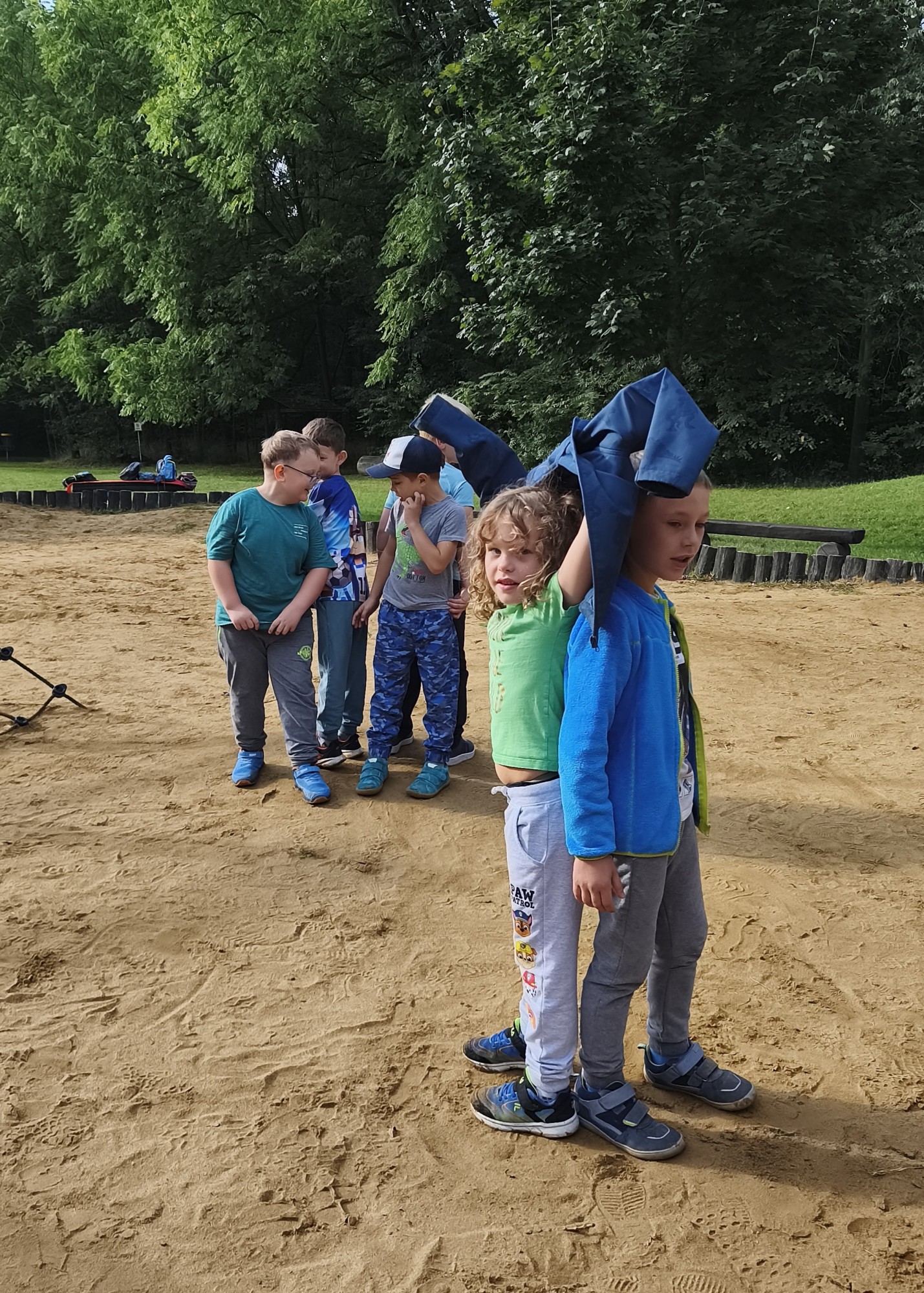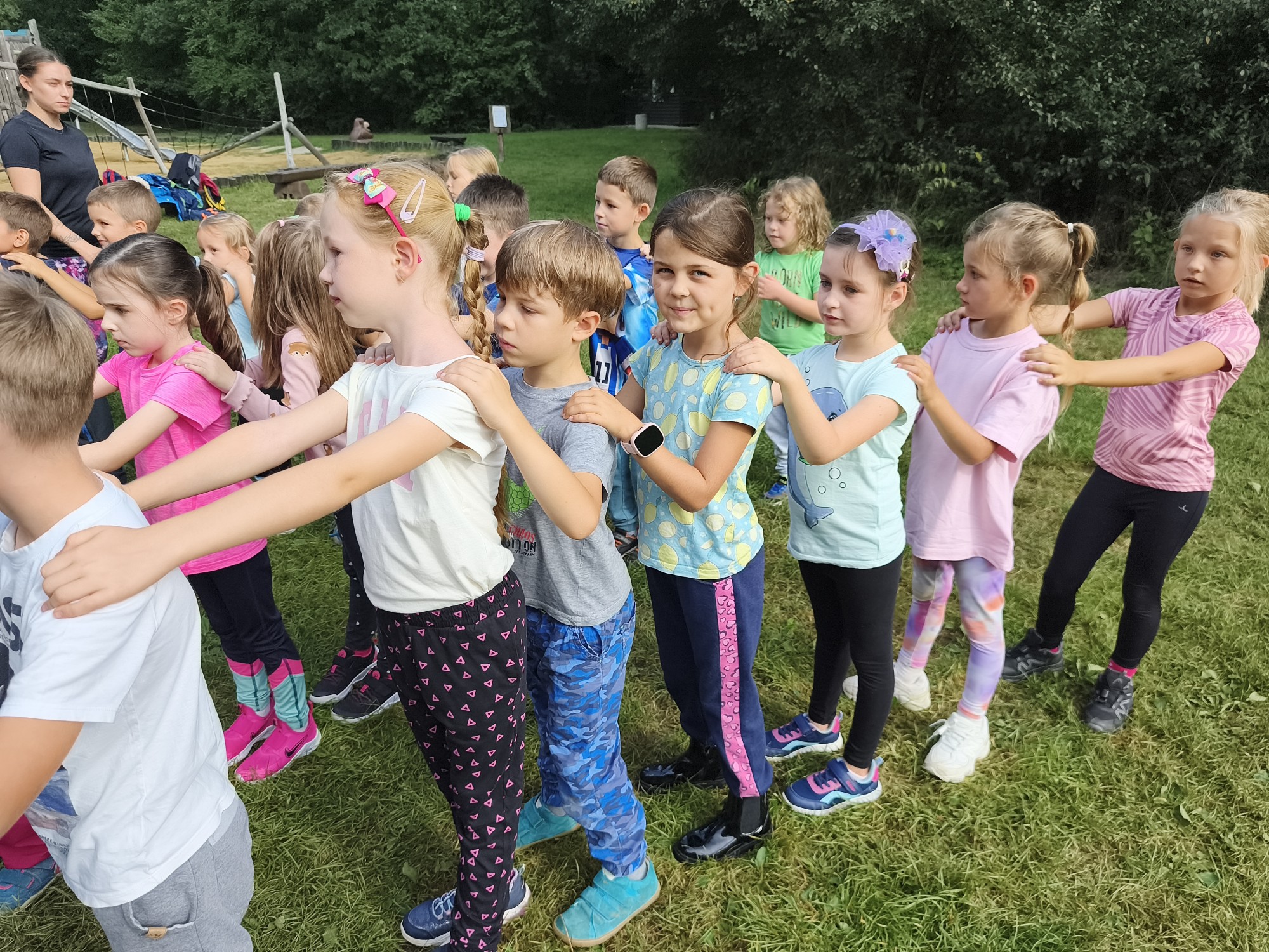 Paní psycholožka Vendula Slezáčková nám připravila pestrý program zaměřený na spolupráci, důvěru a týmového ducha. Nechyběla ani kruhová plachta, záchrana spolužáka, vajíčko na lžičce a další množství kreativních úkolů. Koordinaci a schopnost komunikace prověřil obyčejný míč, který děti musely společně vzít na procházku po Kunovském lese. Háček byl v tom, že ho musely přepravit pouze pomocí provázků. Za splněné úkoly následovala vždy odměna – odpočinek na dětském hřišti.