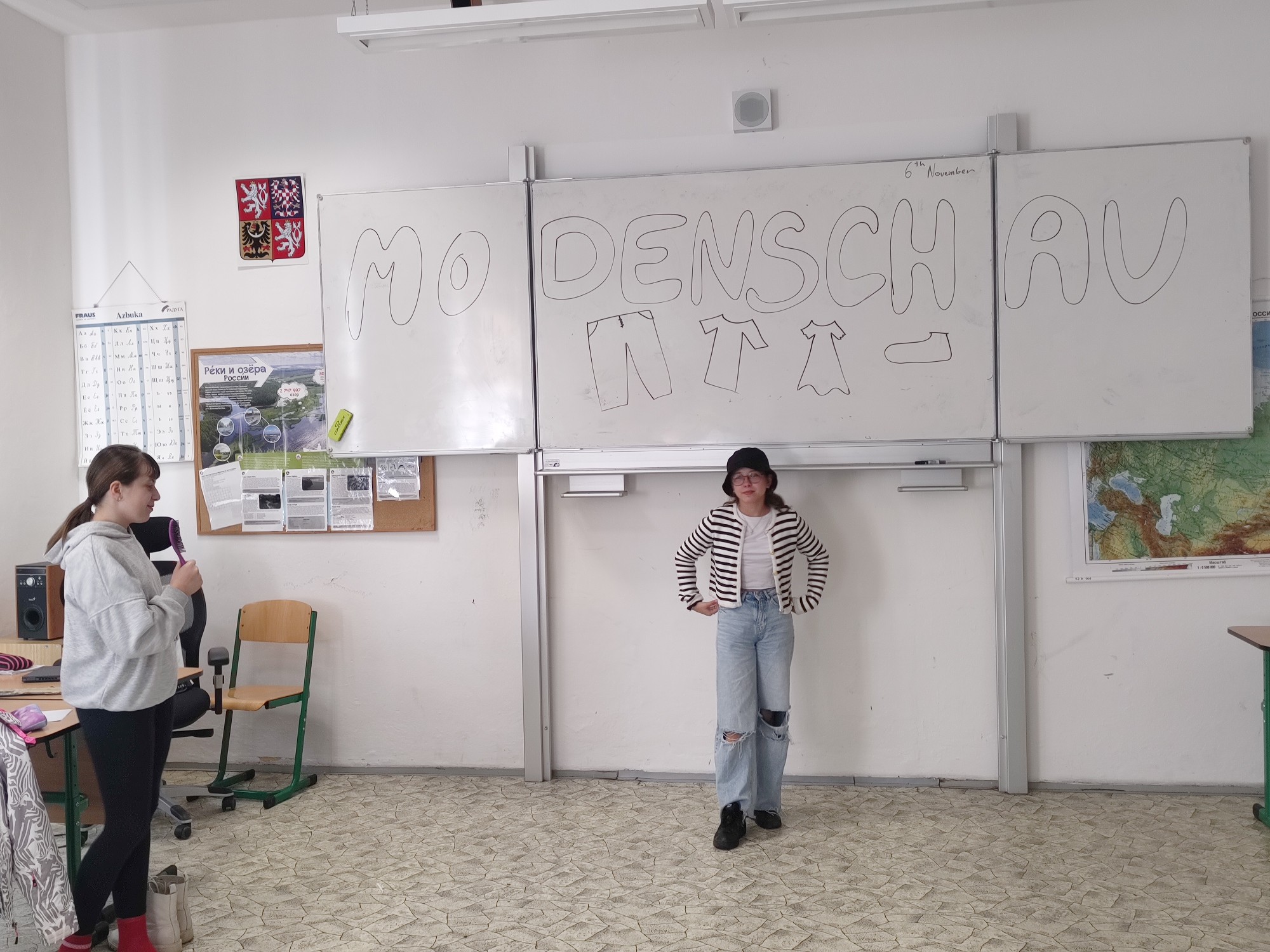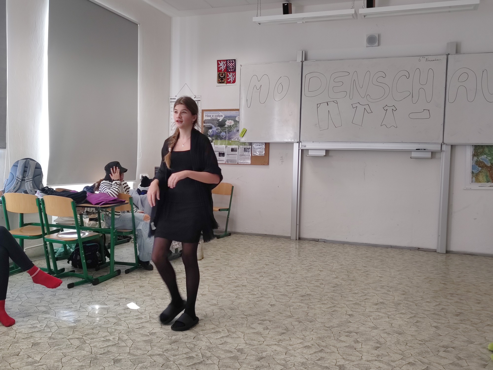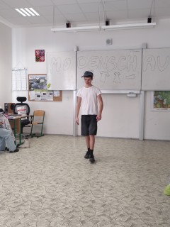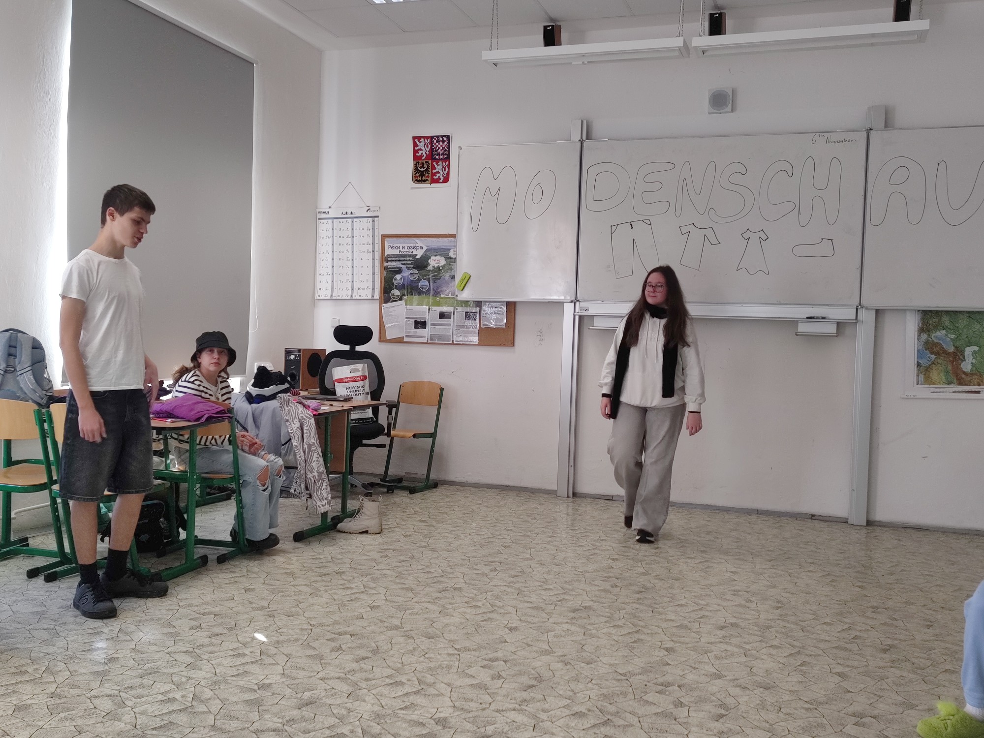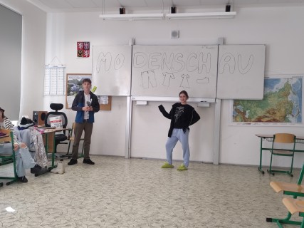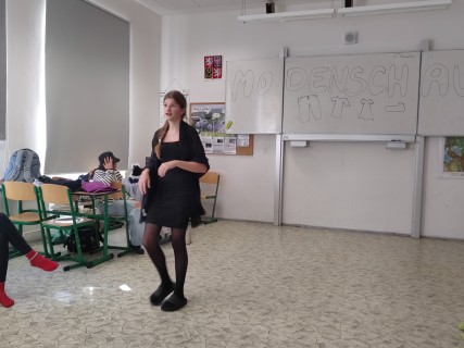Završením lekce v němčině s tématem In und out byla Modenschau - módní přehlídka, ve které žáci 8. ročníku zužitkovali své nově nabyté vědomosti. Nejenže si vyzkoušeli roli moderátora módní přehlídky, při které popisovali modely svých spolužáků, ale také se na chvíli vžili do role modela či modelky.