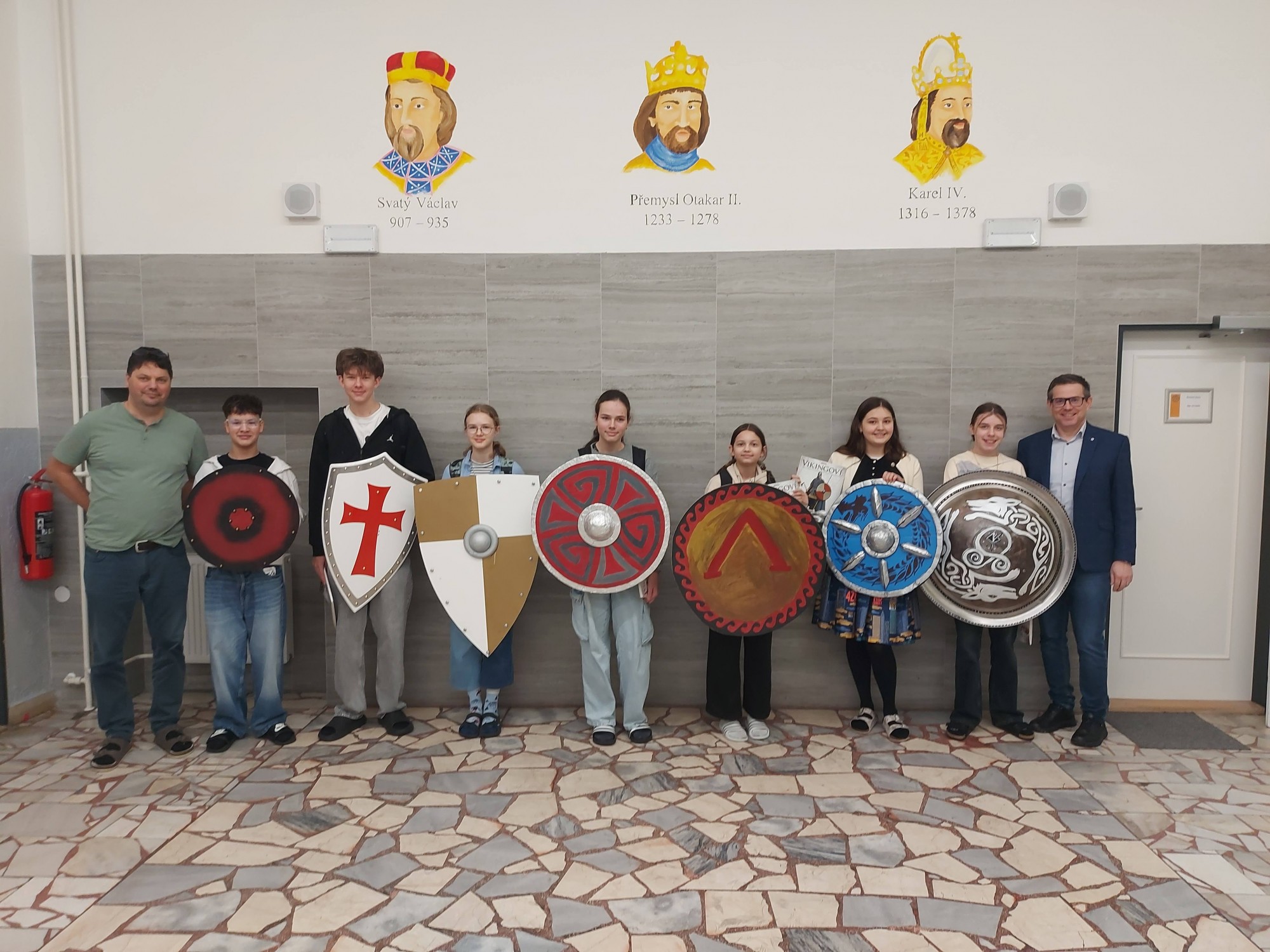 Žáci štíty vyráběli ze dřeva, kartonu i plechu.