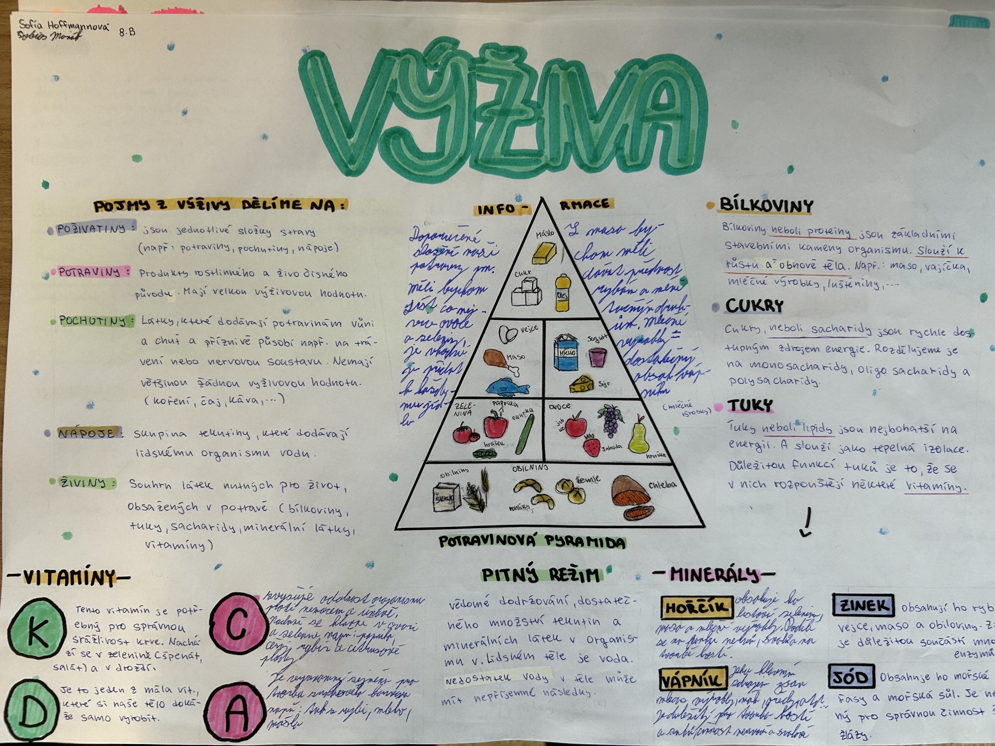 Žáci osmého ročníku se v rámci výuky věnovali tvorbě projektu zaměřeného na zdravou výživu a správné stravovací návyky. Pracovali s informacemi o složení potravin, vyváženém jídelníčku a významu zdravého stravování pro lidské tělo. Projekt vznikl také proto, že naše škola je zapojena do programu Zdravá školní jídelna, který podporuje zdravý životní styl a kvalitní stravování dětí.