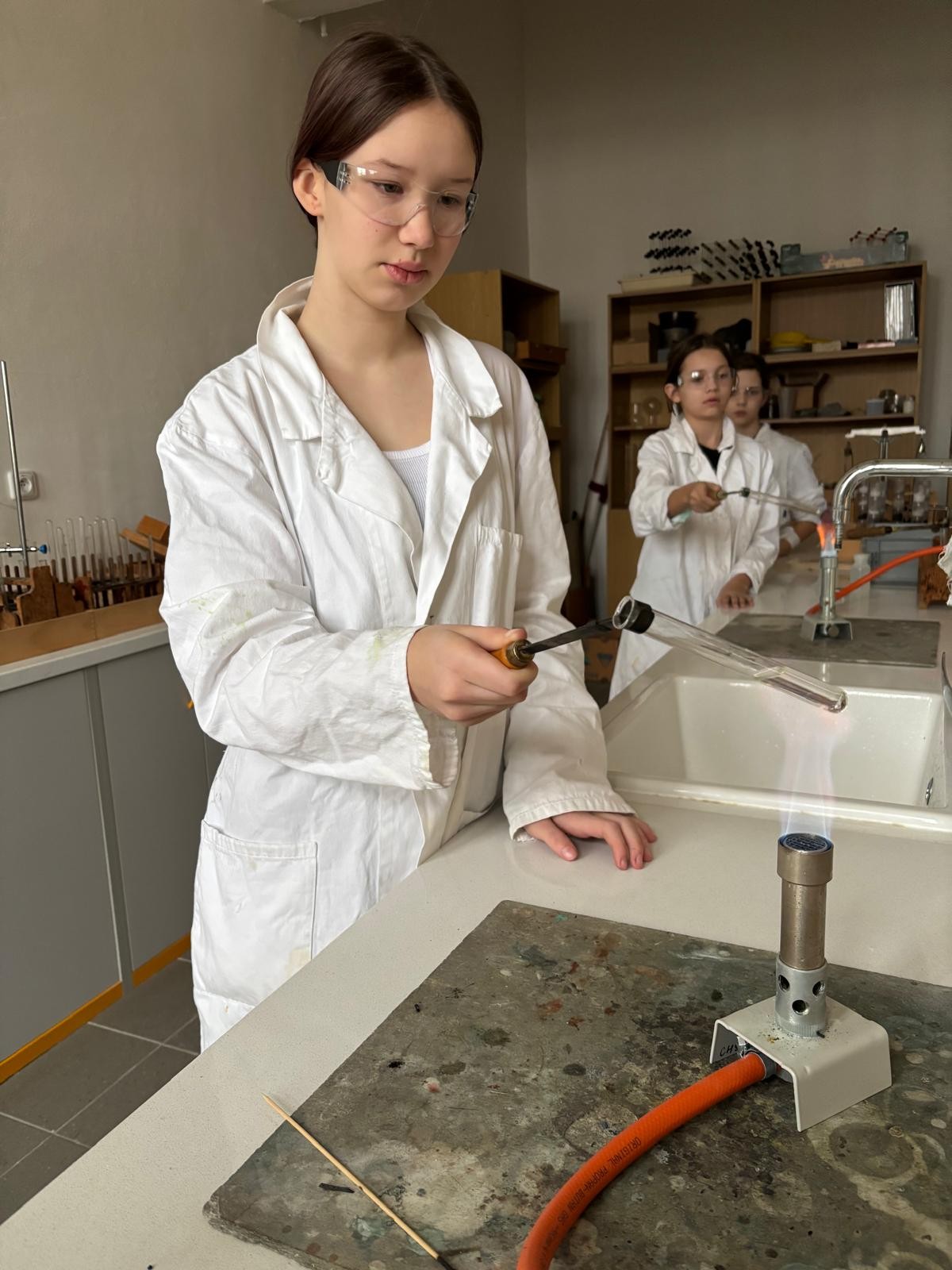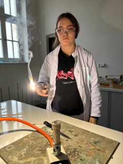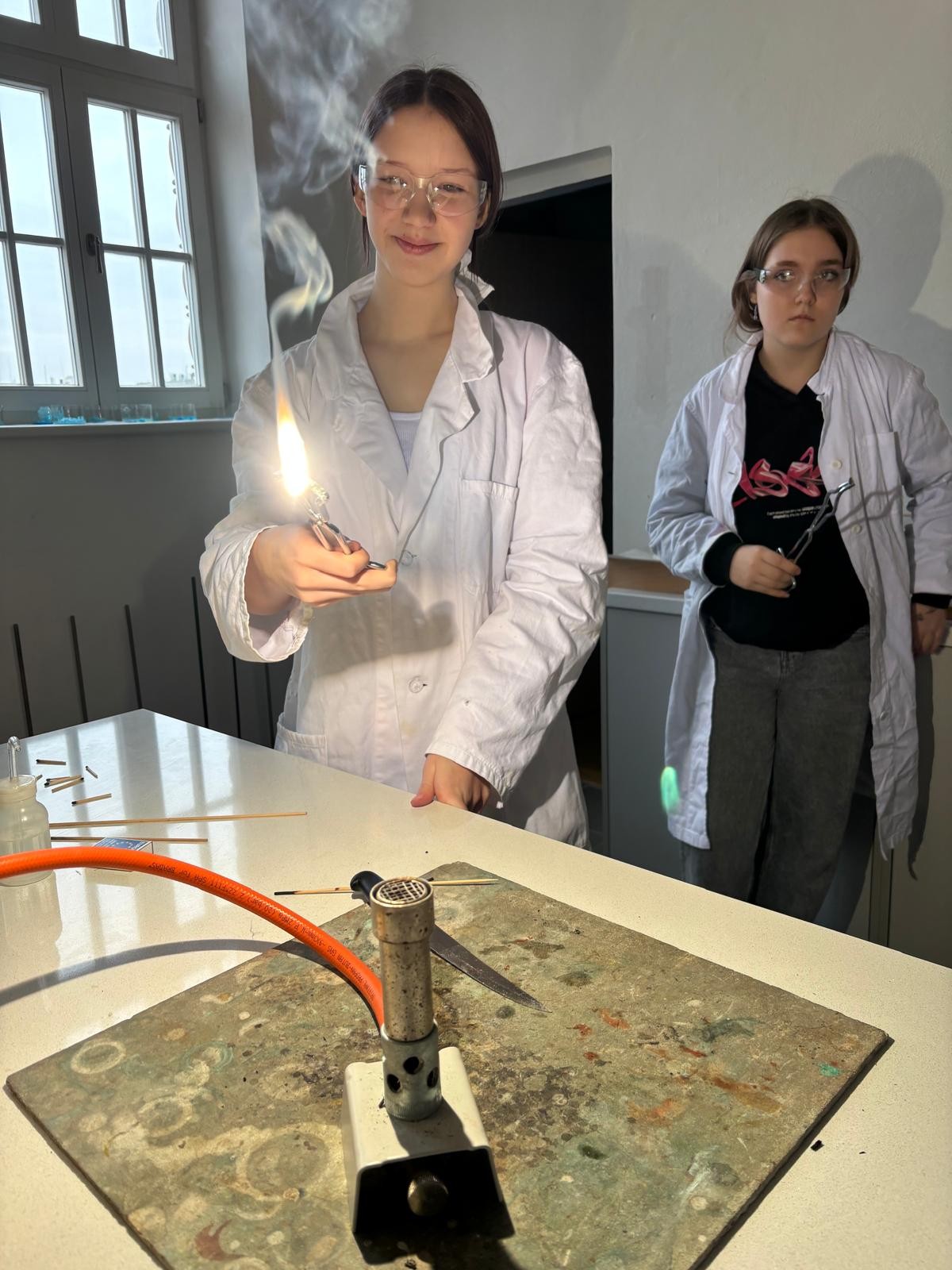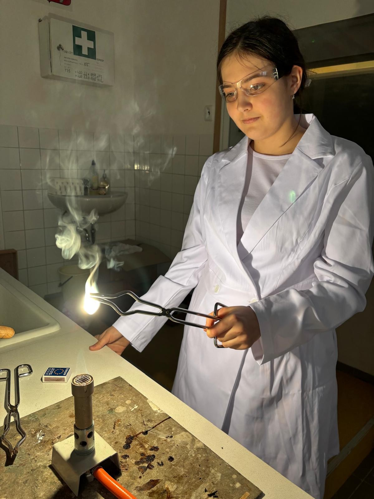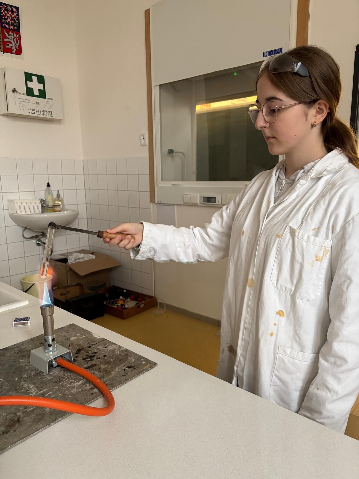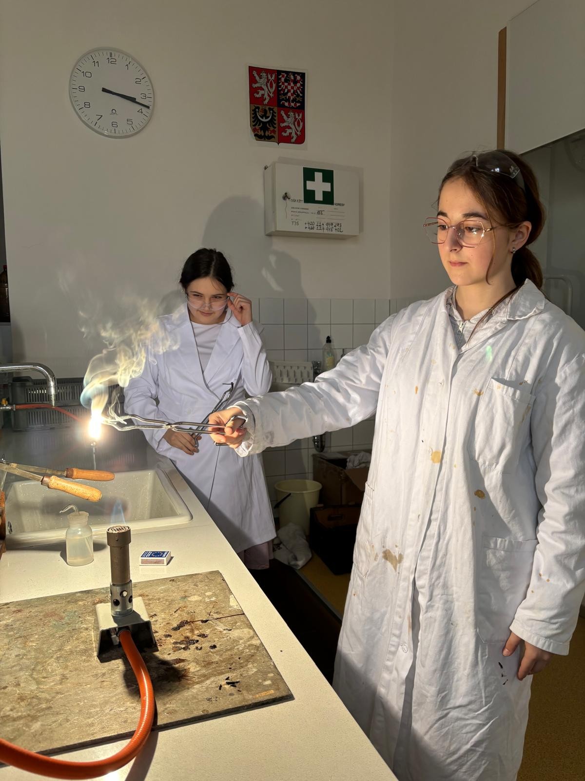 Při naší první schůzce jsme se naučili pracovat s plynovým kahanem, seznámili jsme se s postupem správného zahřívání látek nad plamenem a vyzkoušeli jsme si hoření hořčíku.