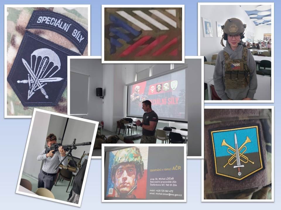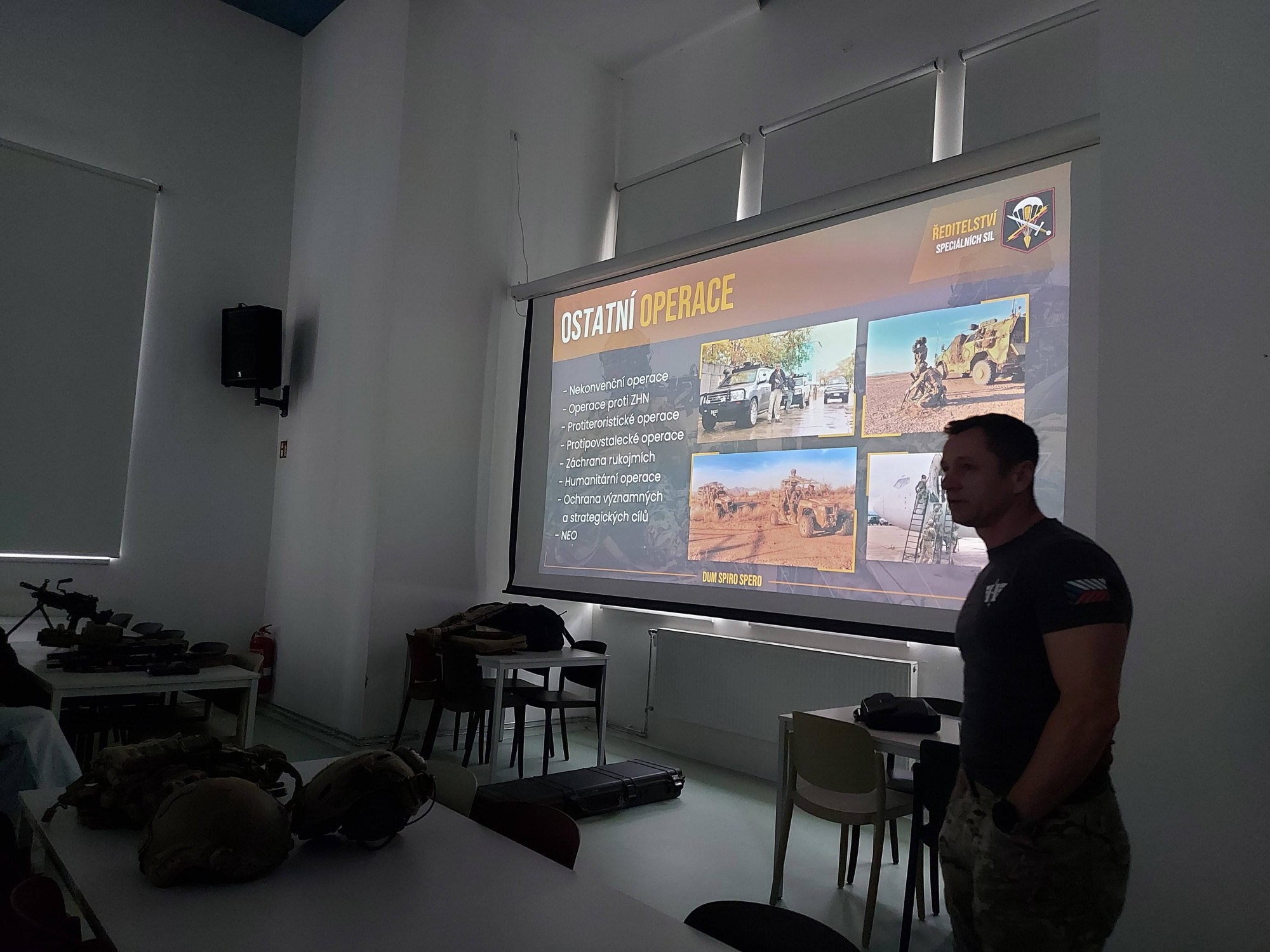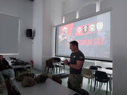 V úvodní části byli žáci detailně seznámeni se strukturou, činností, výzbrojí a výstrojí této elitní jednotky Armády České republiky, včetně informací o průběhu přijímacího řízení.