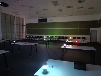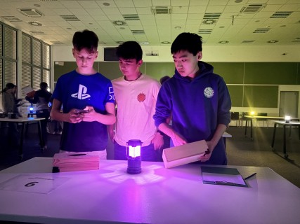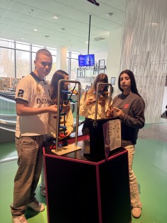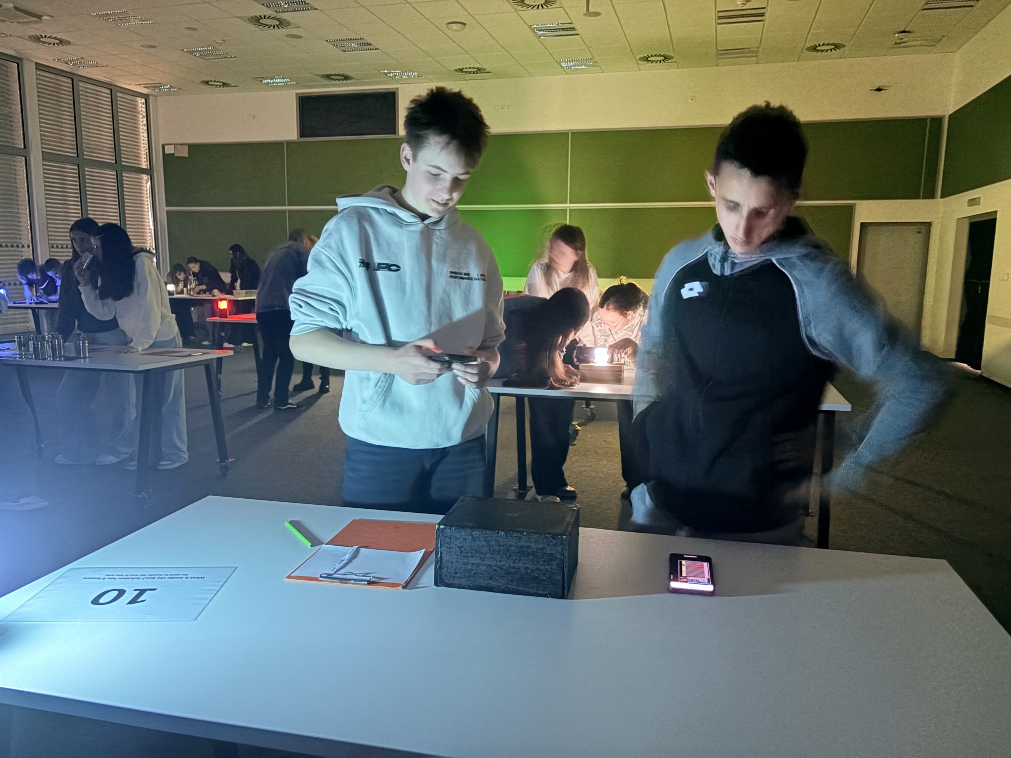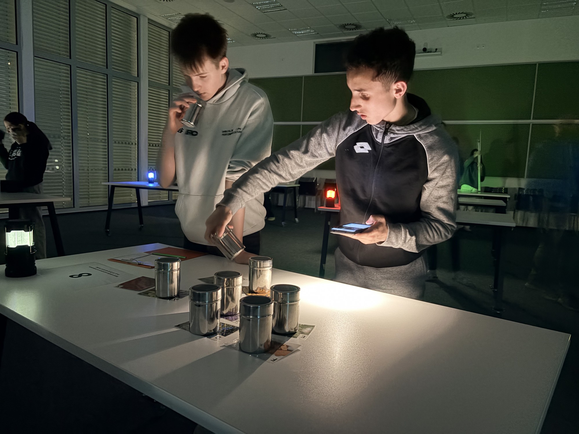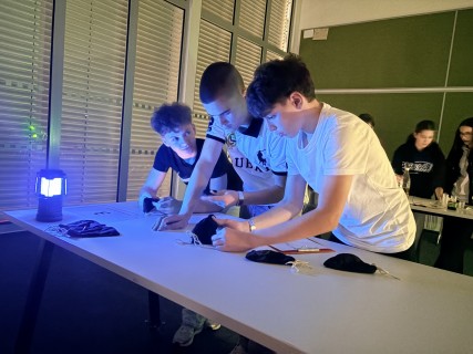 Zde na nás čekal objednaný výukový program – úniková hra v angličtině. Žáci se rozdělili do skupinek po třech a pustili se do řešení různorodých úkolů zaměřených na fyziku, chemii, logiku i smyslové vnímání. K zaznamenávání odpovědí využívali své mobilní telefony. Každá skupina musela vyřešit alespoň 10 z celkových 13 úkolů, aby mohla „uniknout“. Všichni se do aktivity zapojili s velkým nadšením a spolupráce mezi českými a španělskými žáky fungovala skvěle.