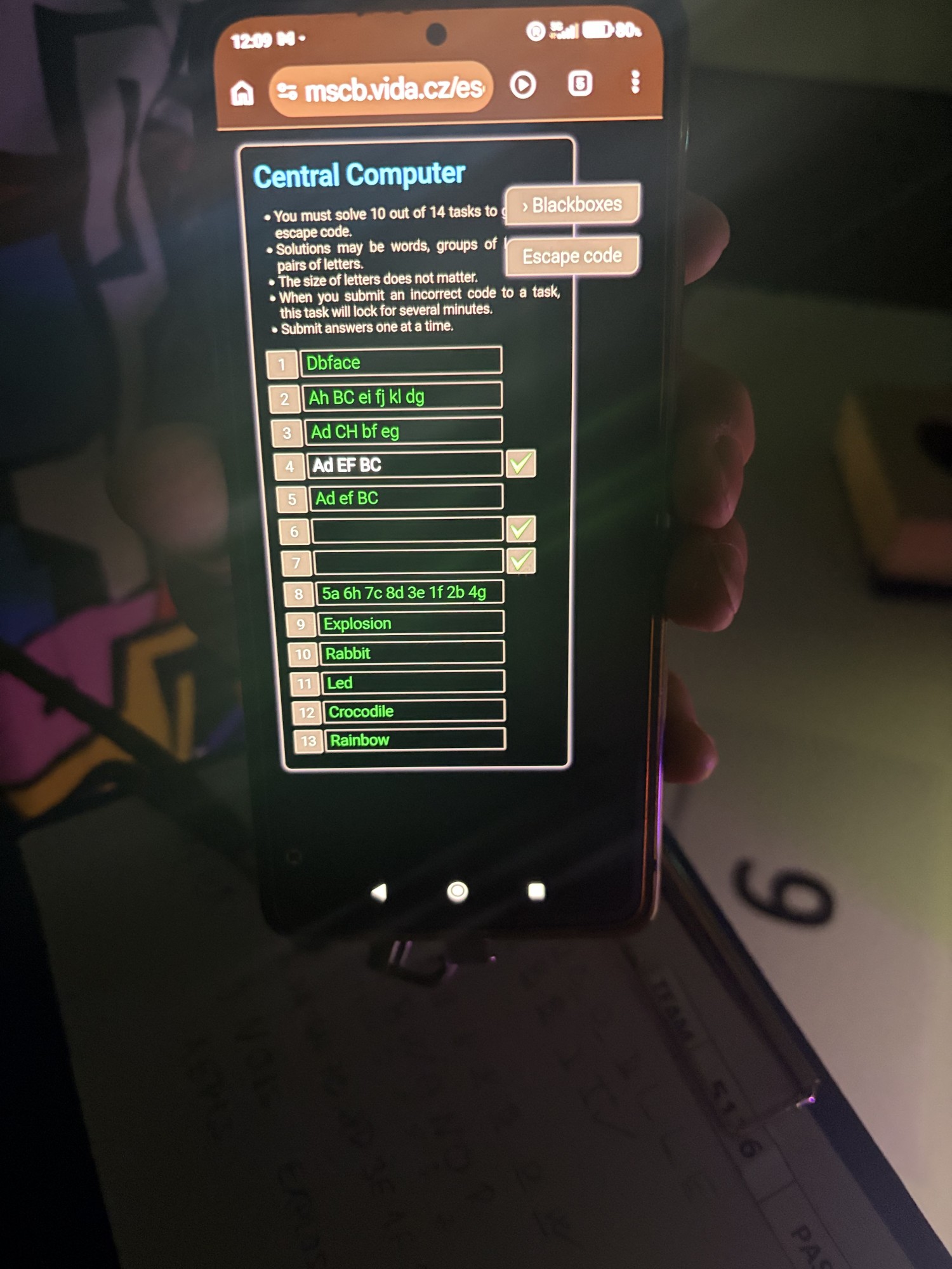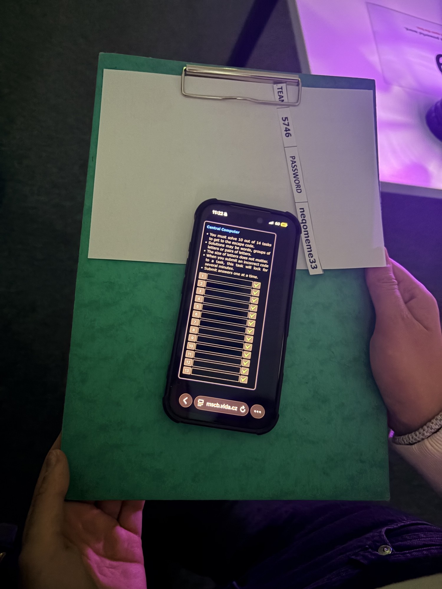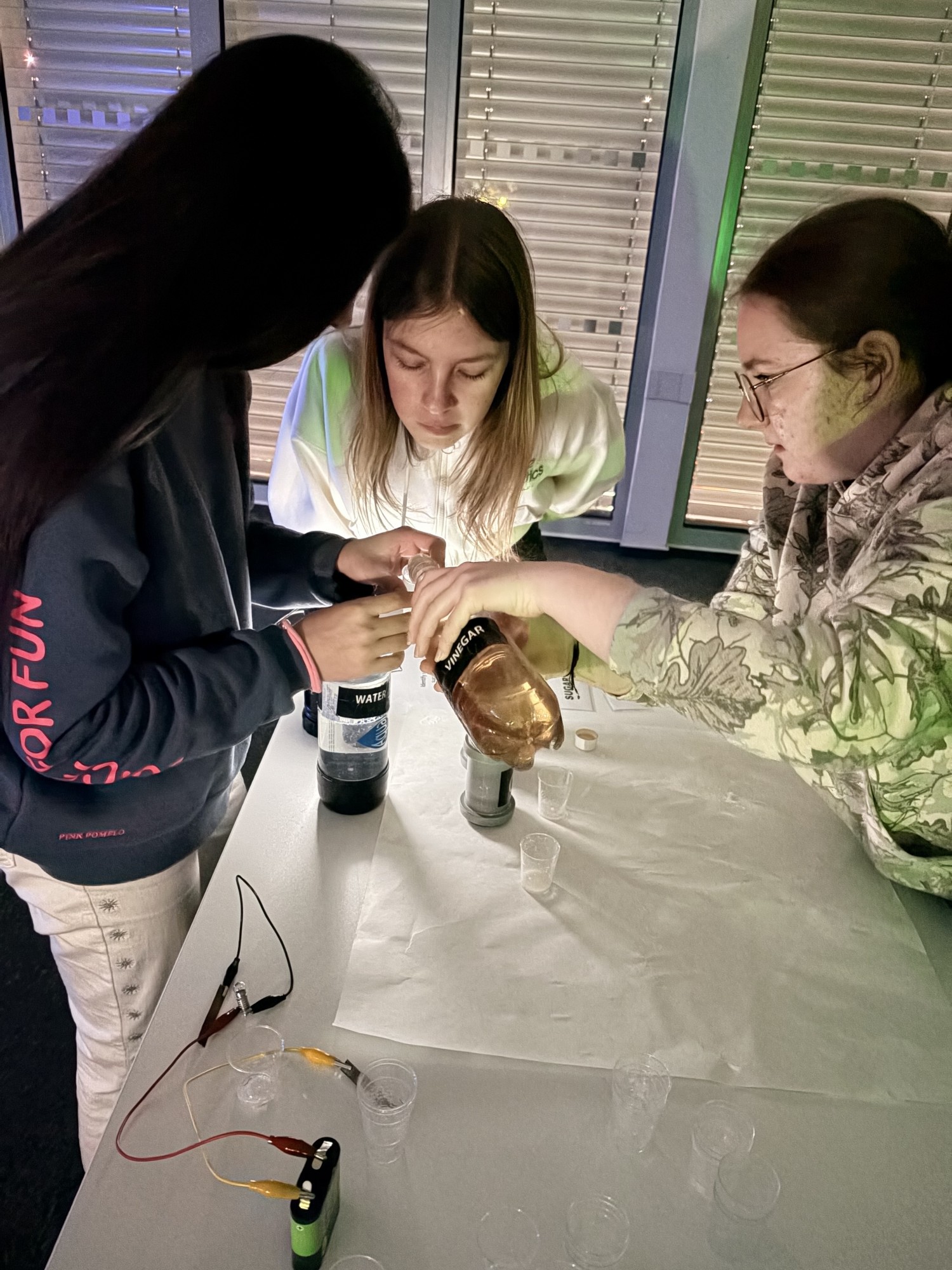 Zde na nás čekal objednaný výukový program – úniková hra v angličtině. Žáci se rozdělili do skupinek po třech a pustili se do řešení různorodých úkolů zaměřených na fyziku, chemii, logiku i smyslové vnímání. K zaznamenávání odpovědí využívali své mobilní telefony. Každá skupina musela vyřešit alespoň 10 z celkových 13 úkolů, aby mohla „uniknout“. Všichni se do aktivity zapojili s velkým nadšením a spolupráce mezi českými a španělskými žáky fungovala skvěle.