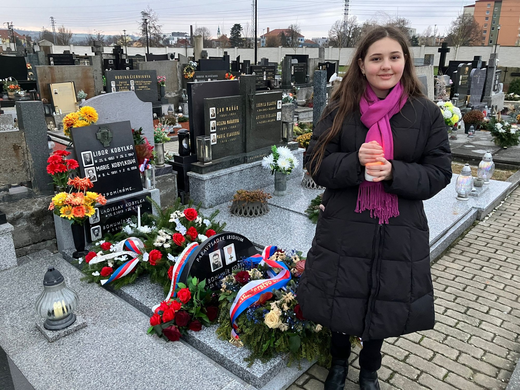 Anastázie Bartošová ze 7.B uctila památku československého vojáka a člena výsadku Iridium Bohumíra Kobylky zapálením svíčky na hřbitově ve Starém Městě.
