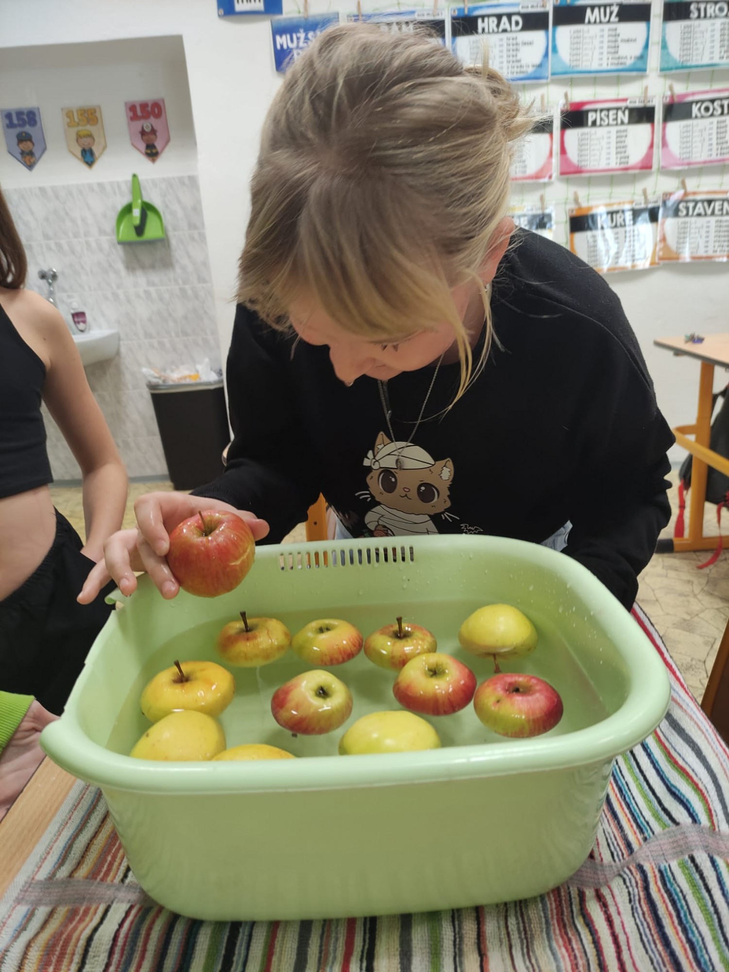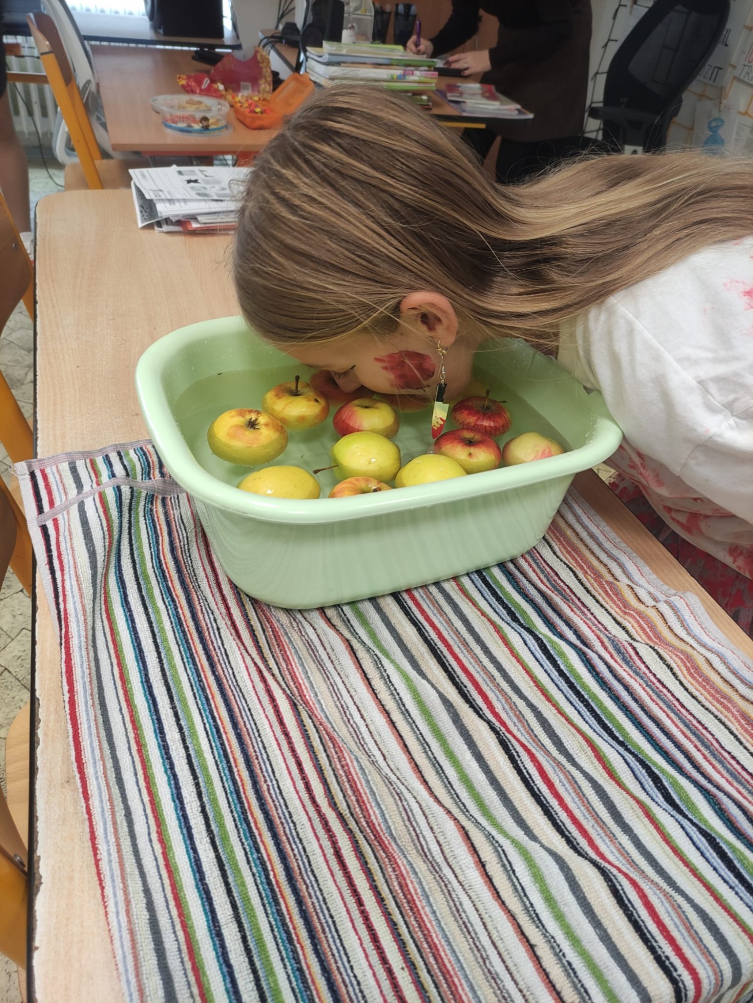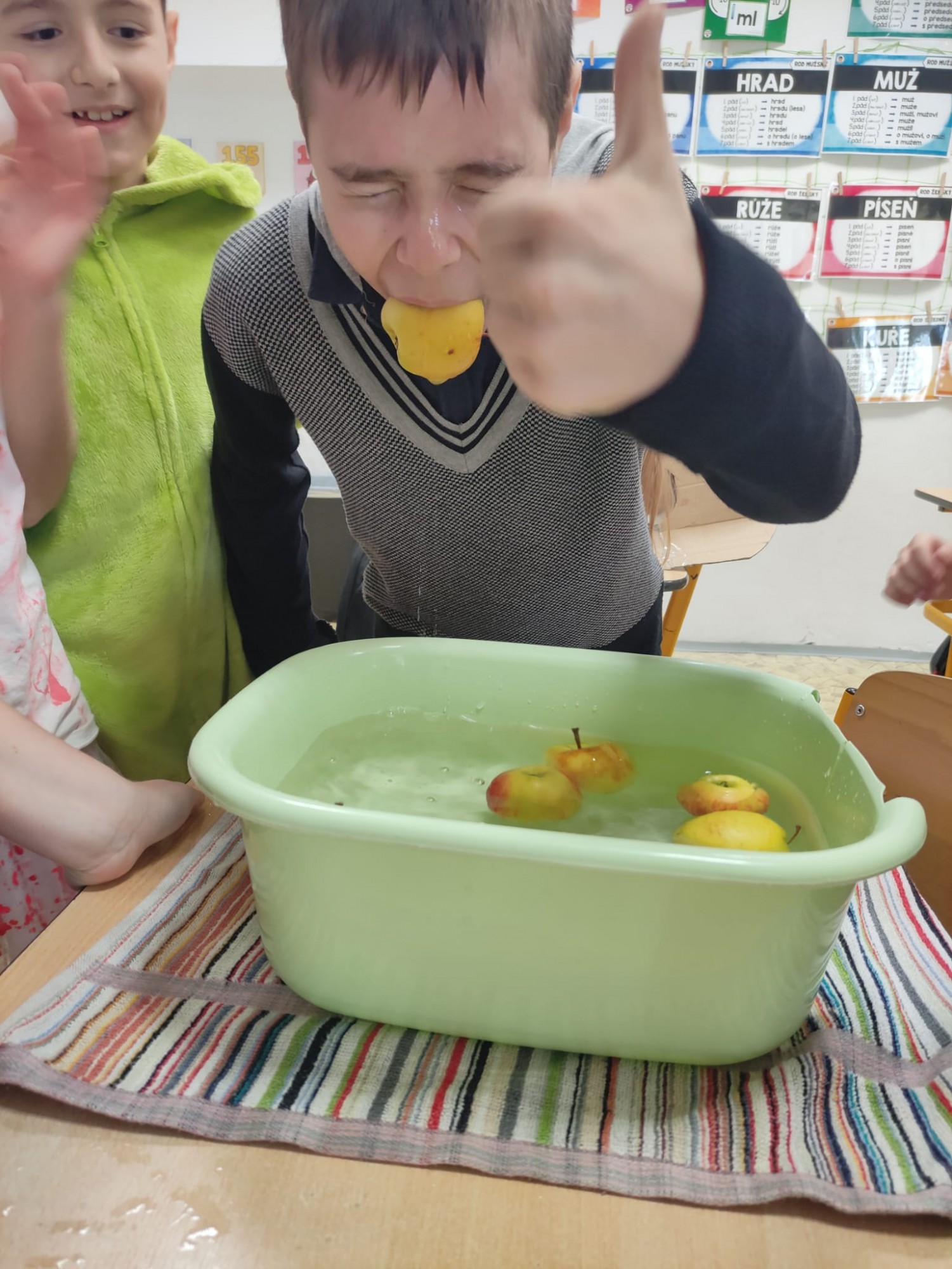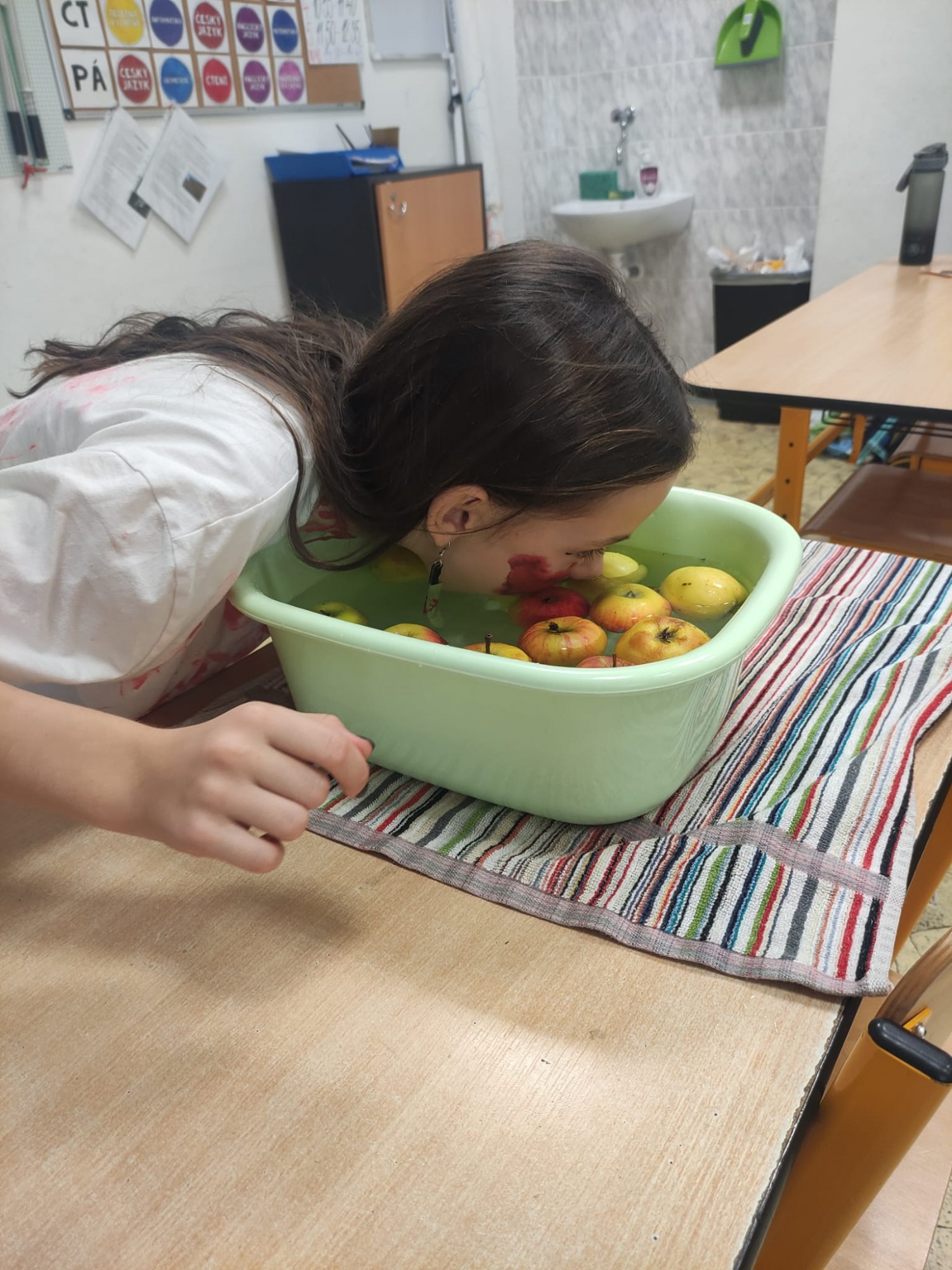 Tato hra má dlouhou tradici v Británii i v USA a spočívá v tom, že se jablka plovoucí v misce s vodou snaží chytit pouze pomocí zubů – bez pomoci rukou. Děti se do soutěže pustily s obrovským nadšením a smíchem. I když to někdy nebylo úplně jednoduché, nakonec se všem podařilo alespoň jedno jablíčko ulovit.
