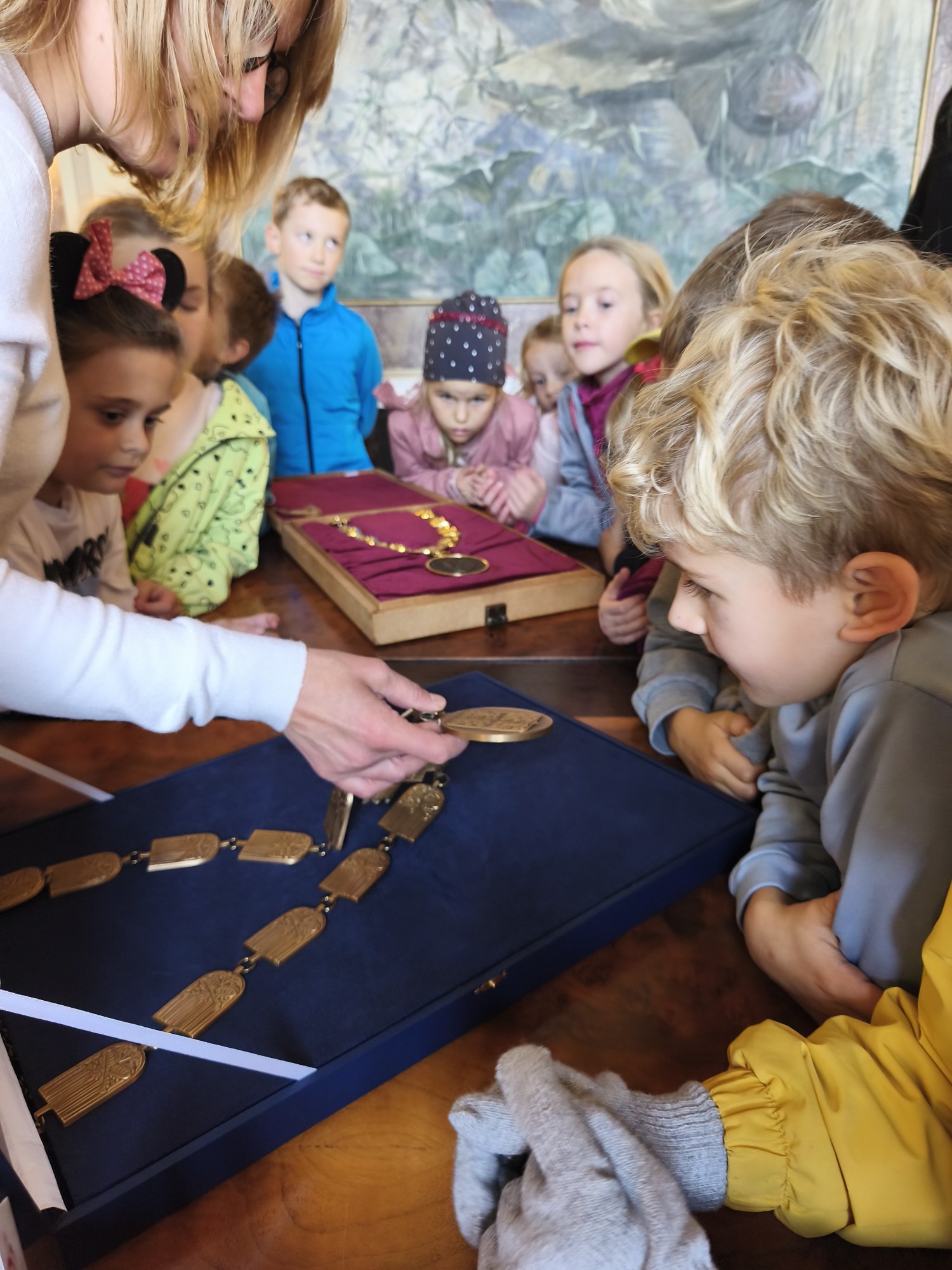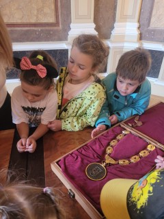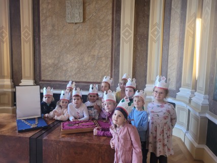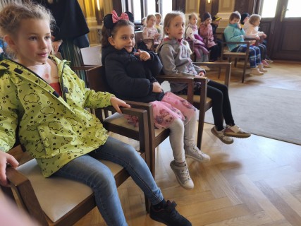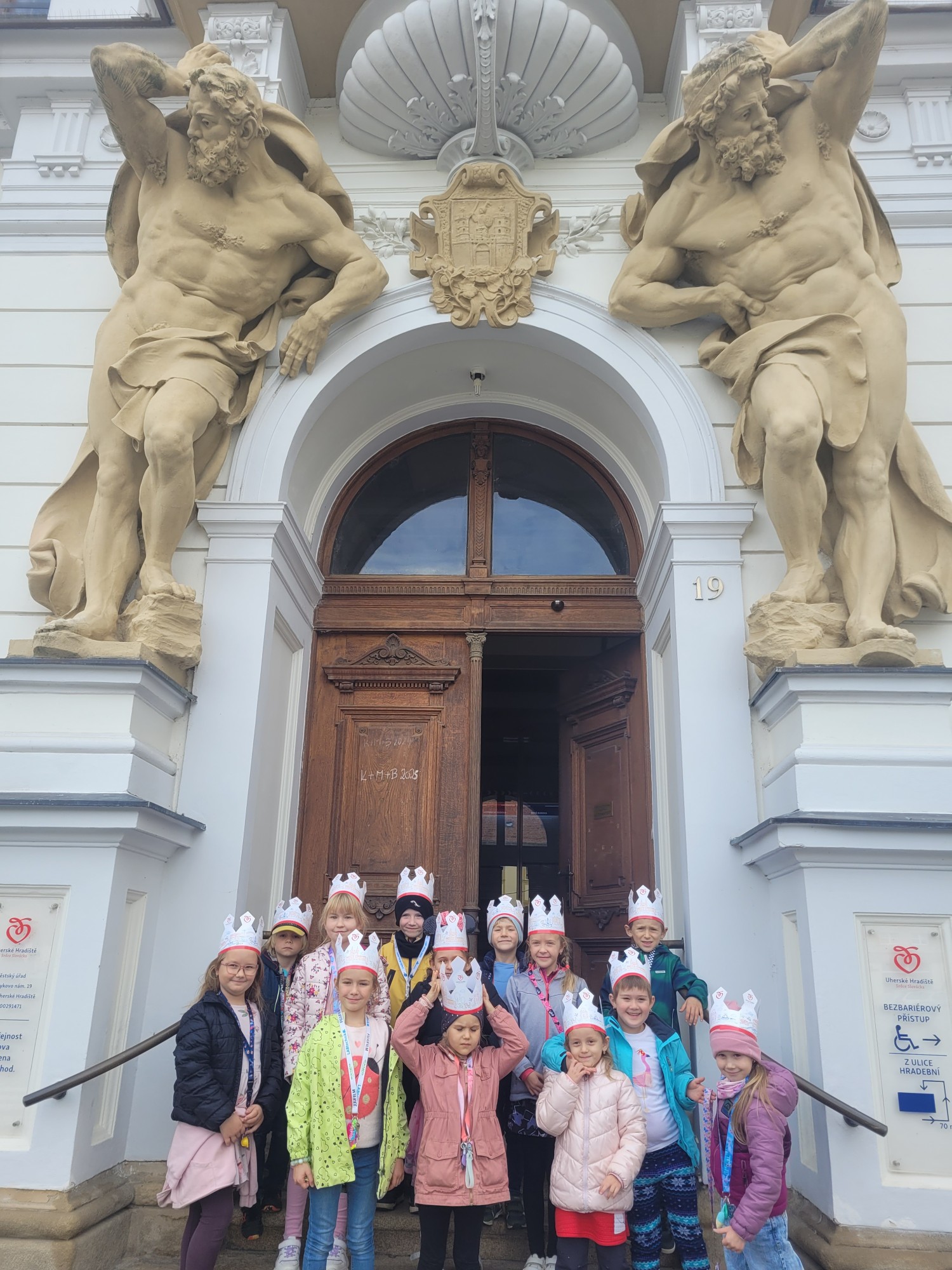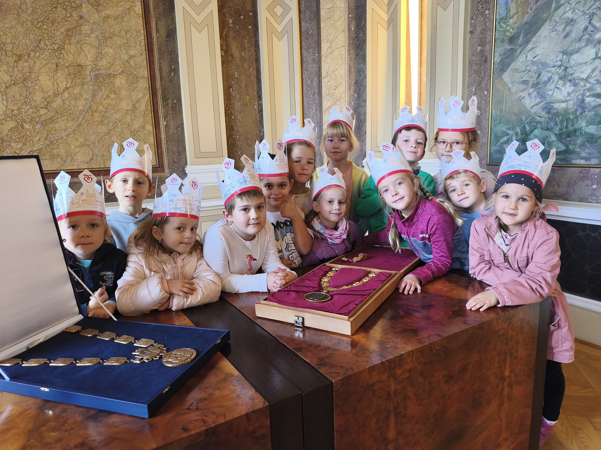 V úterý 14. října se naši prvňáčci z badatelského kroužku vydali na exkurzi do obřadní síně městského úřadu v Uherském Hradišti. Děti se dozvěděly, k čemu obřadní síň slouží a jaké slavnostní události se v ní konají. Poutavě poslouchaly o vítání občánků, svatbách i slavnostním předávání maturitních vysvědčení. Děti si mohly prohlédnout slavnostní stůl, státní znak i starostenský řetěz. Exkurze byla nejen poučná, ale i velmi příjemná. Děti odcházely s úsměvem a novými zážitky. Děkujeme paní Bc. Veronice Šarátkové za milé přijetí a trpělivé odpovědi.