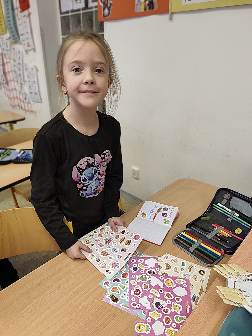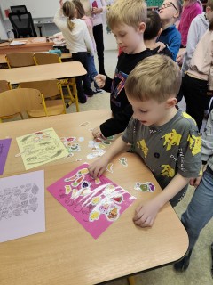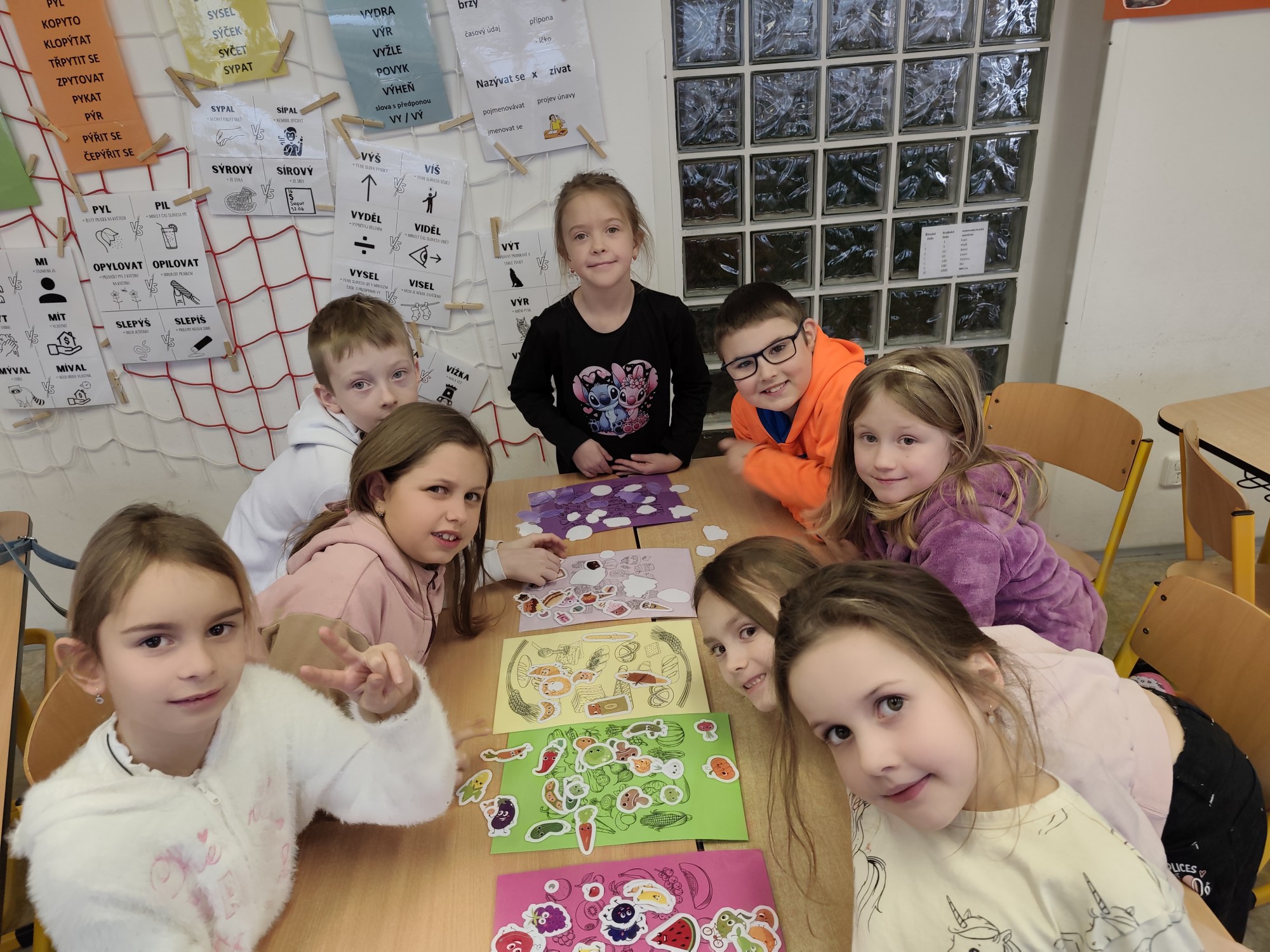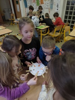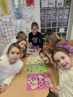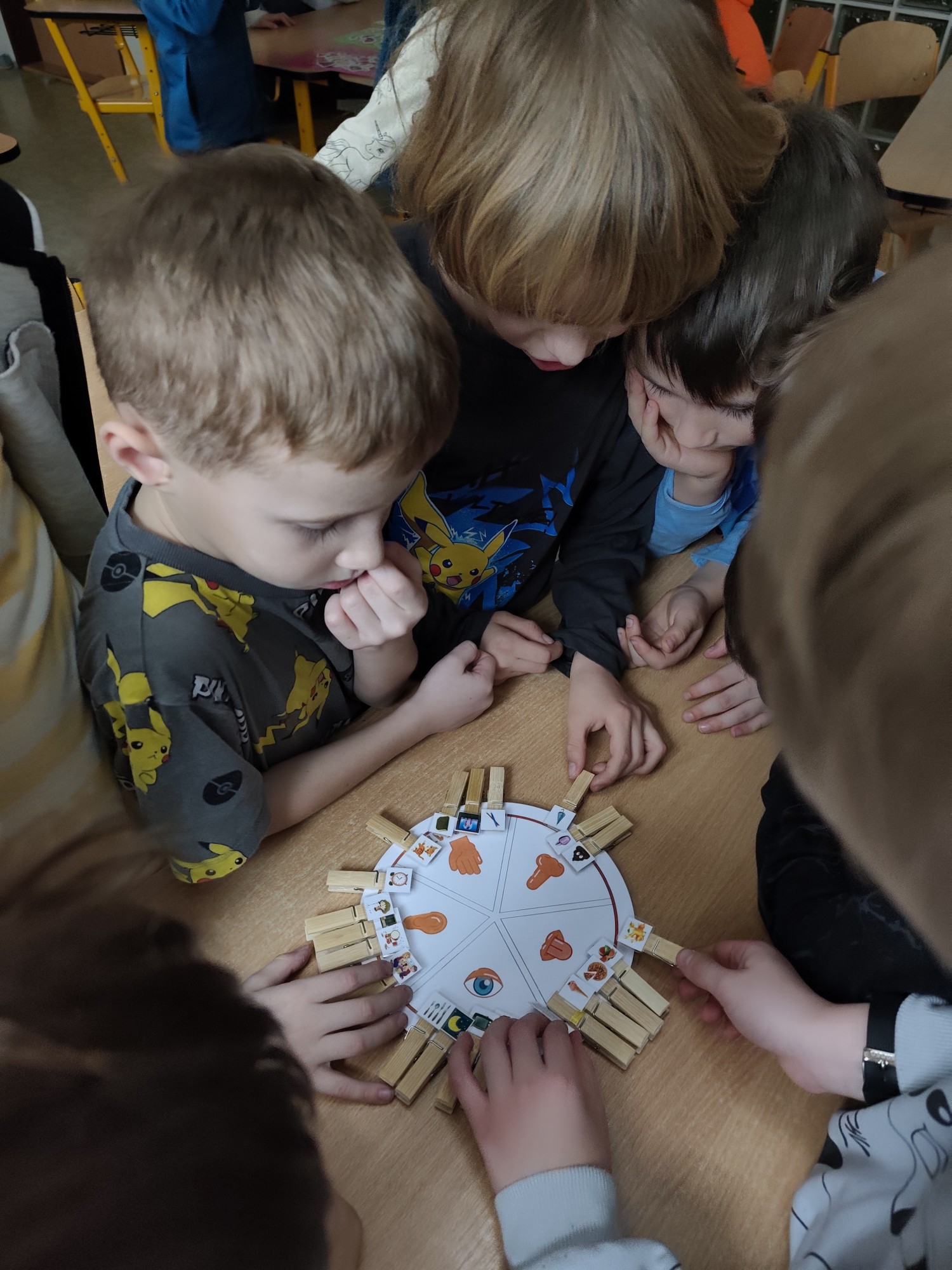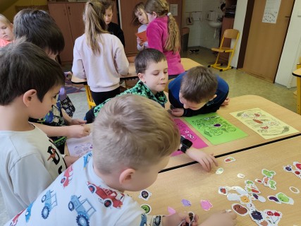 Následovala kolíčkovaná hra na smysly, při které děti podle obrázků určovaly, která činnost patří ke kterému smyslu. Aktivita podporovala spolupráci, logické myšlení i pozornost. Poté děti třídily obrázky potravin na zdravé a nezdravé, čímž si upevnily znalosti o správném stravování.
