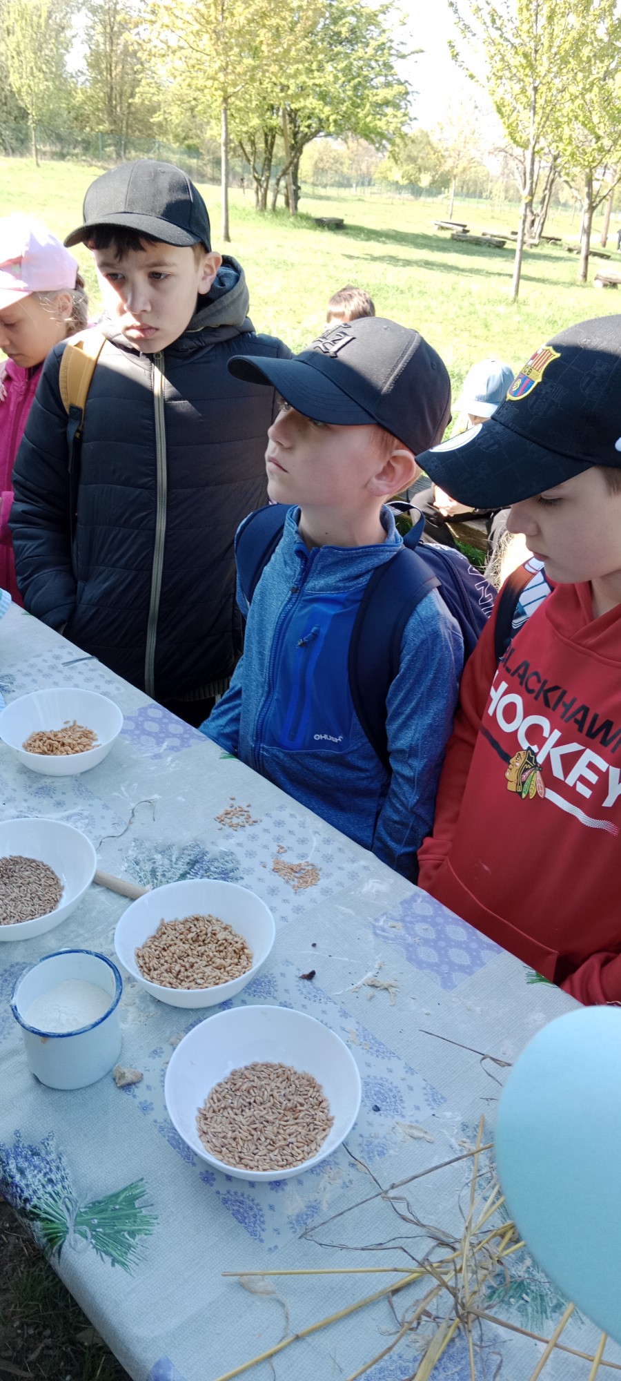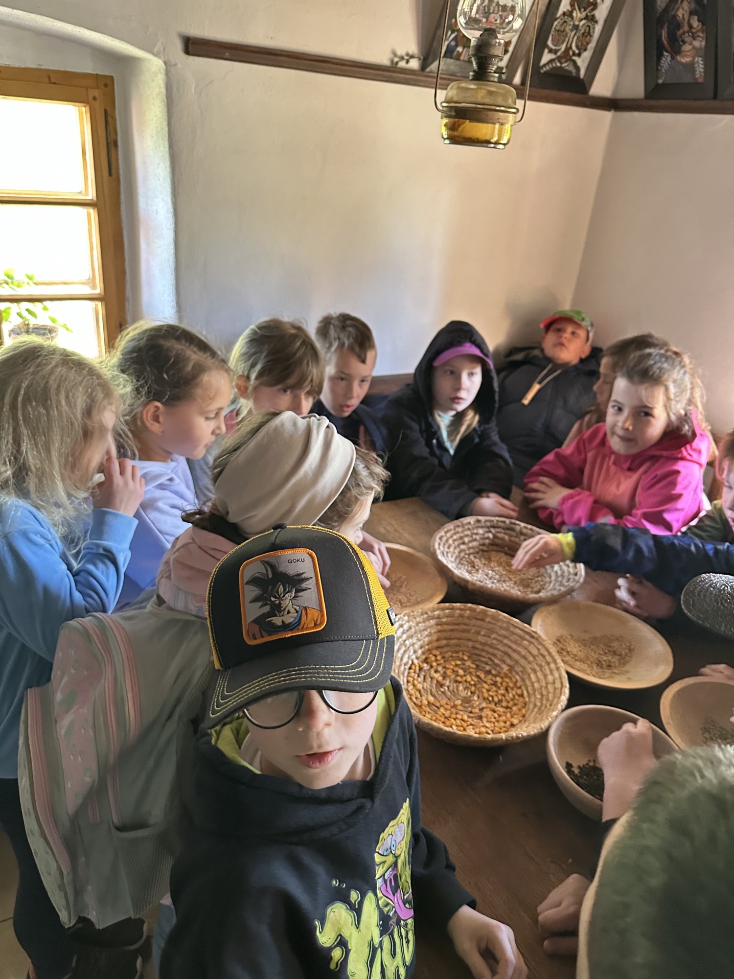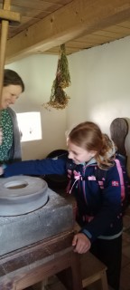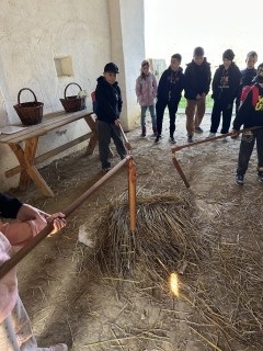 Další část programu byla věnována zpracování obilí. Žáci si vlastnoručně vyzkoušeli mletí zrna na mouku a poté z ní připravovali jednoduché placky, které se následně pekly. Mnohé překvapilo, kolik práce je potřeba, než se potraviny dostanou na náš stůl.
