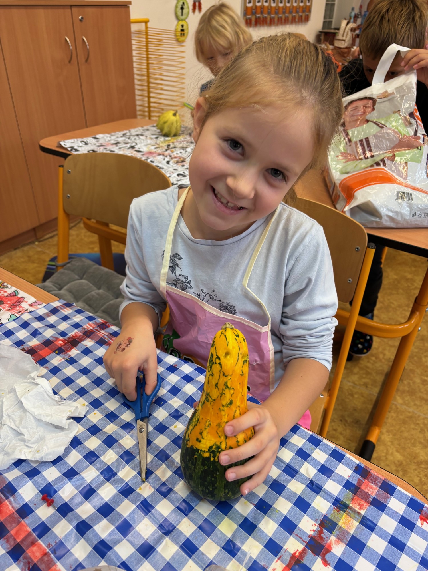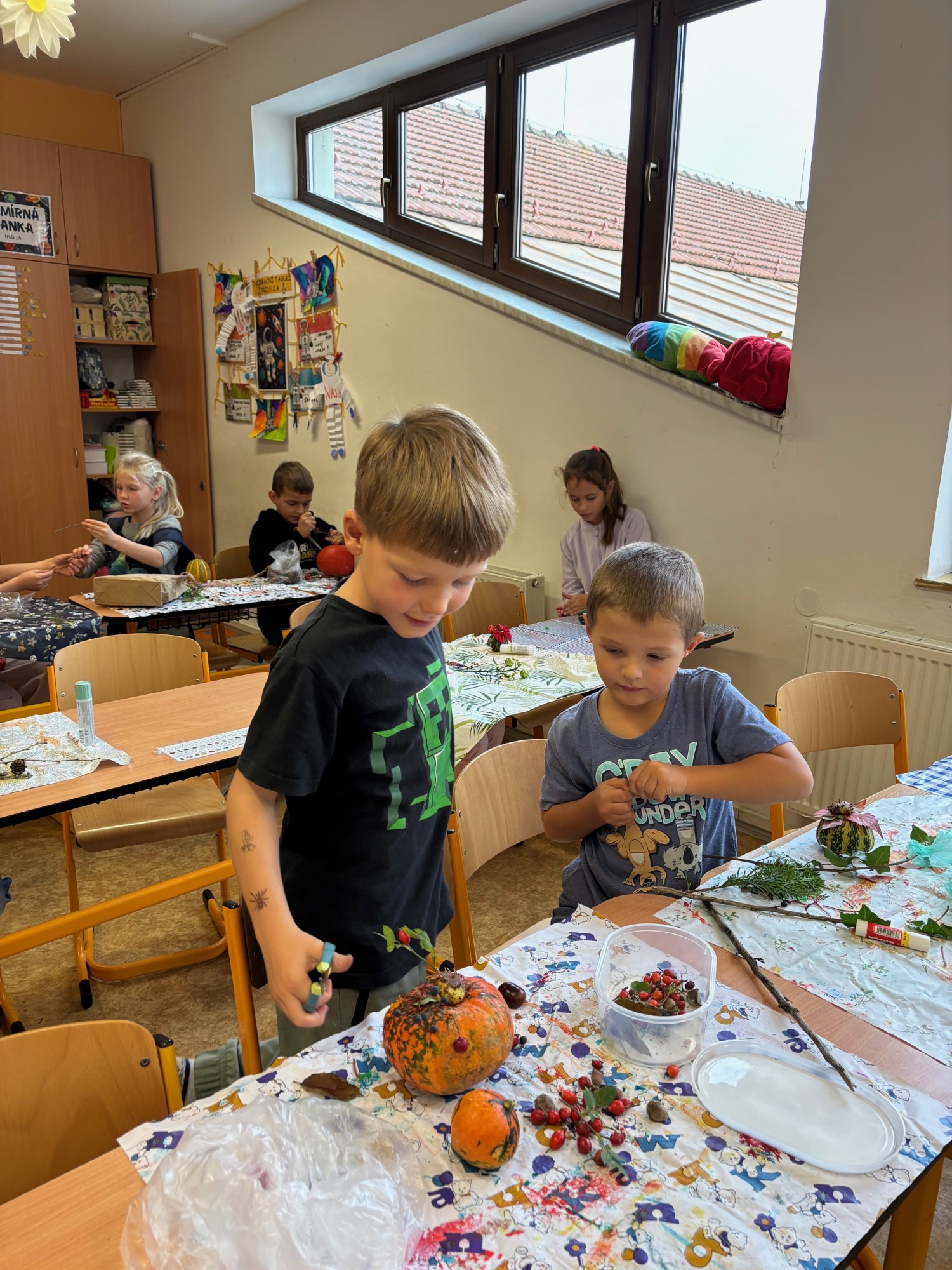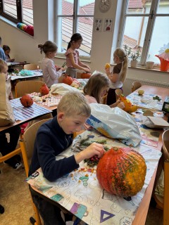 Celá akce probíhala formou tandemové výuky, kdy se paní učitelky spojily a společně vedly děti k týmové spolupráci, kreativitě a radosti z tvoření. Podařilo se vytvořit nejen krásné dýně, ale i příjemnou atmosféru.