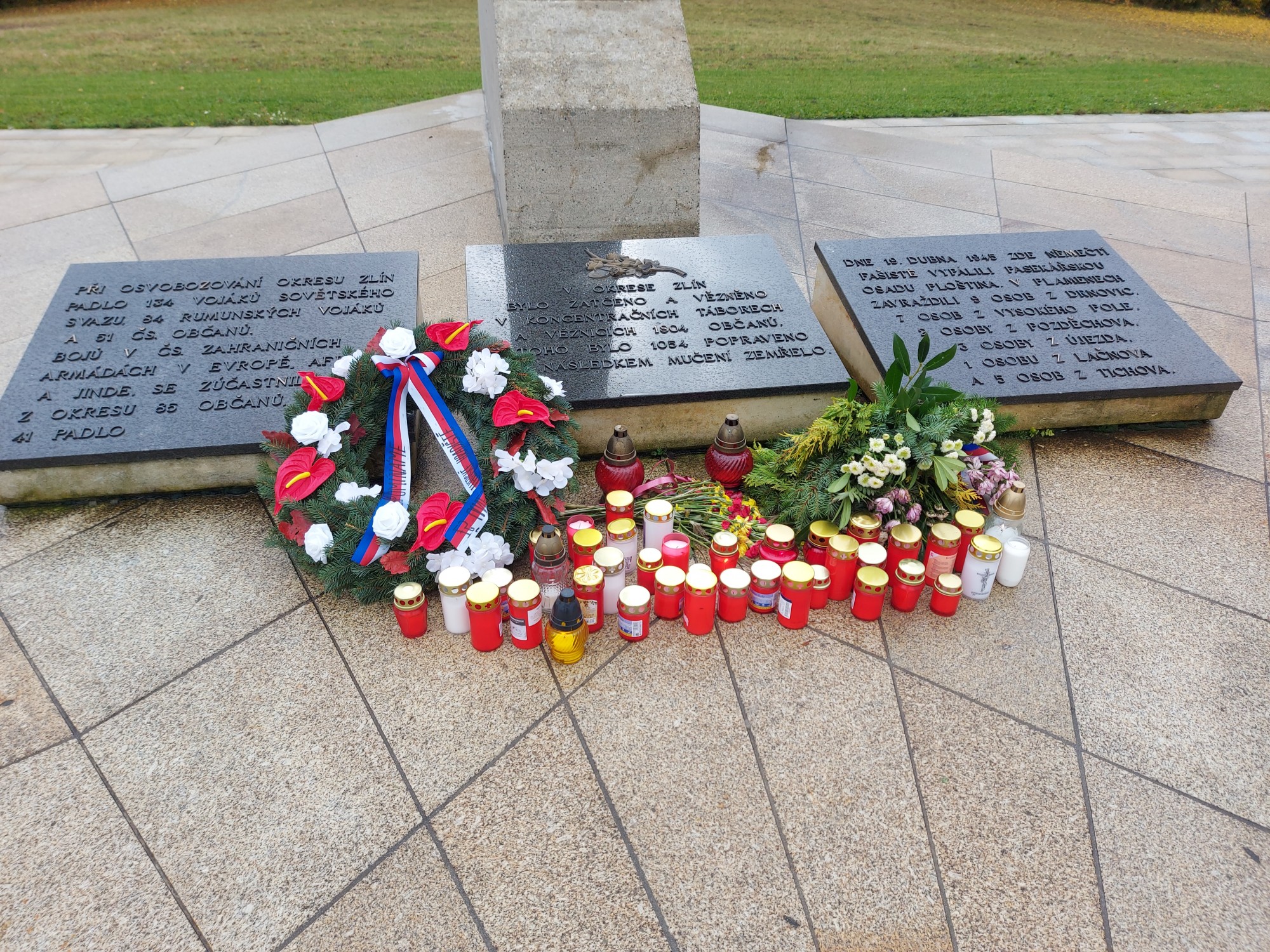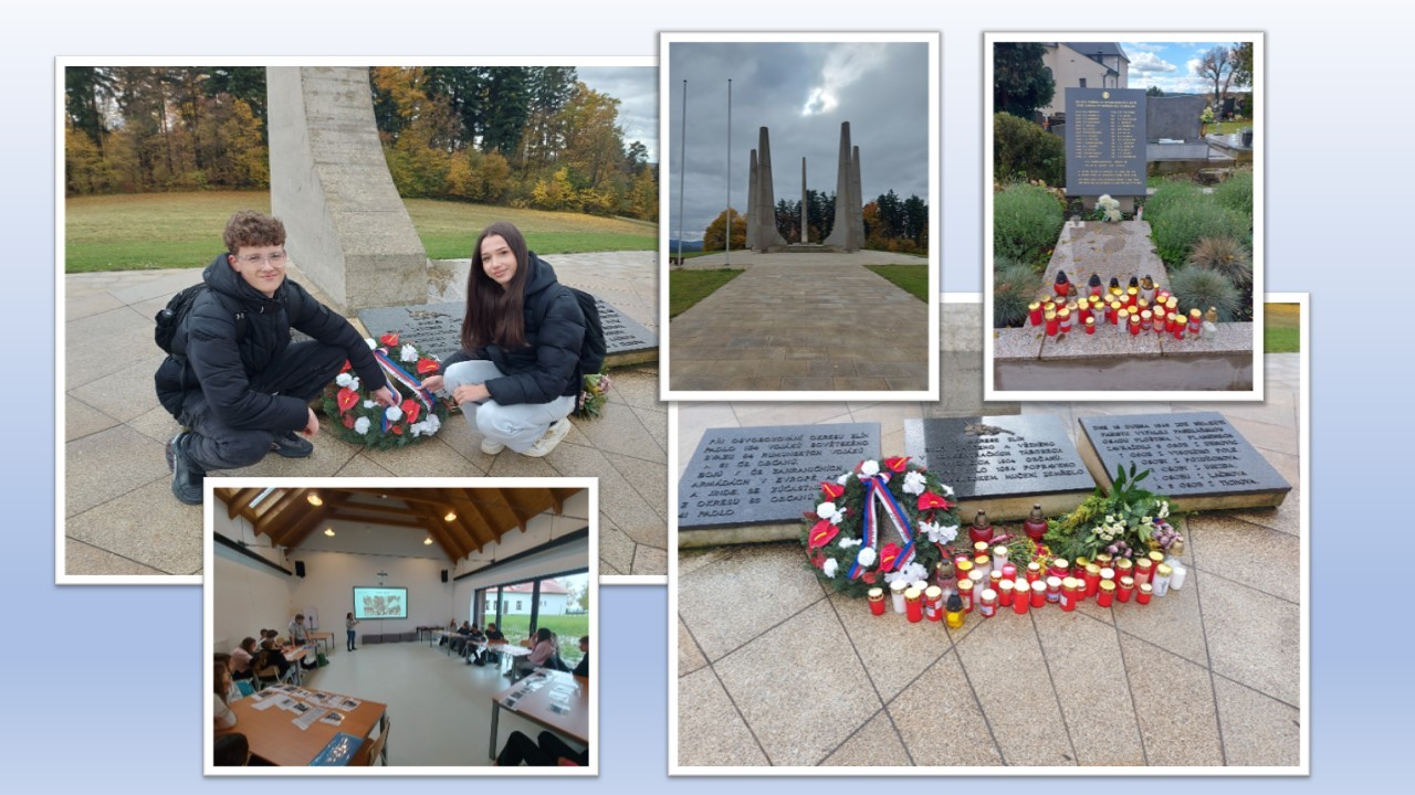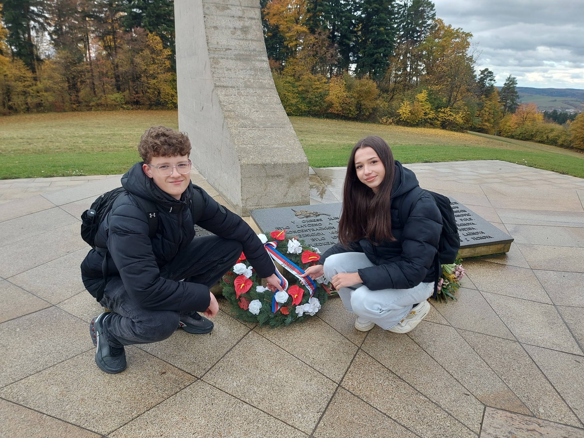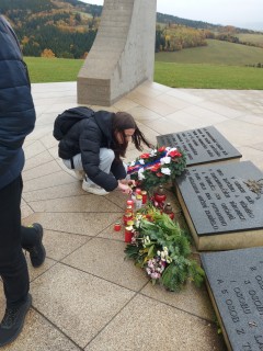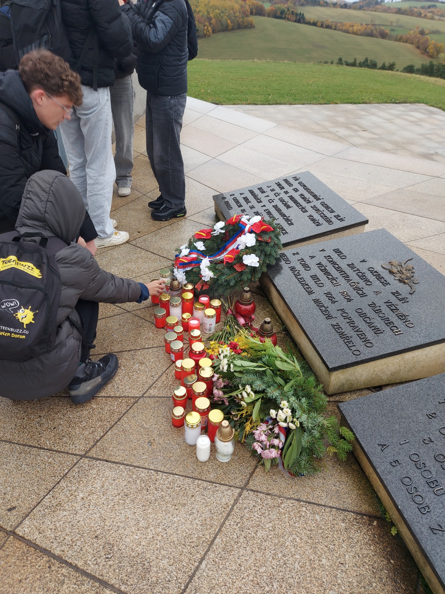Na závěr prohlídky uctili žáci naší školy oběti tragédie na Ploštině položením věnce a zapálením svíček u památníku.