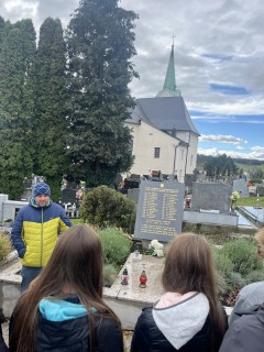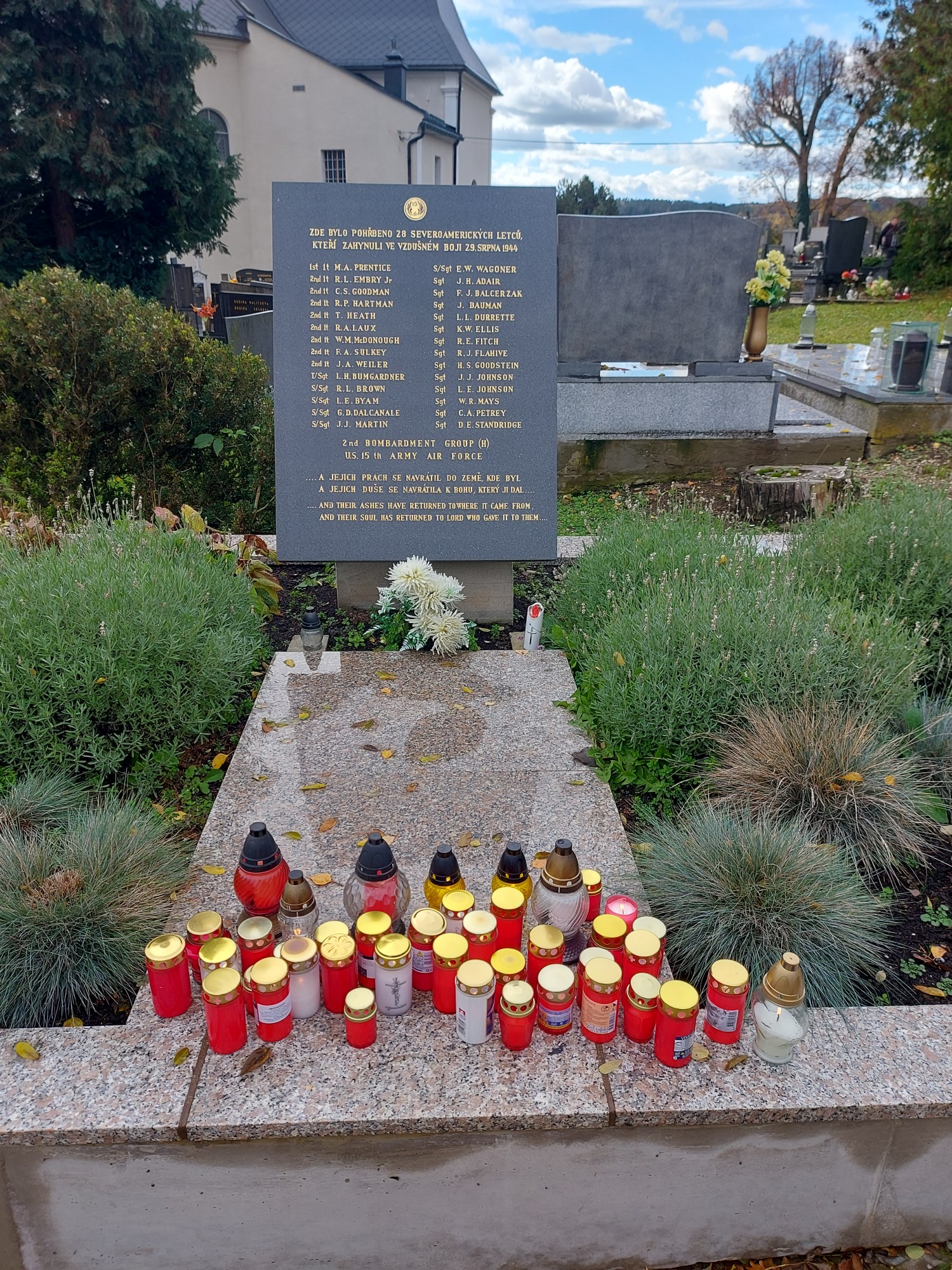 Během cesty zpět jsme se ještě zastavili na hřbitově ve Slavičíně, kde jsme poklonili památce 28 amerických letců, kteří zahynuli při leteckém souboji dne 29.8.1944 nad Bílými Karpaty a byli pohřbeni ve Slavičíně. Zde žáci zapálili 39 svíček.