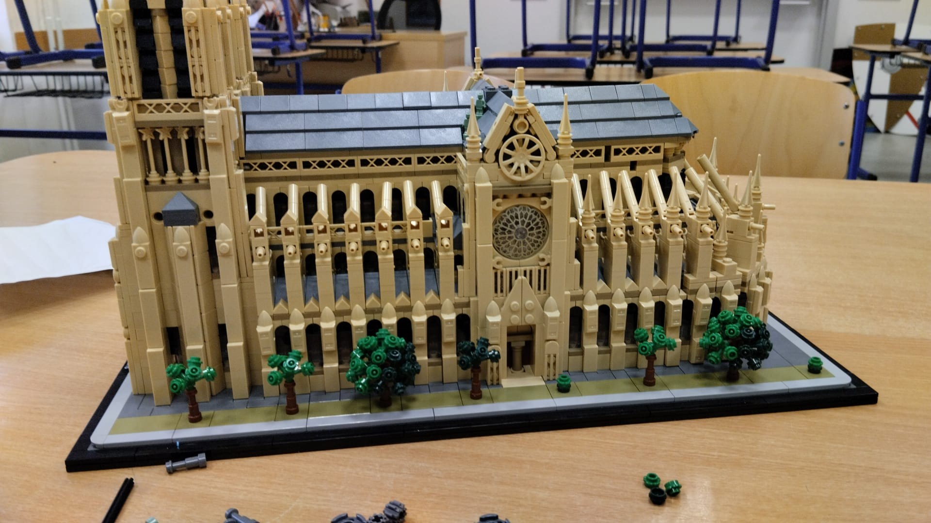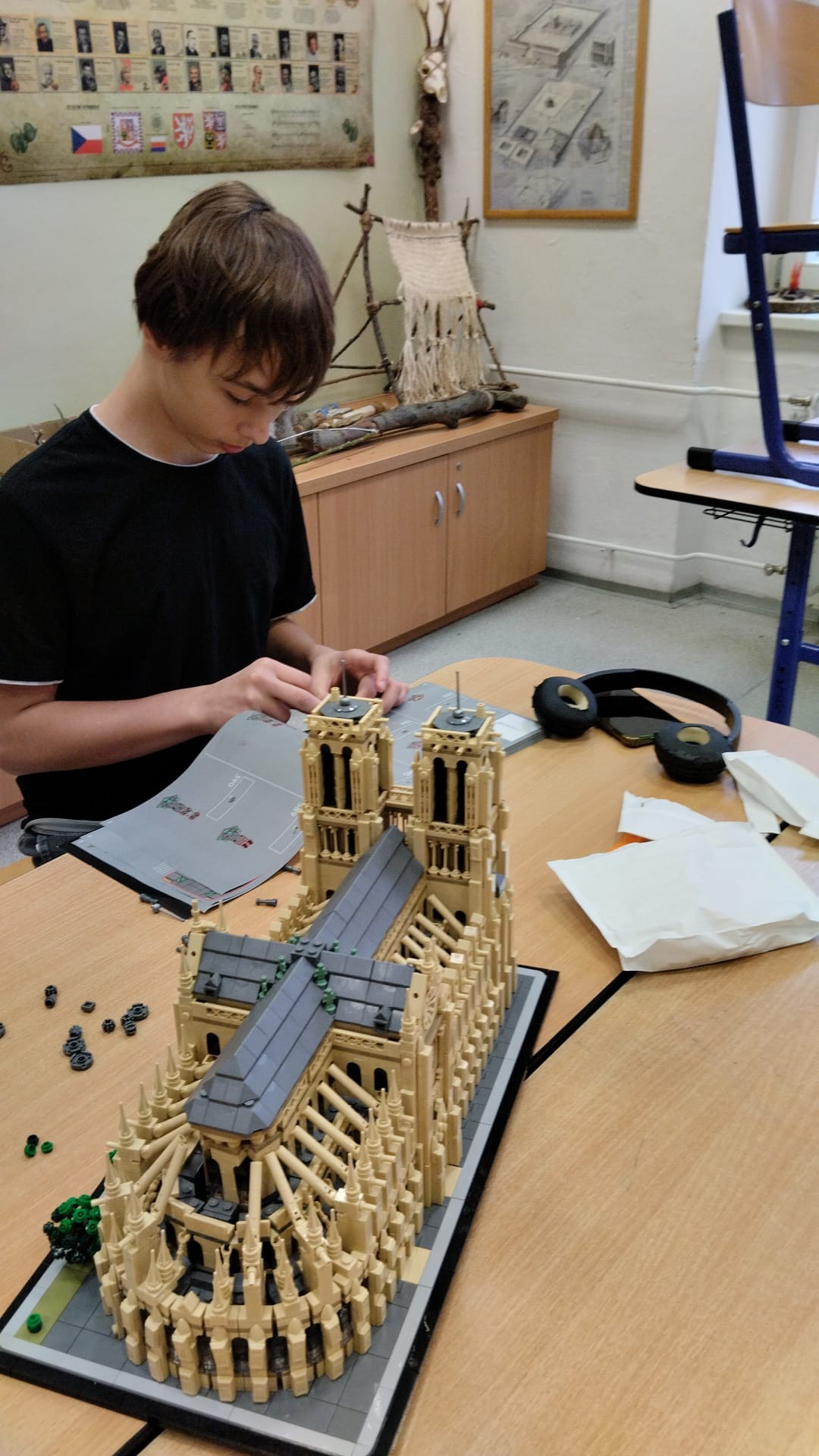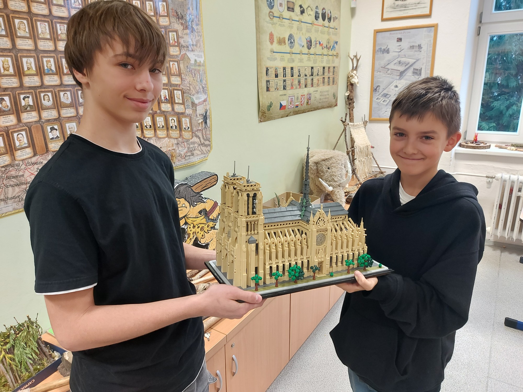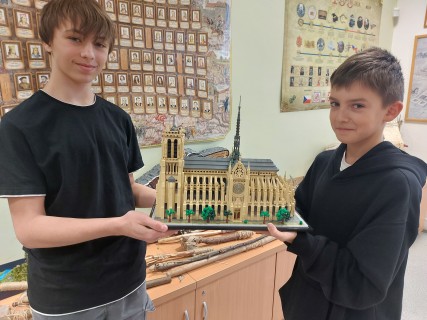 Michal Smetka, Vojtěch Janík a Josefína Kavková z 6.C dokončují stavbu katedrály NOTRE-DAME.