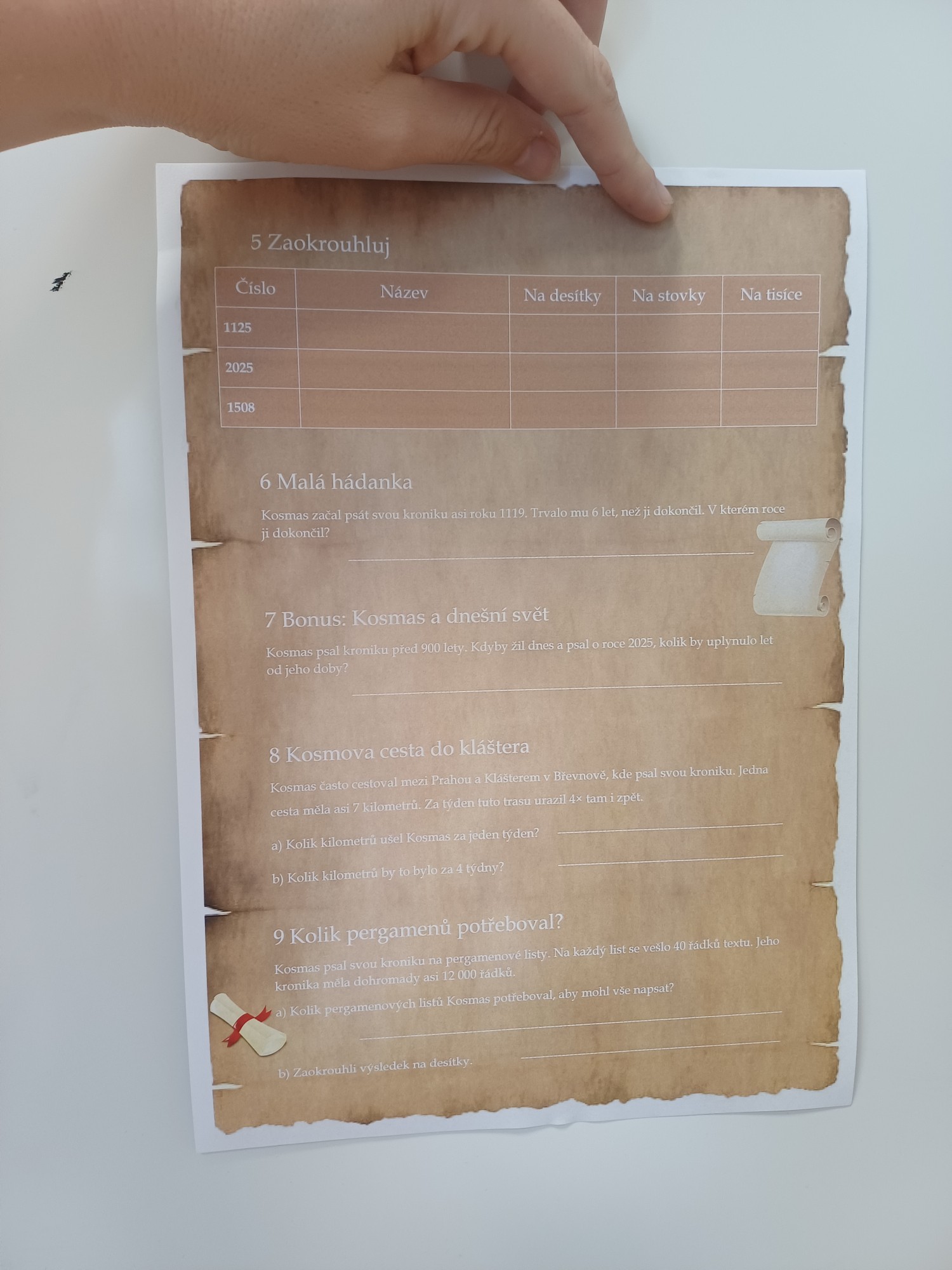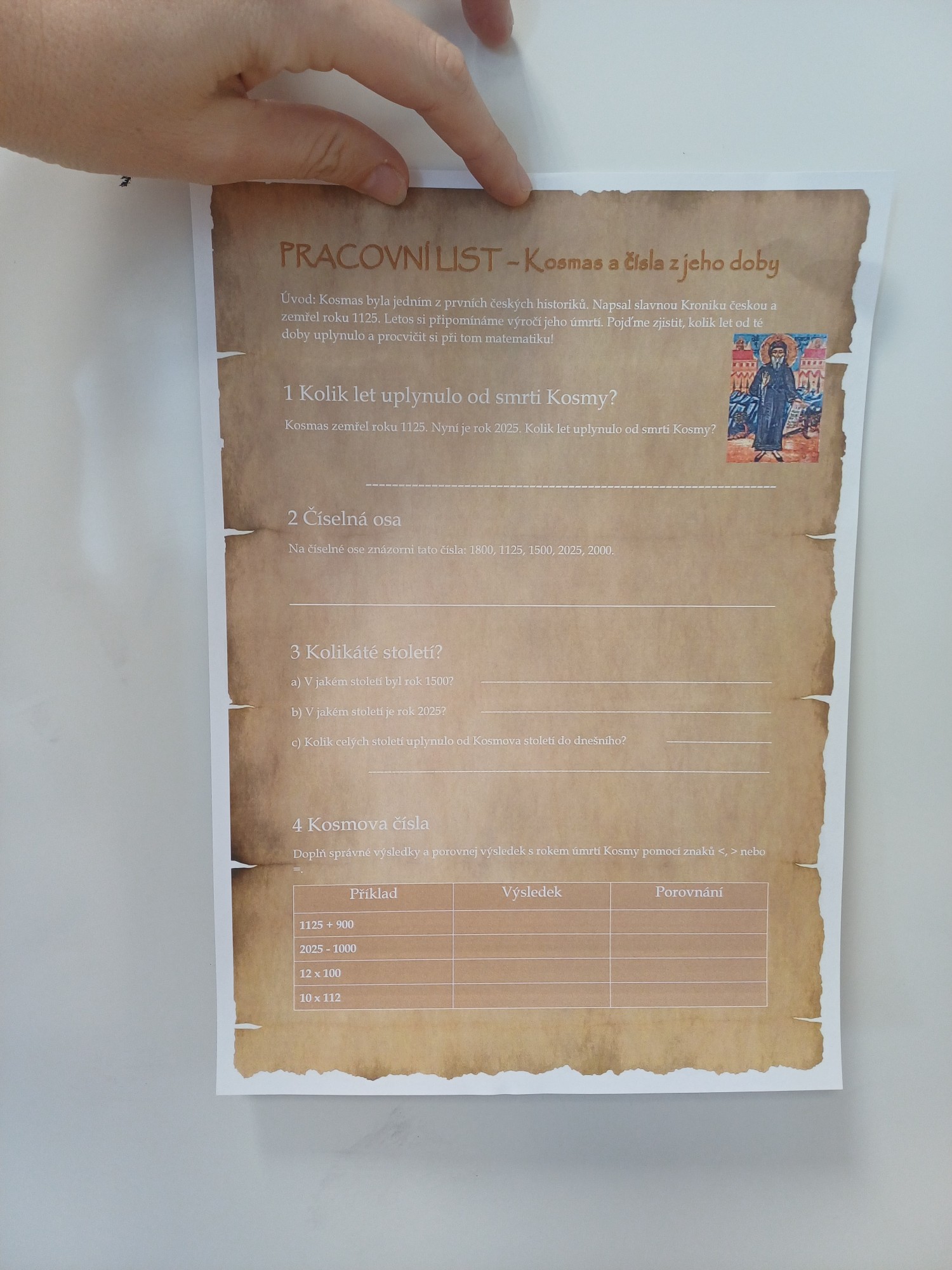 Žáci 6. ročníků si v hodině matematiky vyzkoušeli, jak lze propojit čísla s historií. Pracovali s pracovním listem na téma Kosmův život v číslech, který byl věnován letošnímu výročí 900 let od smrti českého kronikáře Kosmy.