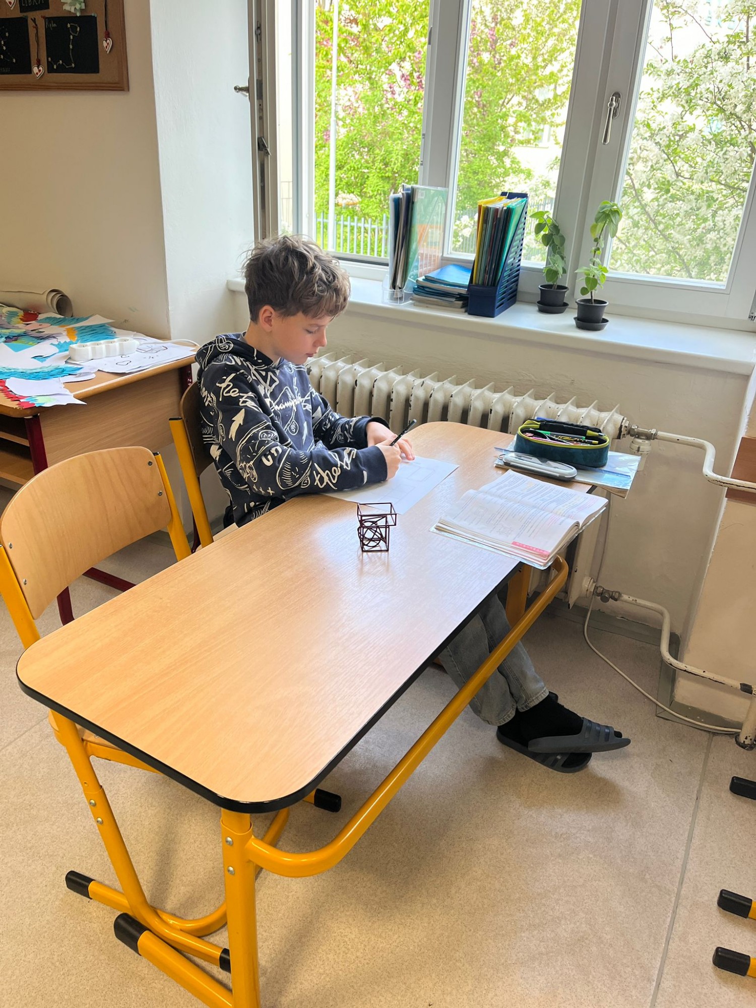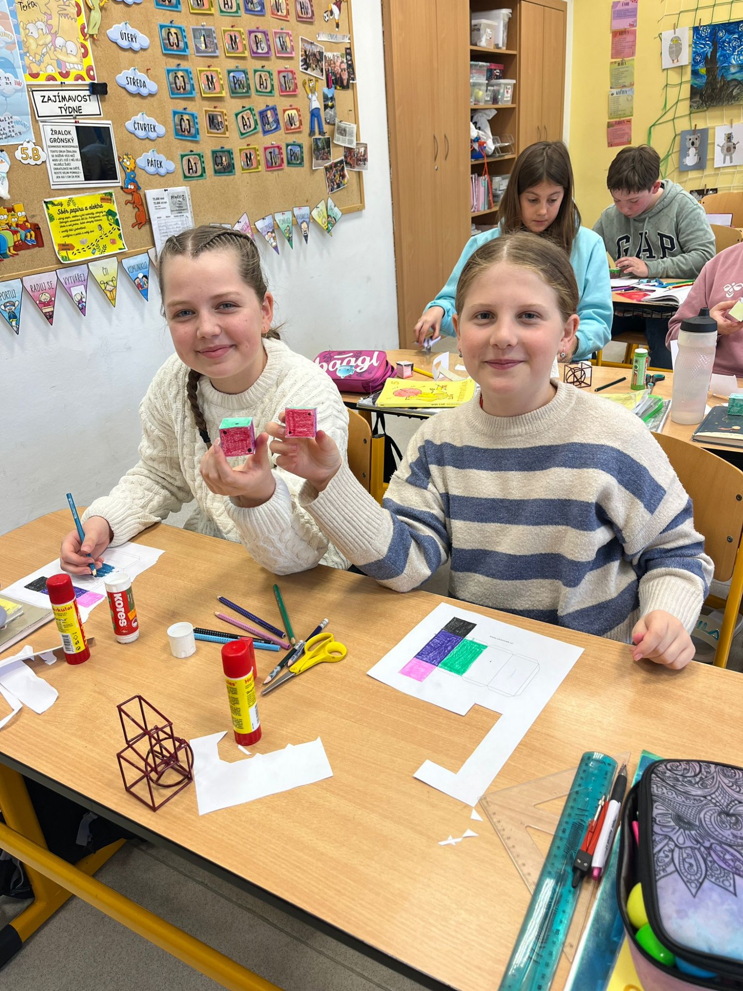 Žáci 5. B se každý čtvrtek v matematice věnují geometrii a tentokrát se ponořili do tématu geometrických těles trochu netradičně. Nejprve jsme si ukázali modely – konkrétně konstrukci krychle a kvádru – a poté jsme se rovnou pustili do práce a začali tvořit modely vlastní.