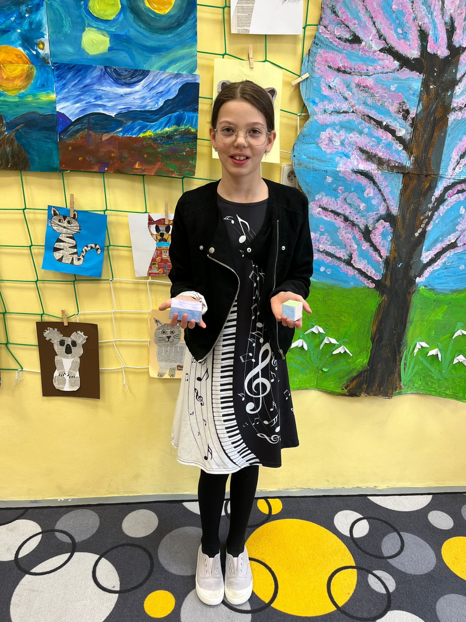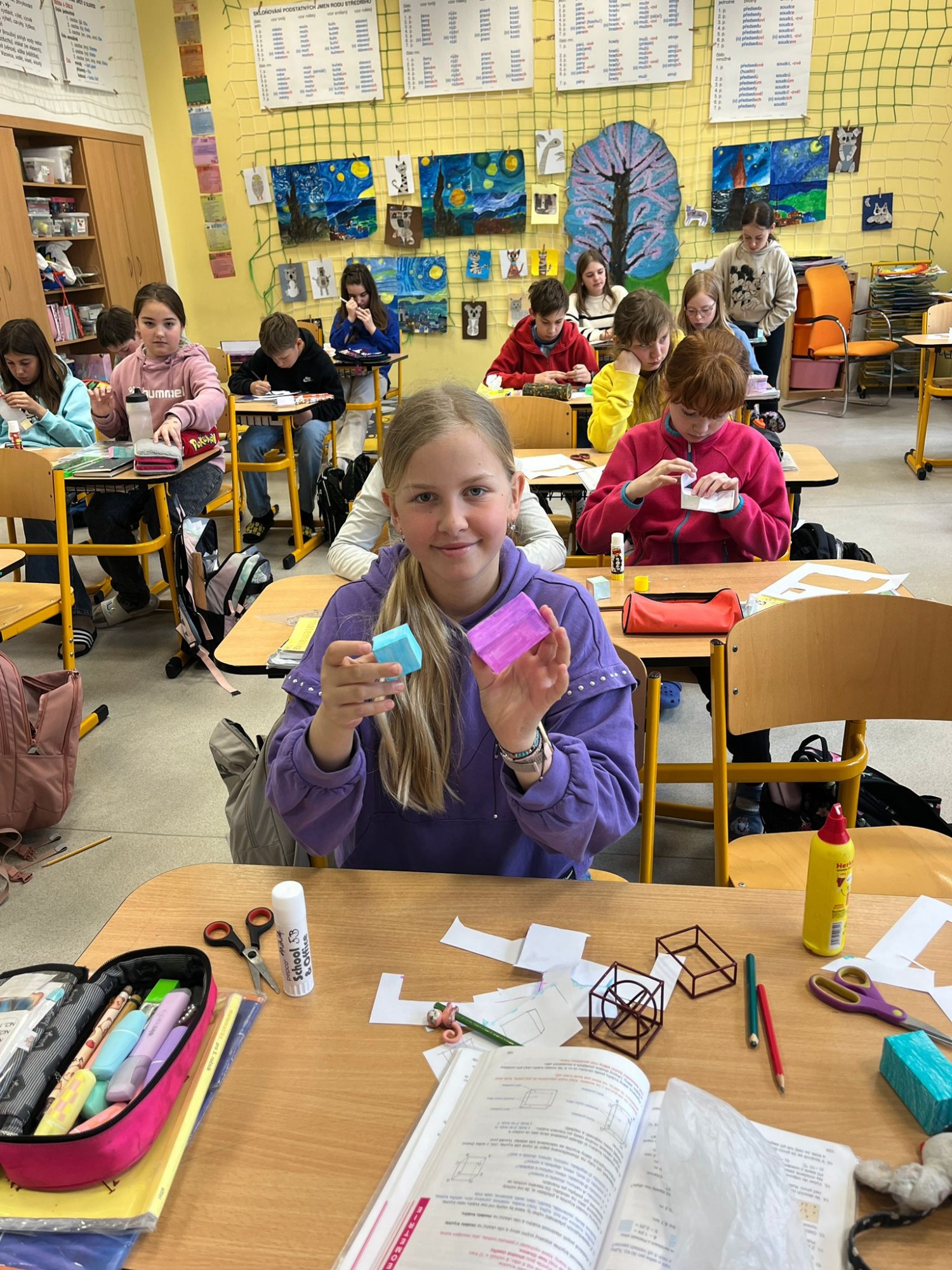Během této praktické hodiny si děti samy vyzkoušely, jak jednotlivá tělesa vypadají v prostoru, a snadno přišly na to, kolik mají stěn, hran a vrcholů. K dispozici dostaly síť tělesa, kterou si nejprve podle vlastní fantazie pokreslily, poté vystřihly a nakonec z ní složily krychli nebo kvádr.