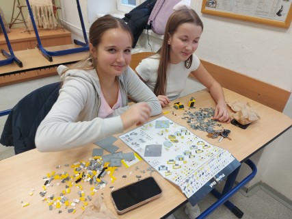 Děvčata z 7.C Sára Skovajsová a Marina Juříková začala stavět stavebnici přistávacího modulu na Měsíc EAGLE ( Orel).