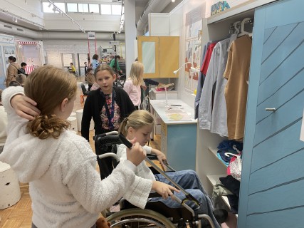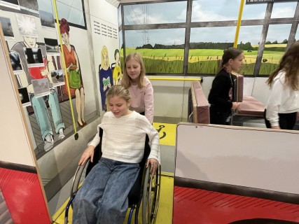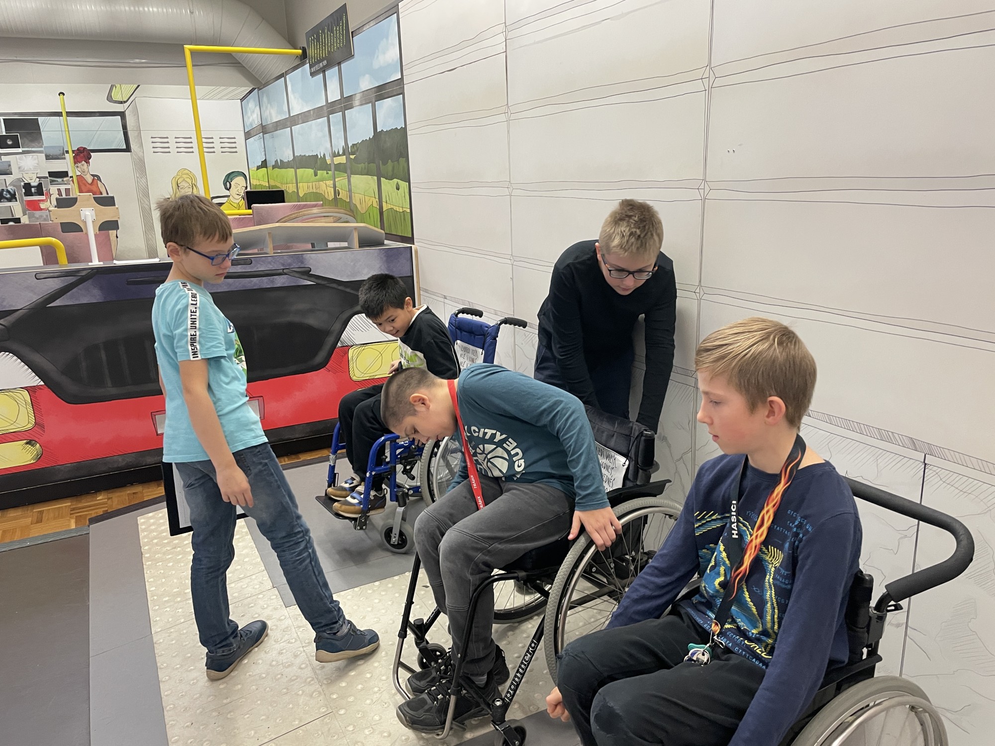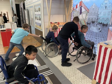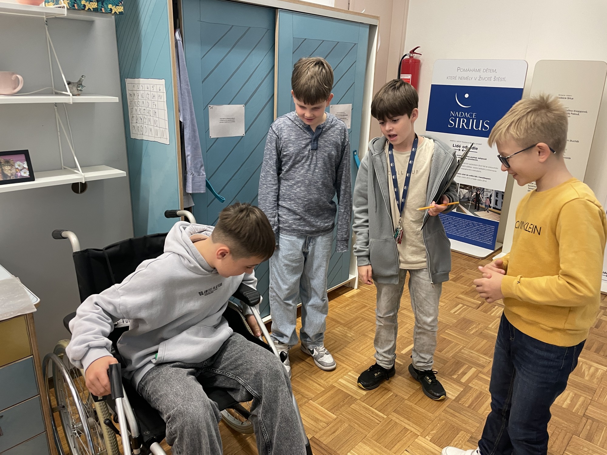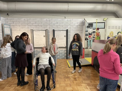 Výstavu Lidé odvedle navštívili žáci 5. C ve Slováckém muzeu, které život lidí s postižením představuje interaktivní formou. Děti si mohly zkusit na vlastní kůži jak obtížné musí třeba být vypravit se na výlet s různým typem zdravotního postižení: od přípravy na cestu, přes orientaci v terénu a použití dopravního prostředku. Žáci si prošli pro představu i temný tunel znesnadňující orientaci a osobně si vyzkoušeli, jak se musí hendikepovaní lidé, dospělí i děti, vypořádávat s běžnými životními situacemi, které si zdravý člověk ani neuvědomuje.