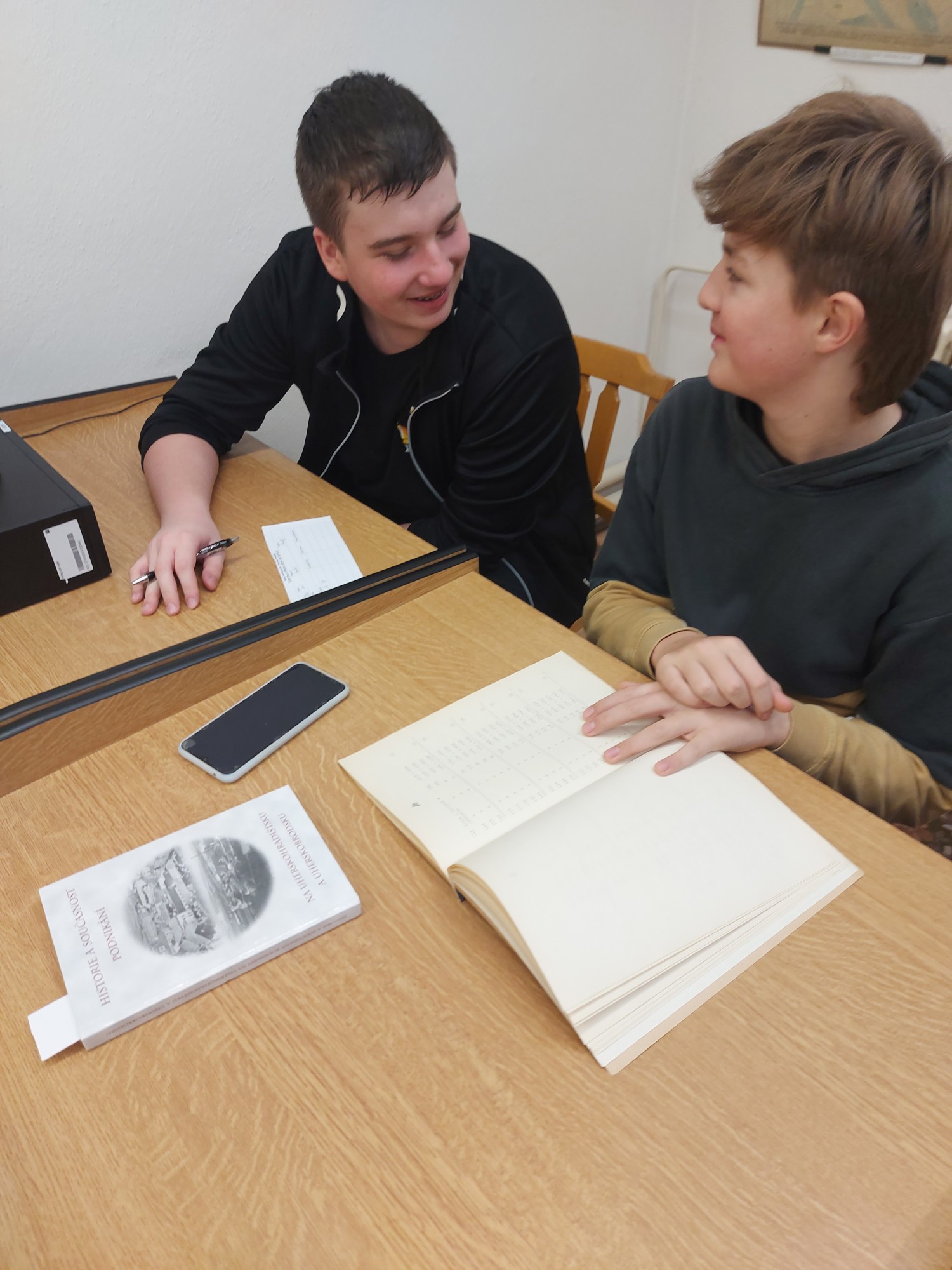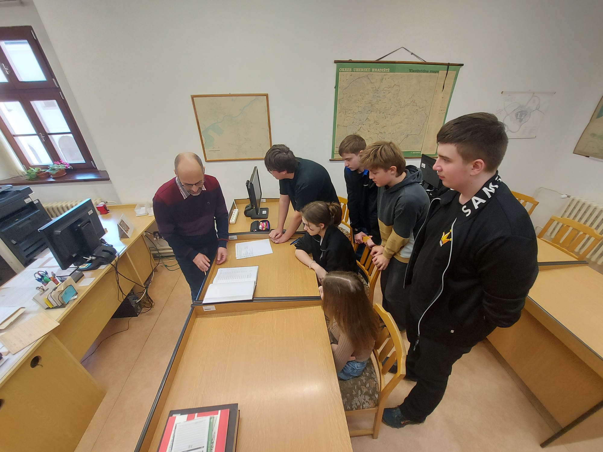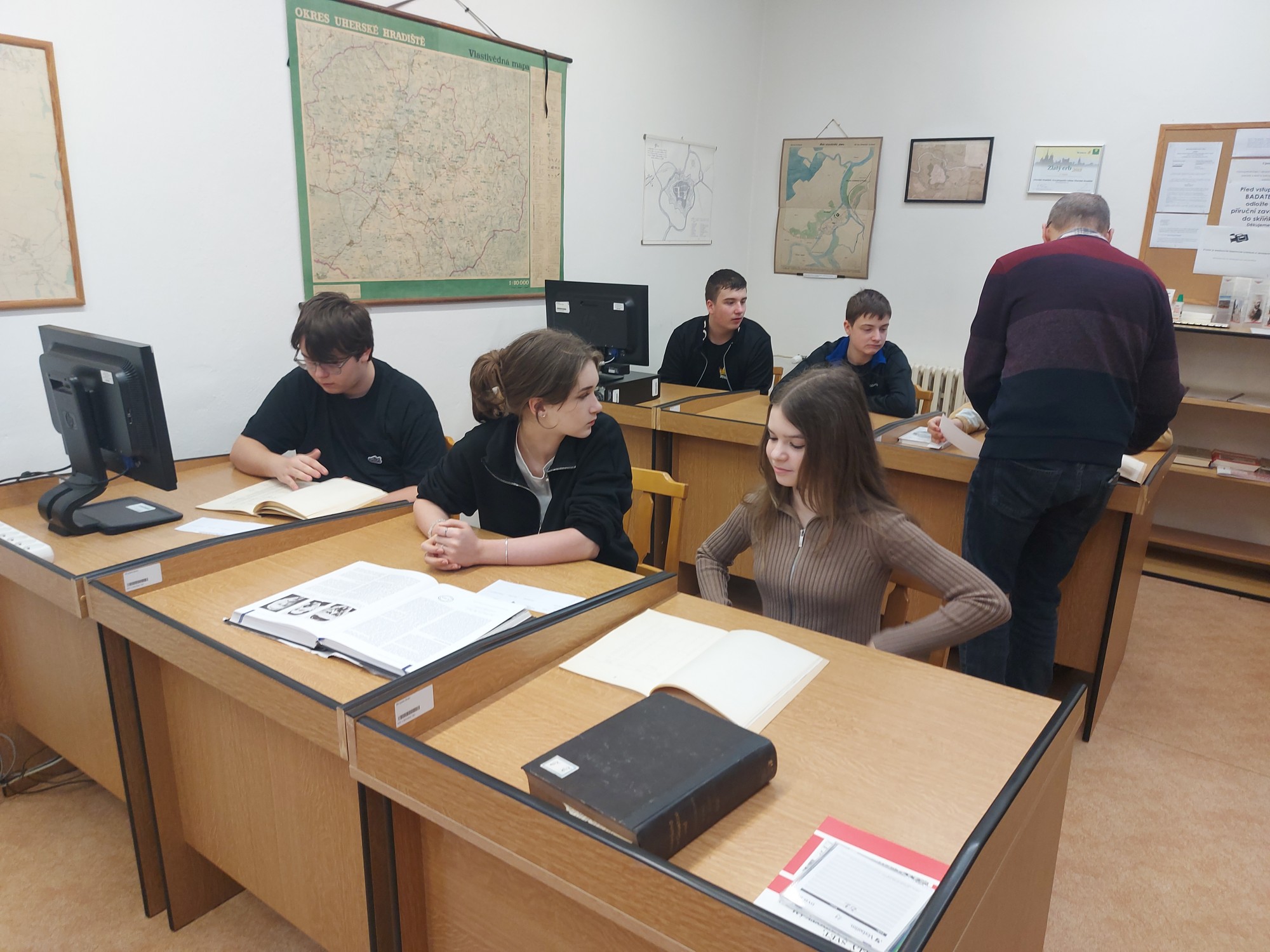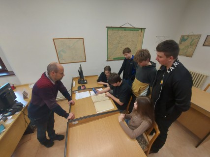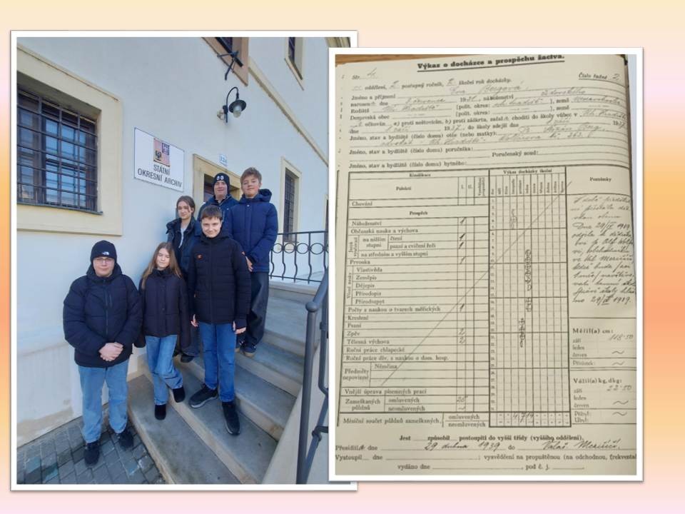 Dne 27. února 2026 jsme navštívili Státní okresní archiv a získali mnoho cenných materiálů, například katalogové listy hledaných žáků, protižidovská nařízení z Uherského Hradiště a zápisy školní kroniky z válečných let.