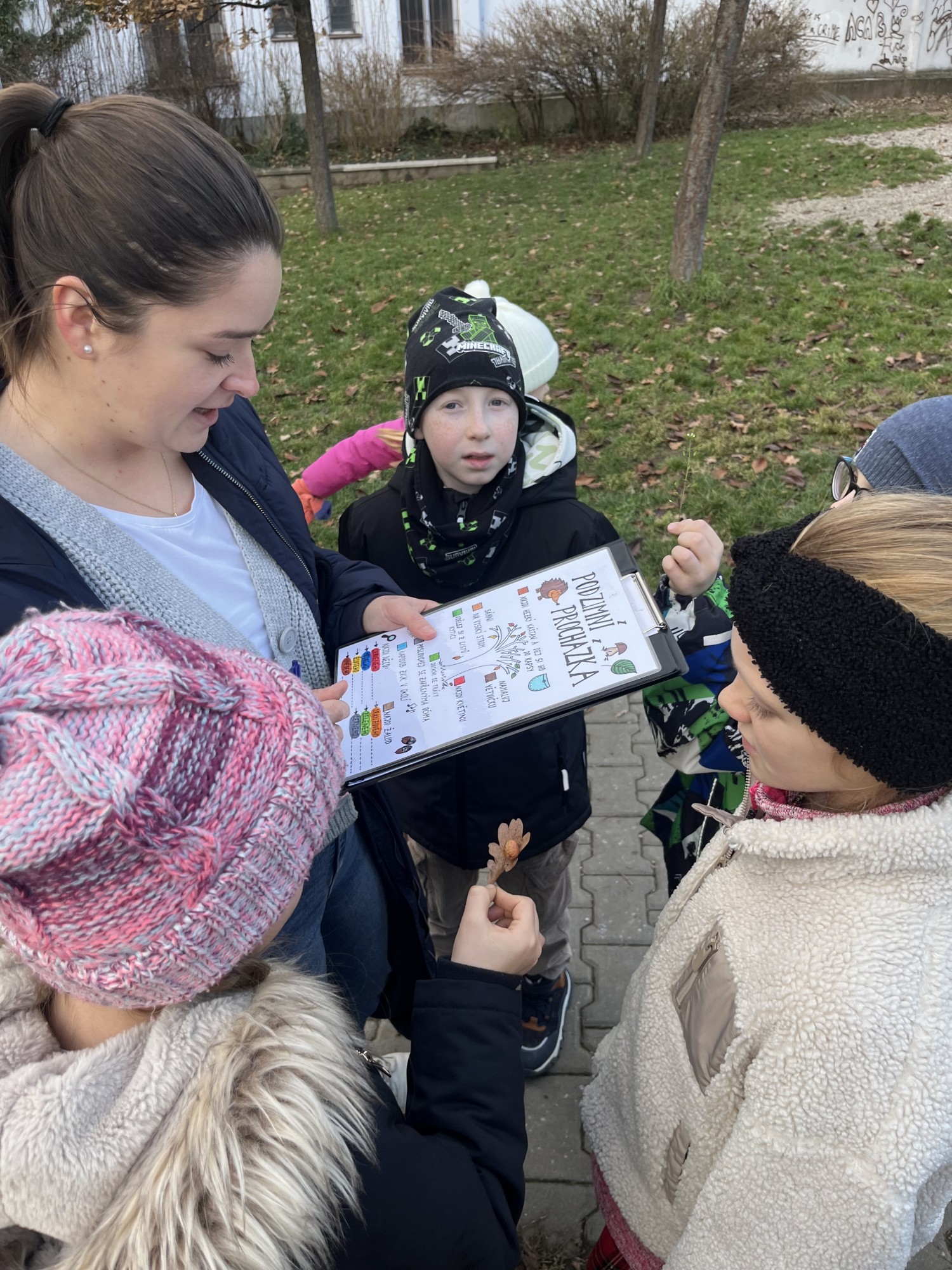 Dalším úkolem bylo najít předměty v barvách podzimního spektra – červené, žluté, hnědé, zelené i oranžové. Děti také kreslily větve stromů a učily se poznávat stromy podle jejich plodů a listů. Zkoumaly, který strom je v okolí nejvyšší a přemýšlely, který by mohl být ten nejstarší.