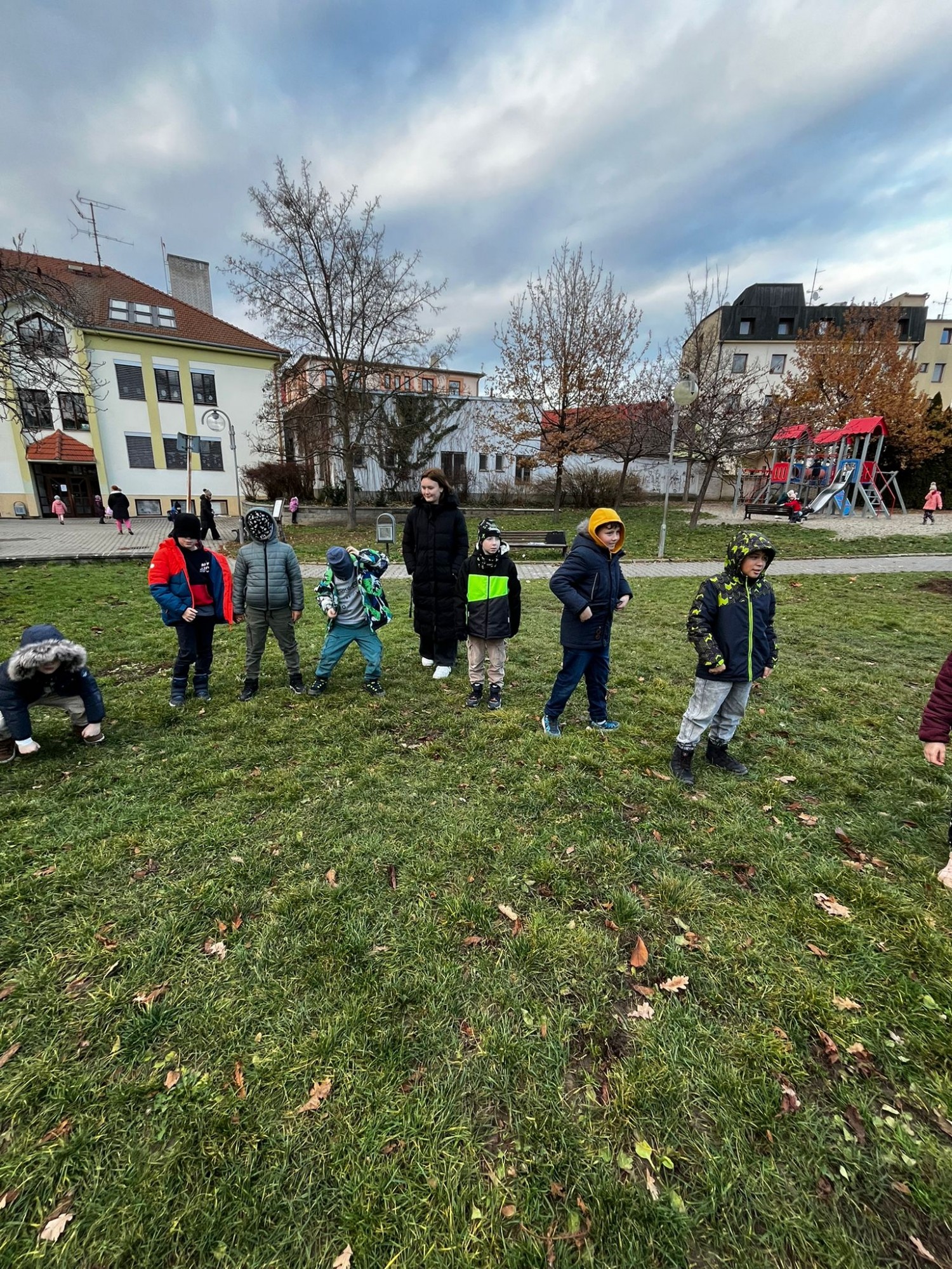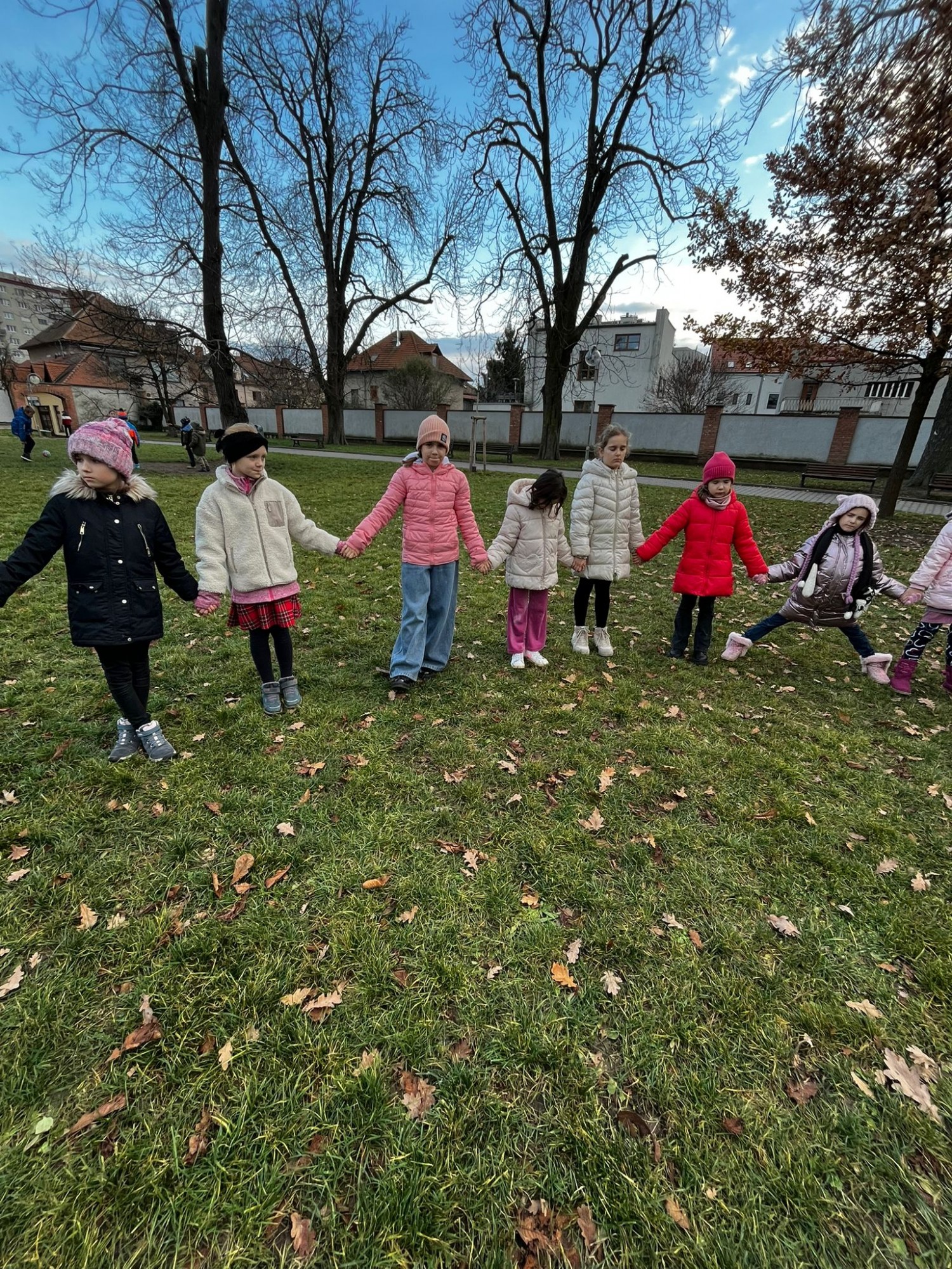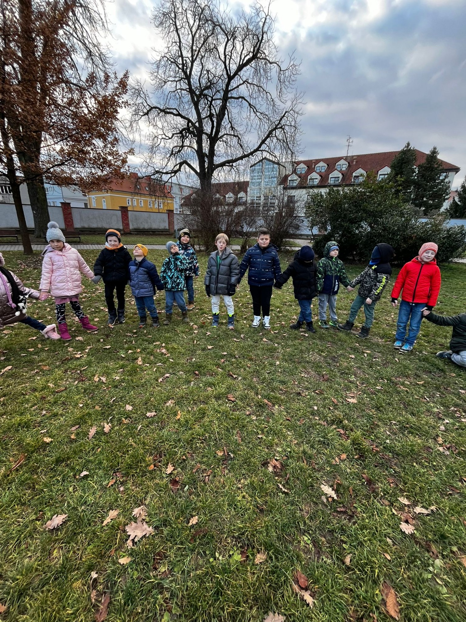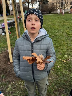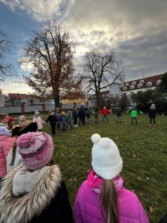 Na závěr jsme si společně zahráli hru na zvuky přírody. Děti stály v kruhu se zavřenýma očima a zkoušely rozpoznat zvuky z okolí – šustění listí, zpěv ptáků nebo vzdálené kroky.