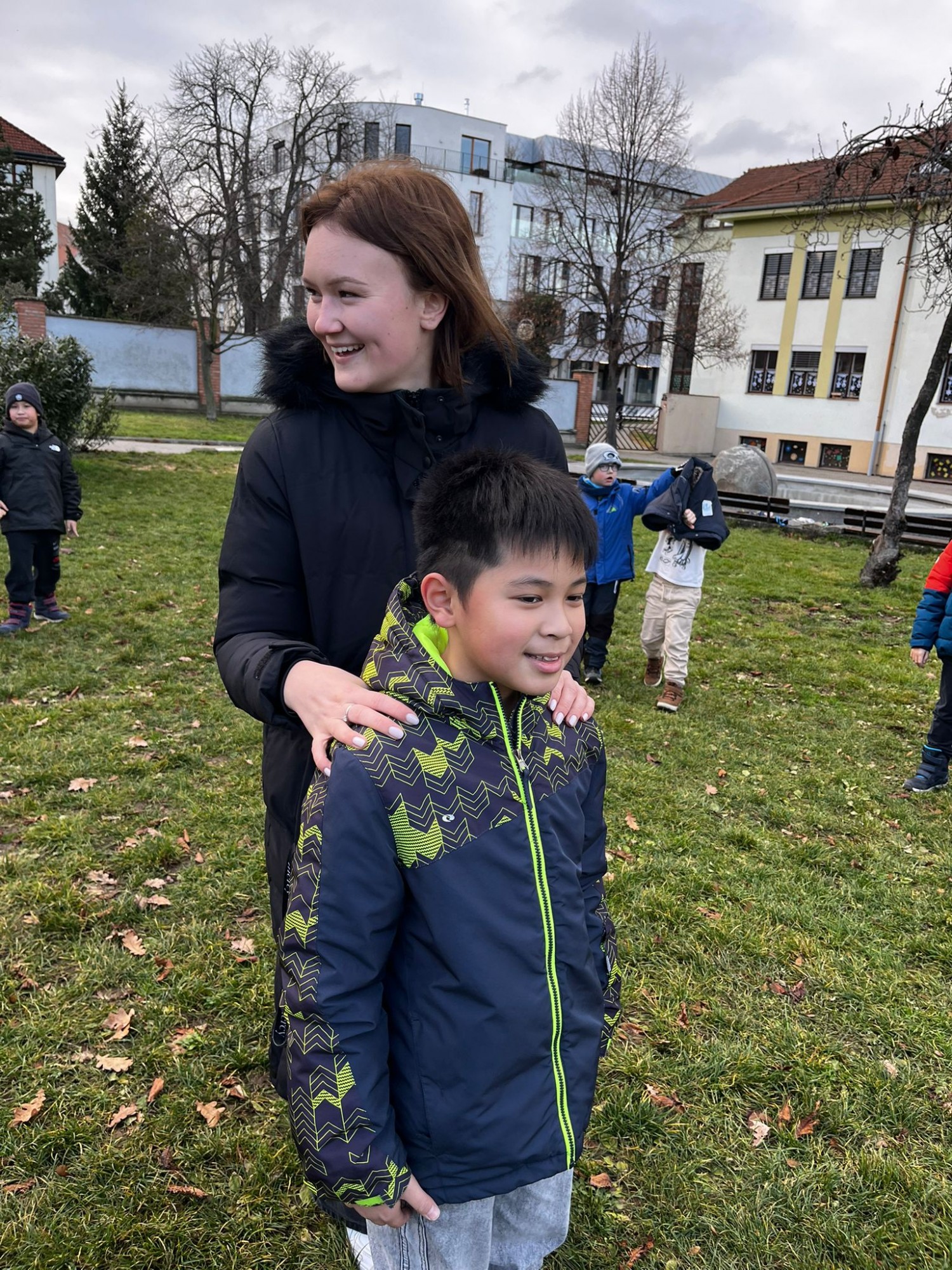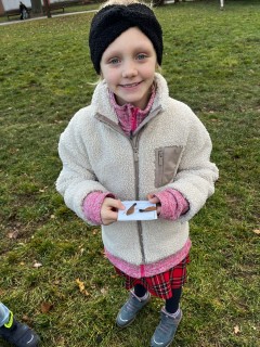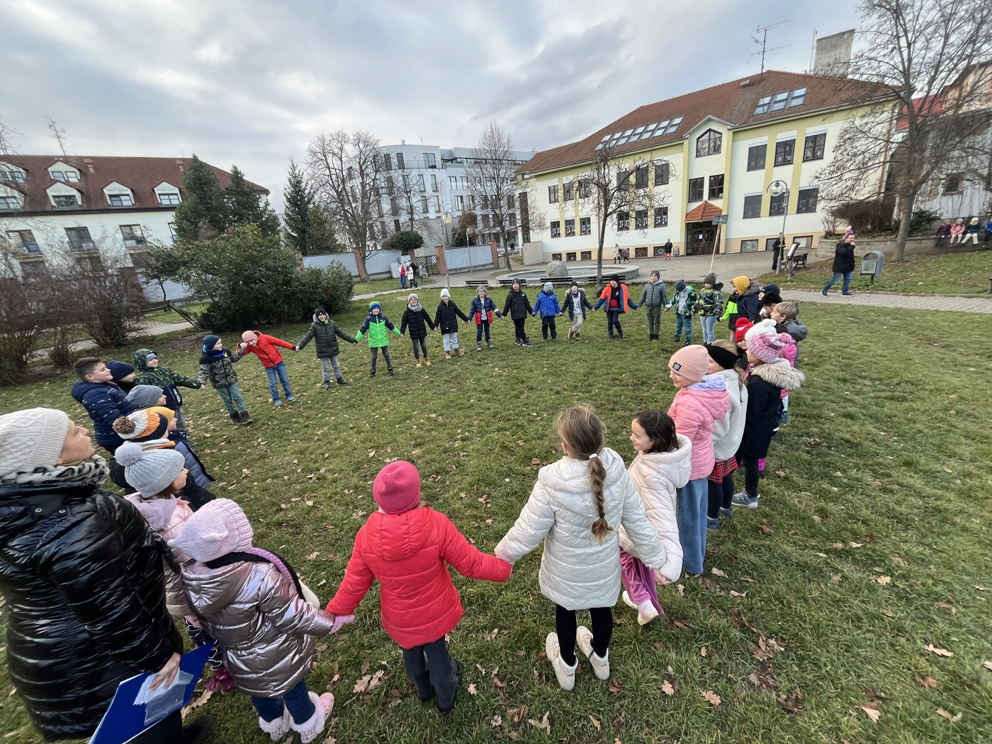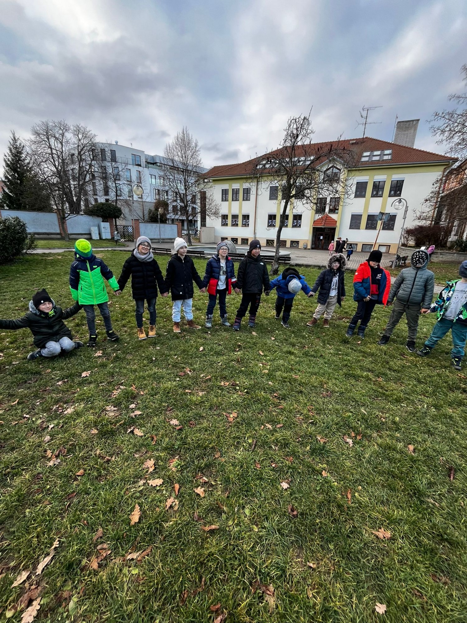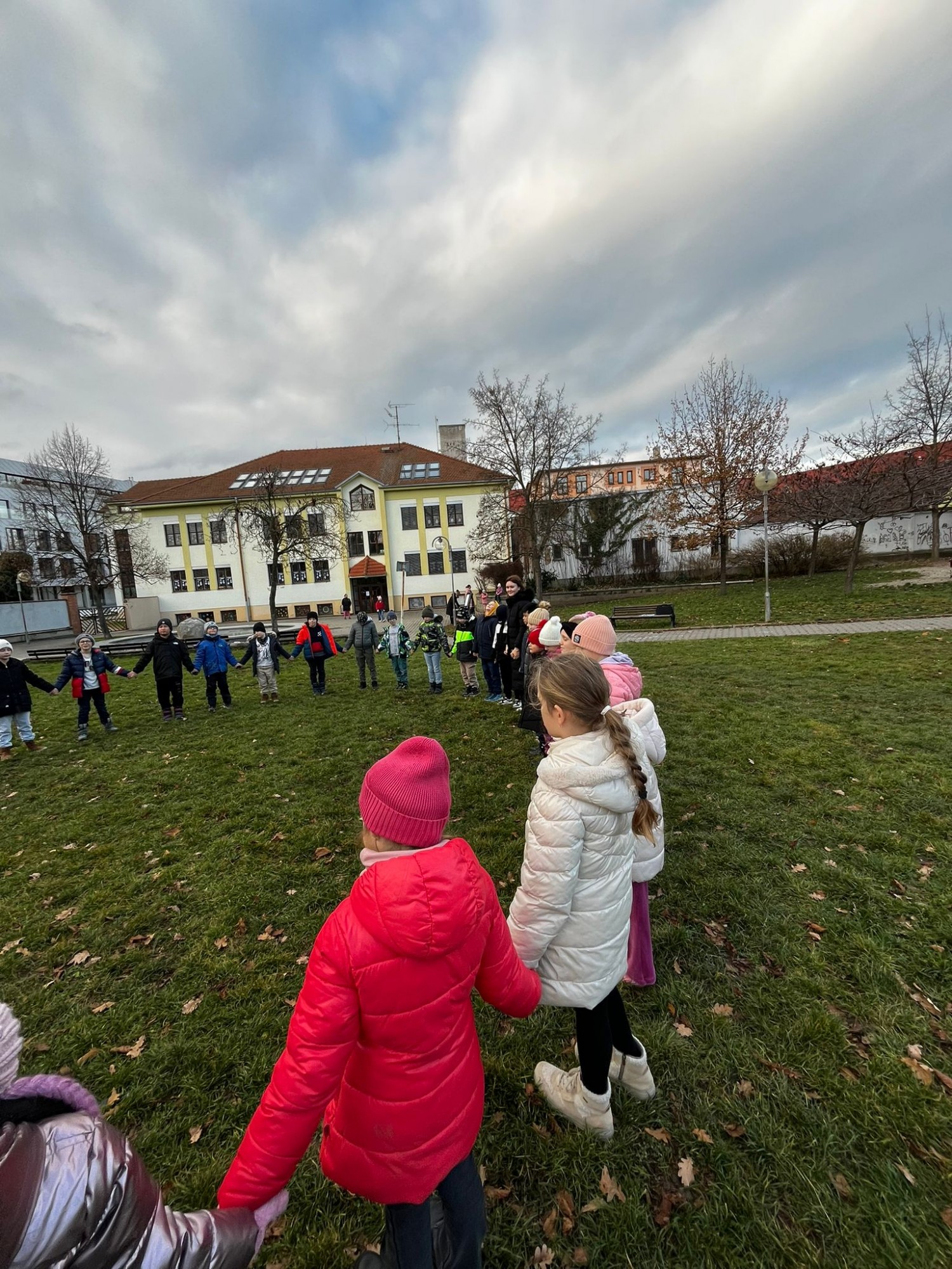 Na závěr jsme si společně zahráli hru na zvuky přírody. Děti stály v kruhu se zavřenýma očima a zkoušely rozpoznat zvuky z okolí – šustění listí, zpěv ptáků nebo vzdálené kroky.