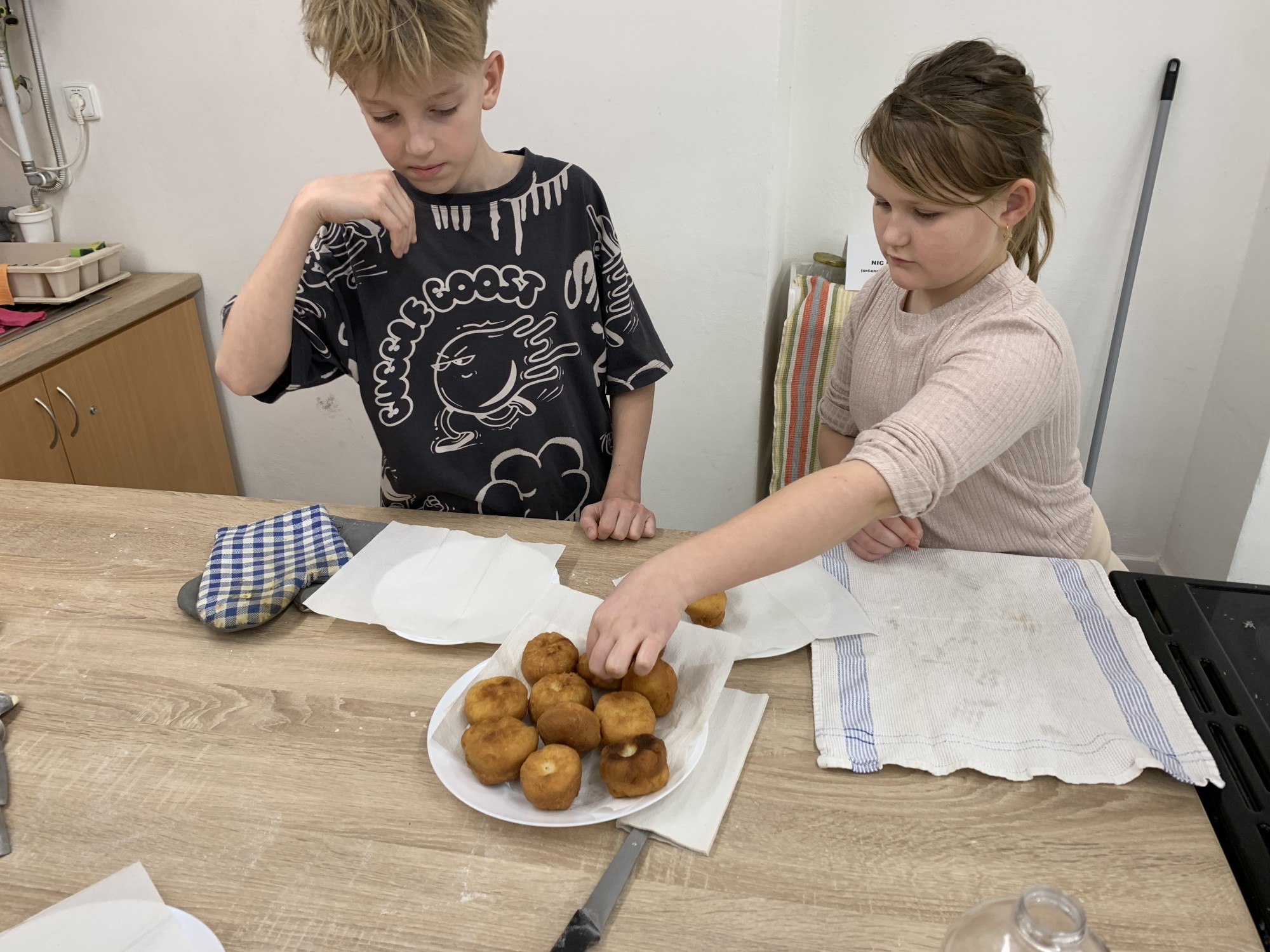 Vůně se linula školou a úsměvy ještě větší než samotné koblihy. I v menším počtu jsme si práci náramně užili a dokázali, že když jde o koblihy, žádné oslabení nás nezastaví!