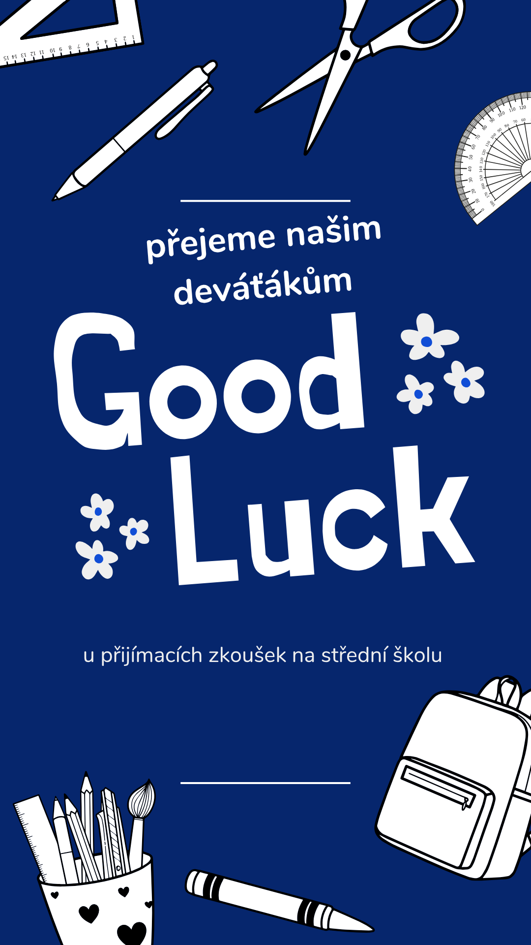 Milí deváťáci, přejeme vám hodně štěstí u přijímaček. Věříme, že všechno zvládnete tak dobře, jak opravdu umíte. Ať se vám daří a vaše úsilí vás dovede na školu, kterou si přejete. Přejeme vám, aby tento krok byl začátkem dalšího úspěšného studia.