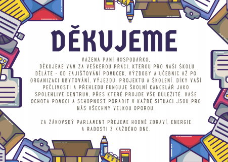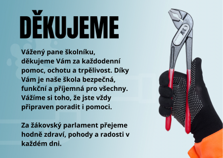 Jménem žákovského parlamentu bychom chtěli poděkovat správním zaměstnancům školy za jejich práci, které si velmi vážíme. Všichni jsou nezbytnou součástí naší školy a bez nich bychom si nevěděli rady v různých situacích. Proto žákovský parlament vytvořil děkovné kartičky pro pana školníka, paní uklízečky, paní kuchařky, paní vrátnou, paní hospodářku a v neposlední řadě pro paní z bufetu.