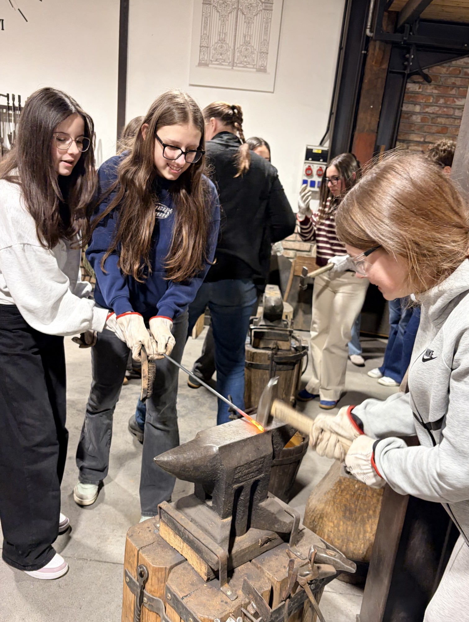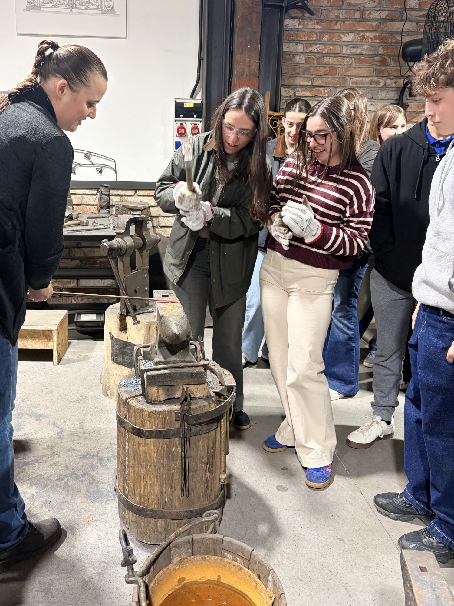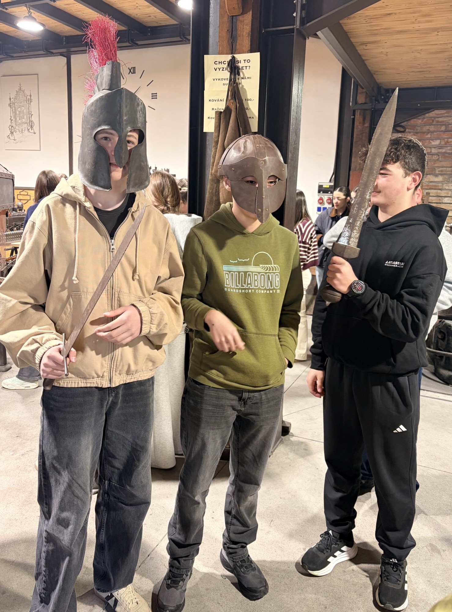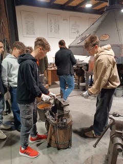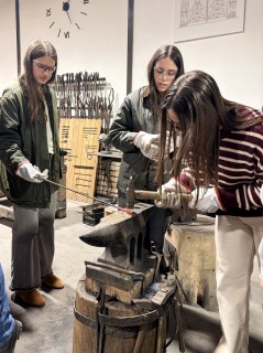Hned potom jsme zamířili do kovárny, kde nám kovářka povyprávěla spoustu zajímavostí o svém řemesle. Pak už si to žáci mohli vyzkoušet na vlastní kůži – ve skupinkách vyráběli hřebík ze surového materiálu, což pro ně byla zábava. A nejen pro žáky – hřebík si zkusili vyrobit i učitelé ze Španělska. Někteří žáci pak využili možnost vyzkoušet si brnění nebo meče.