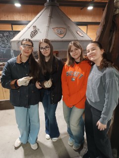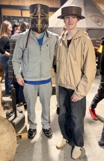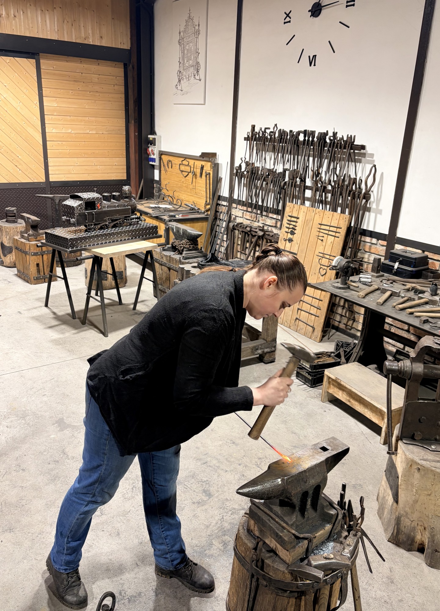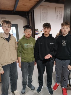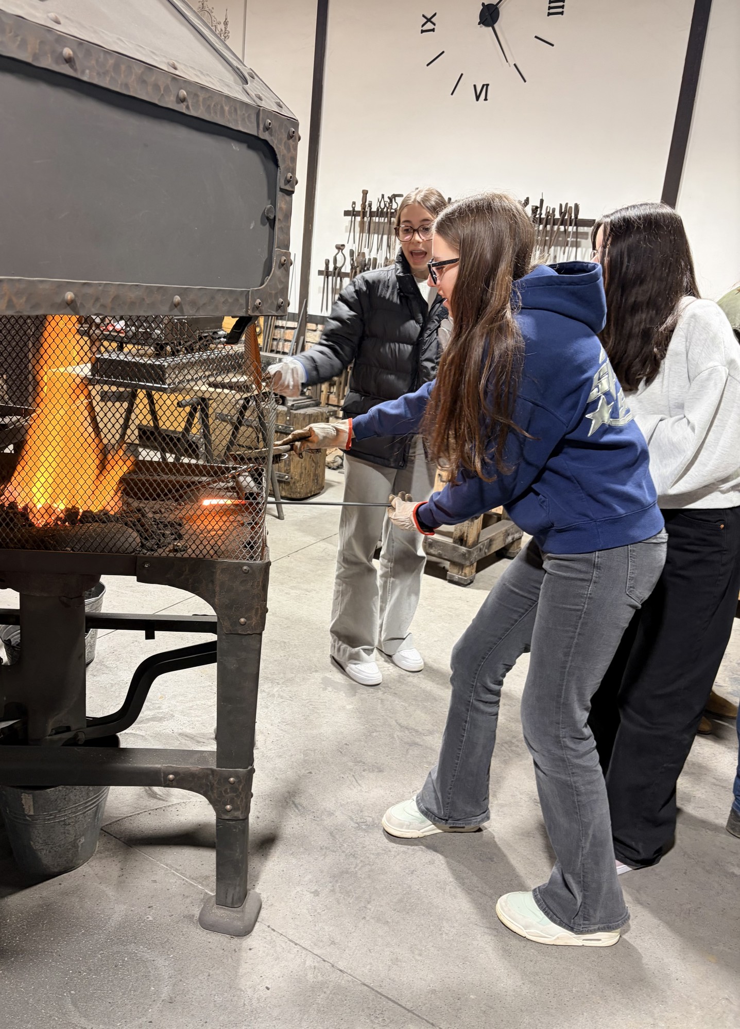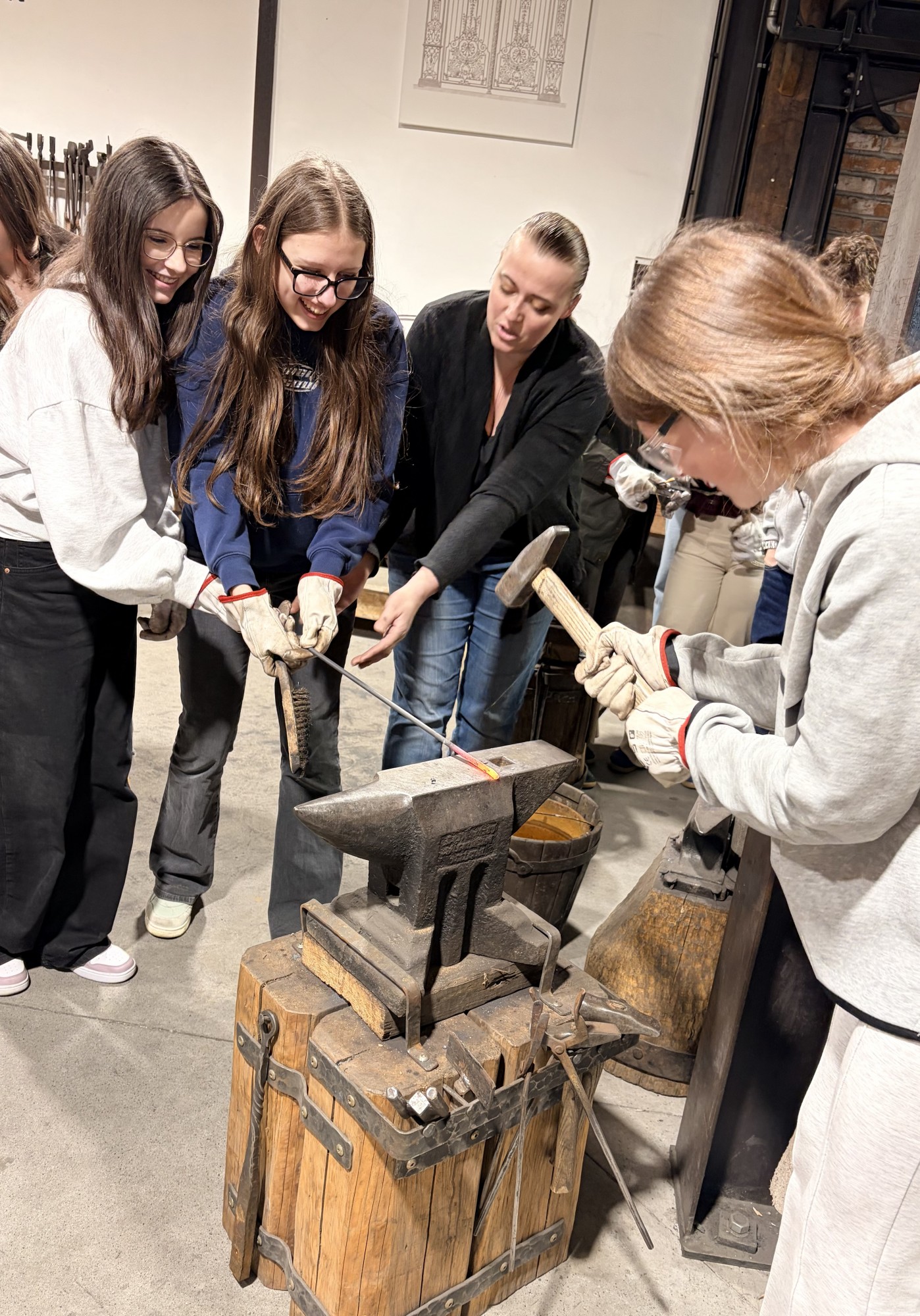 Hned potom jsme zamířili do kovárny, kde nám kovářka povyprávěla spoustu zajímavostí o svém řemesle. Pak už si to žáci mohli vyzkoušet na vlastní kůži – ve skupinkách vyráběli hřebík ze surového materiálu, což pro ně byla zábava. A nejen pro žáky – hřebík si zkusili vyrobit i učitelé ze Španělska. Někteří žáci pak využili možnost vyzkoušet si brnění nebo meče.