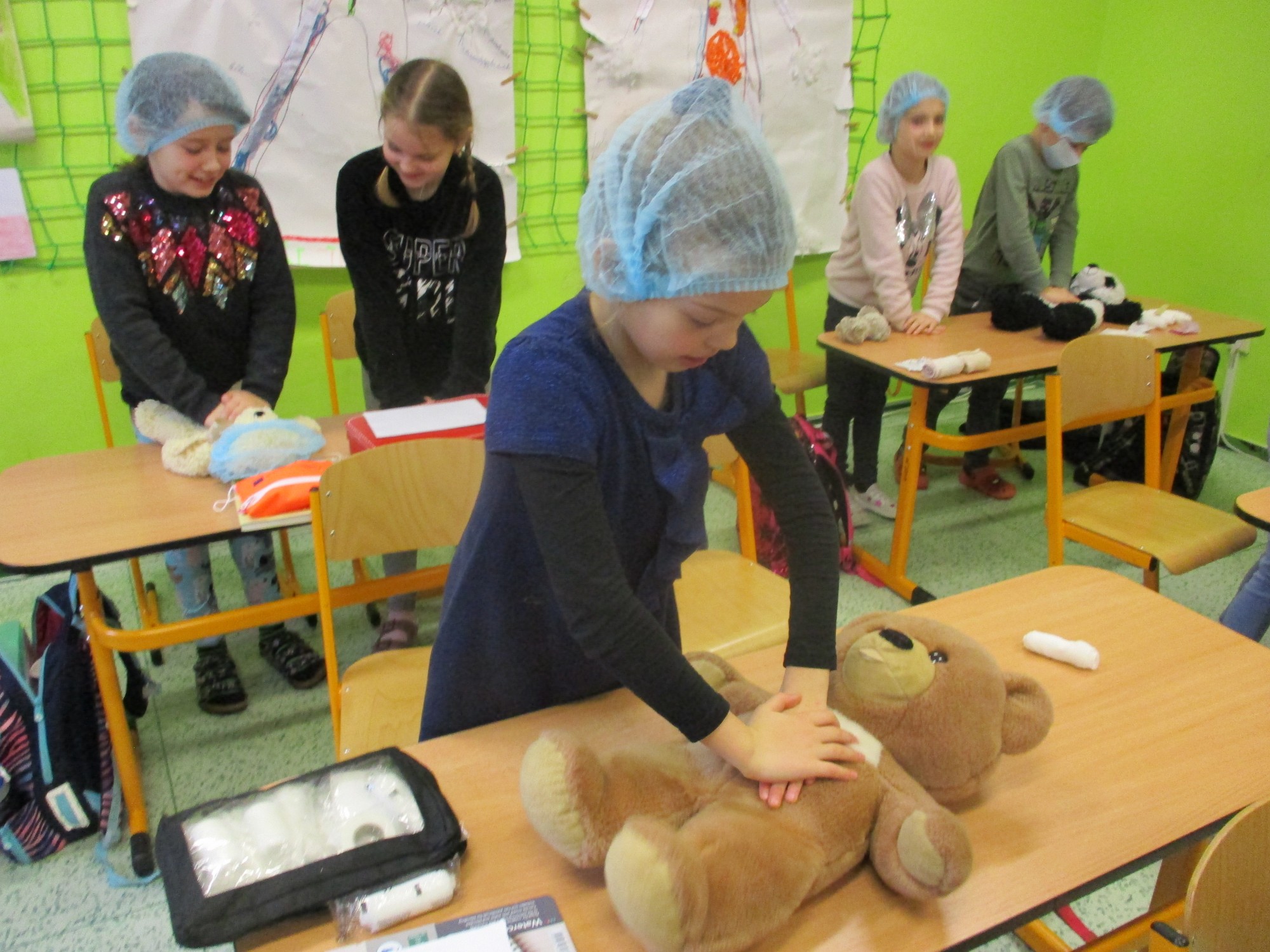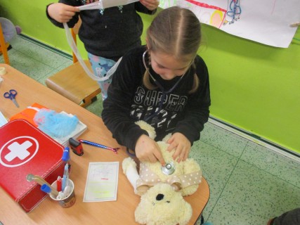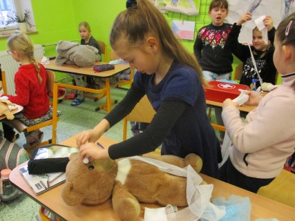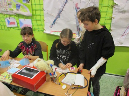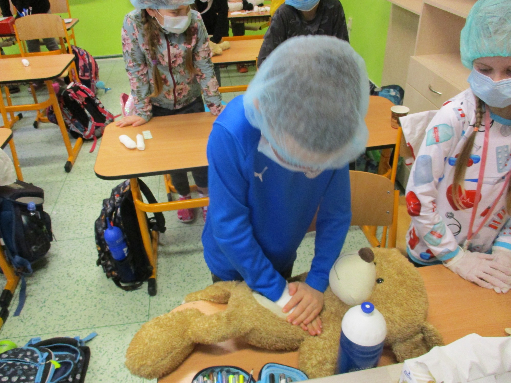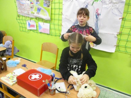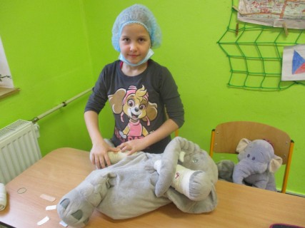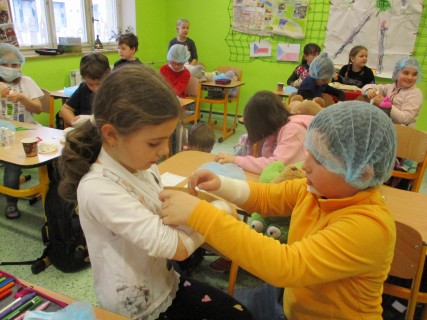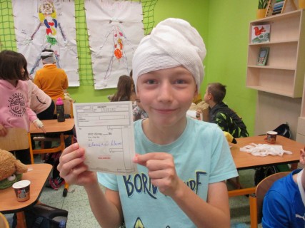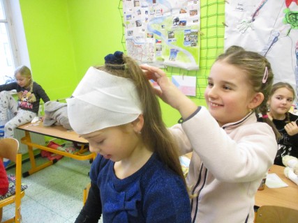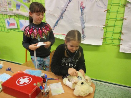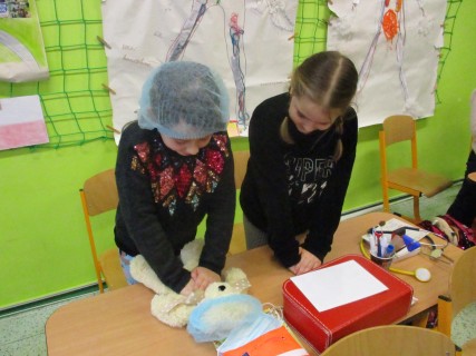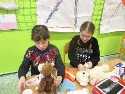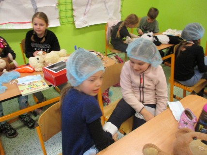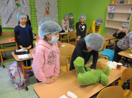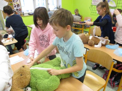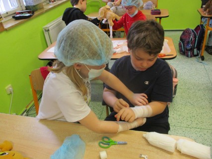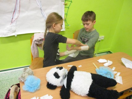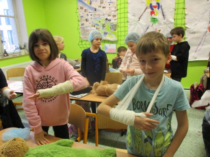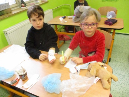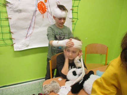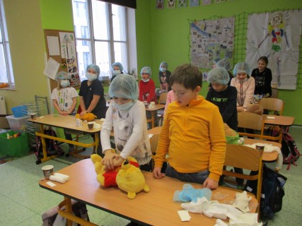 Žáci 2. B také využili obyčejné plyšové medvídky, sady imitací poranění a spotřební materiál.