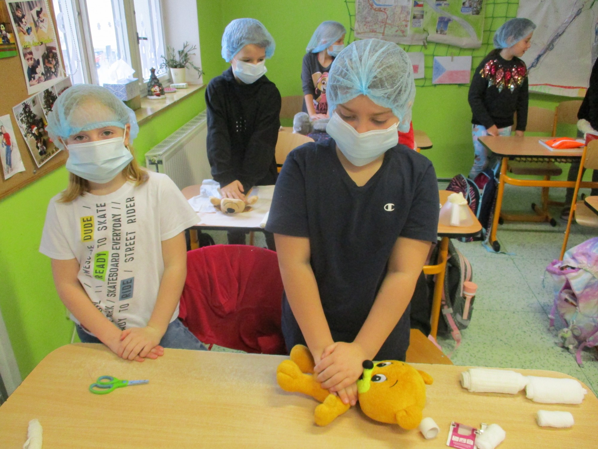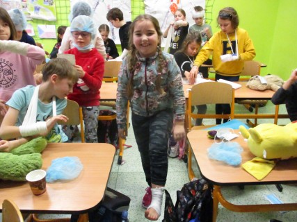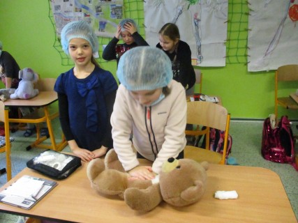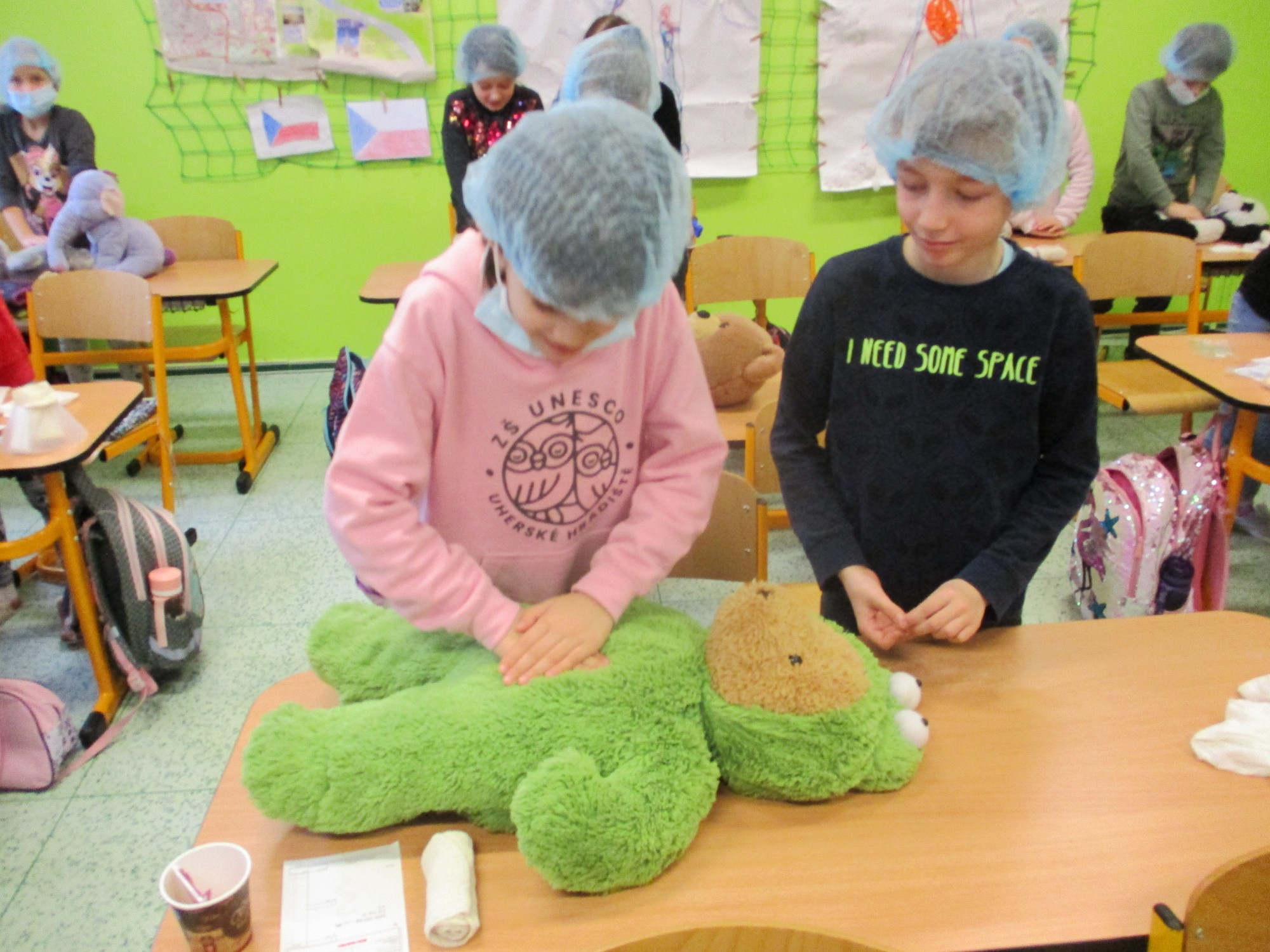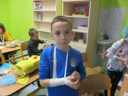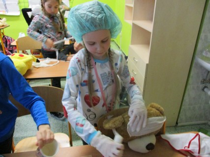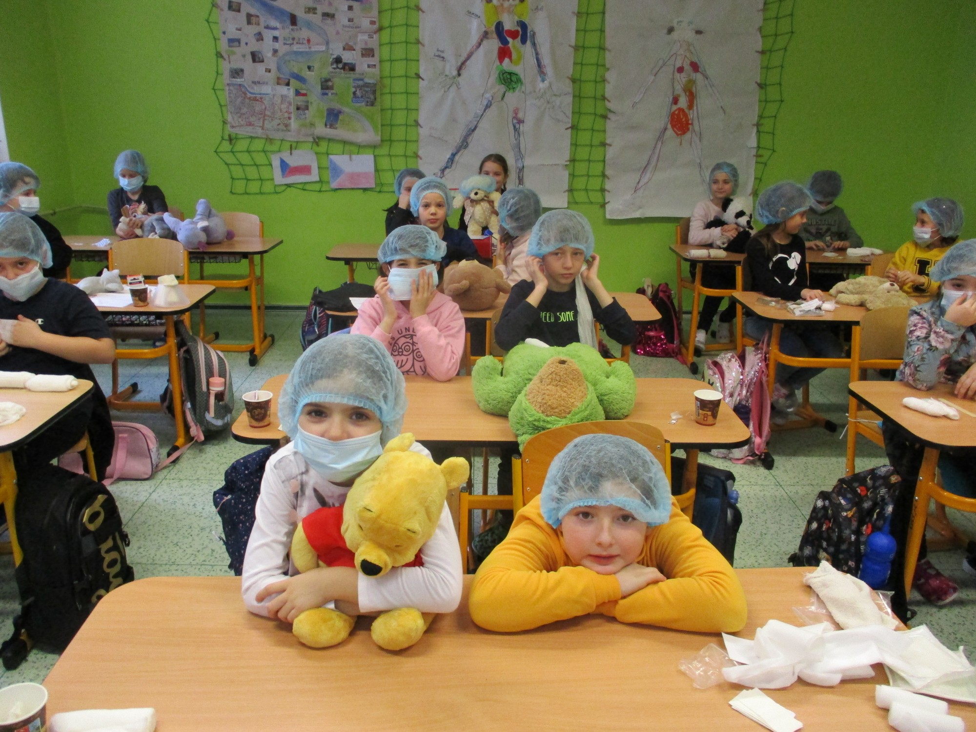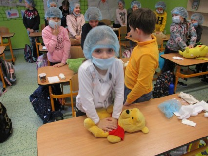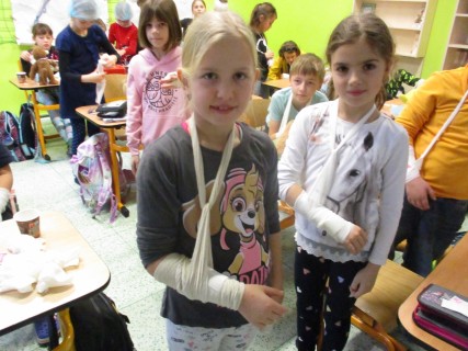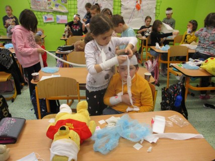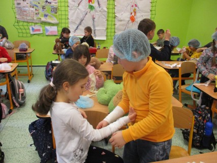 Žáci 2. B také využili obyčejné plyšové medvídky, sady imitací poranění a spotřební materiál.