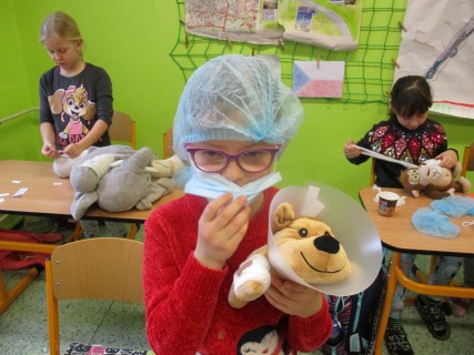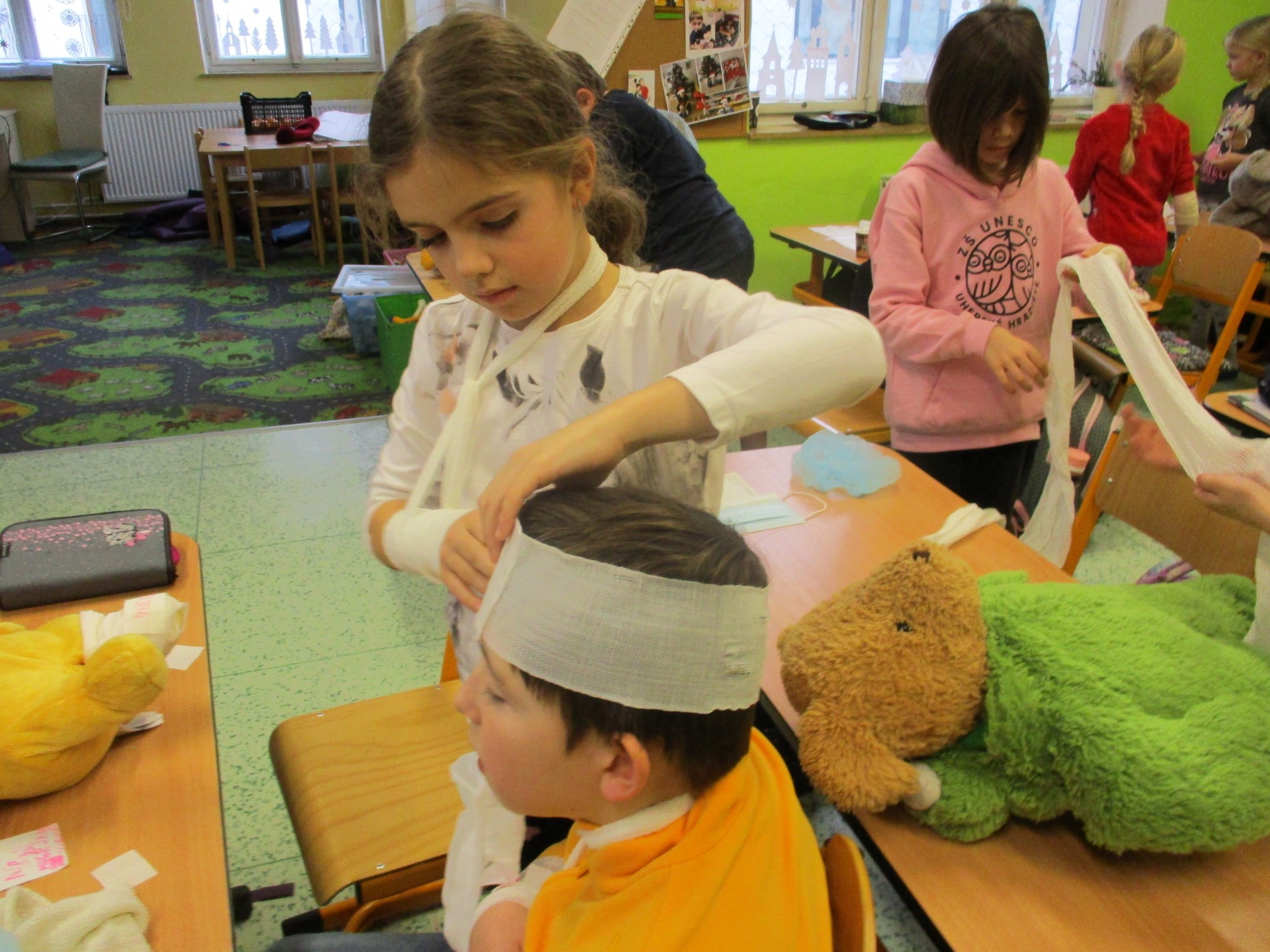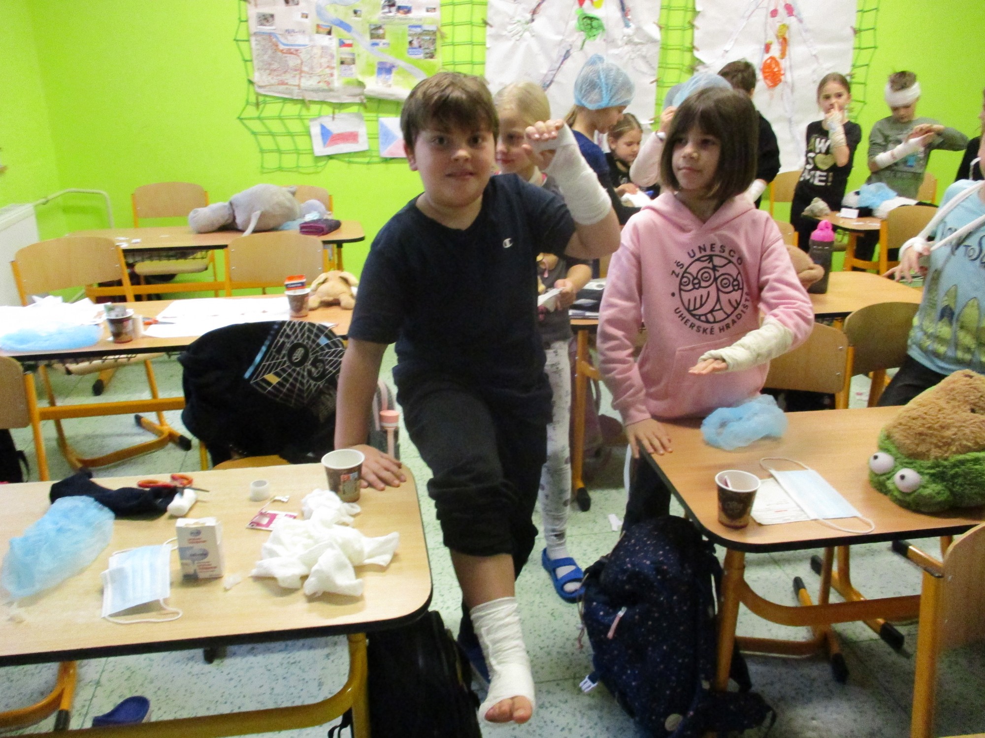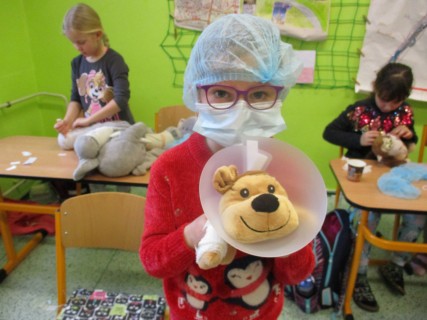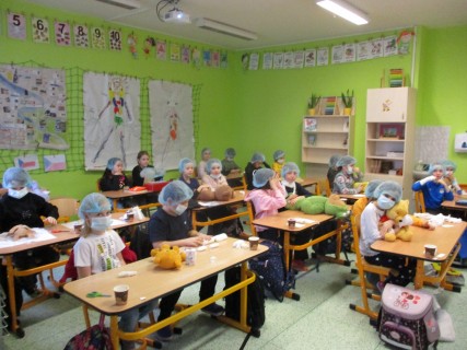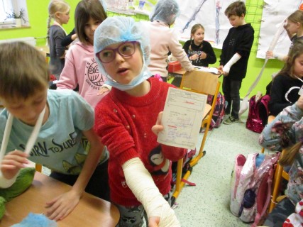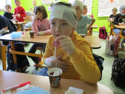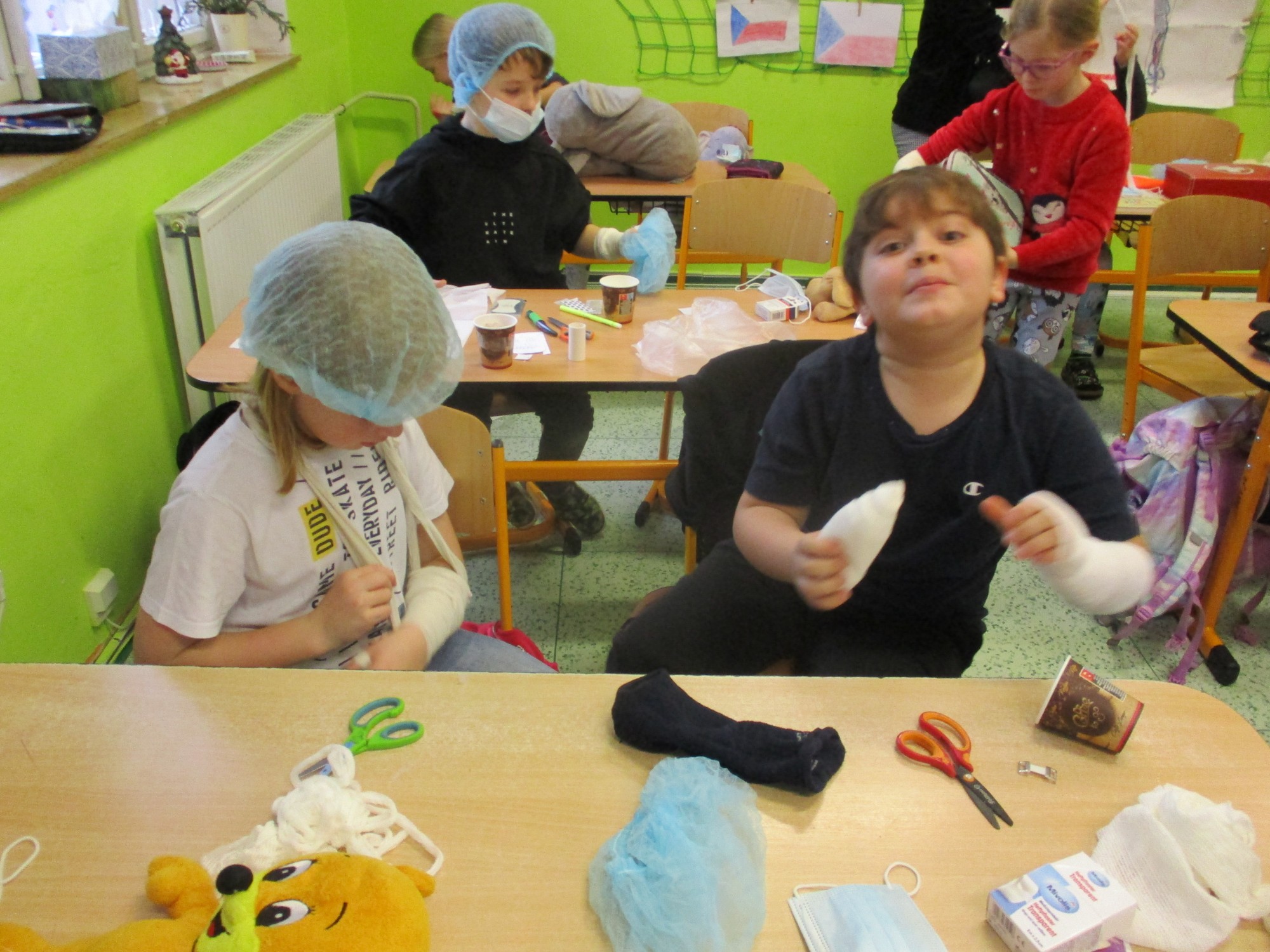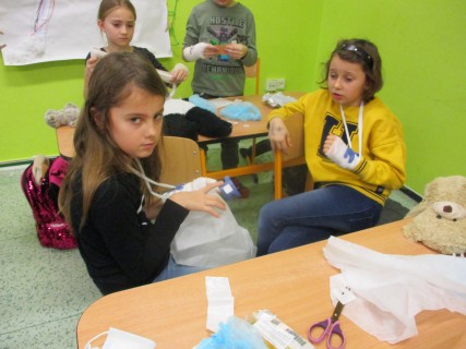 Žáci 2. B také využili obyčejné plyšové medvídky, sady imitací poranění a spotřební materiál.