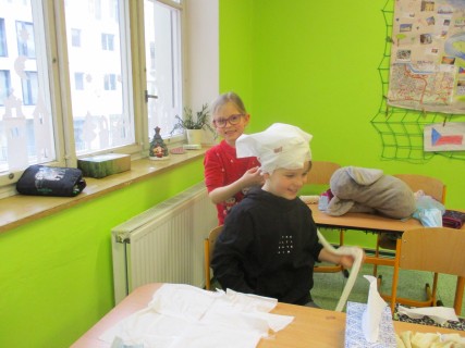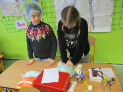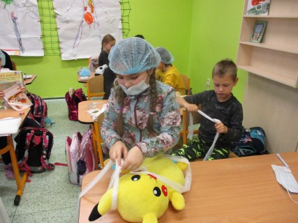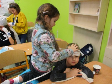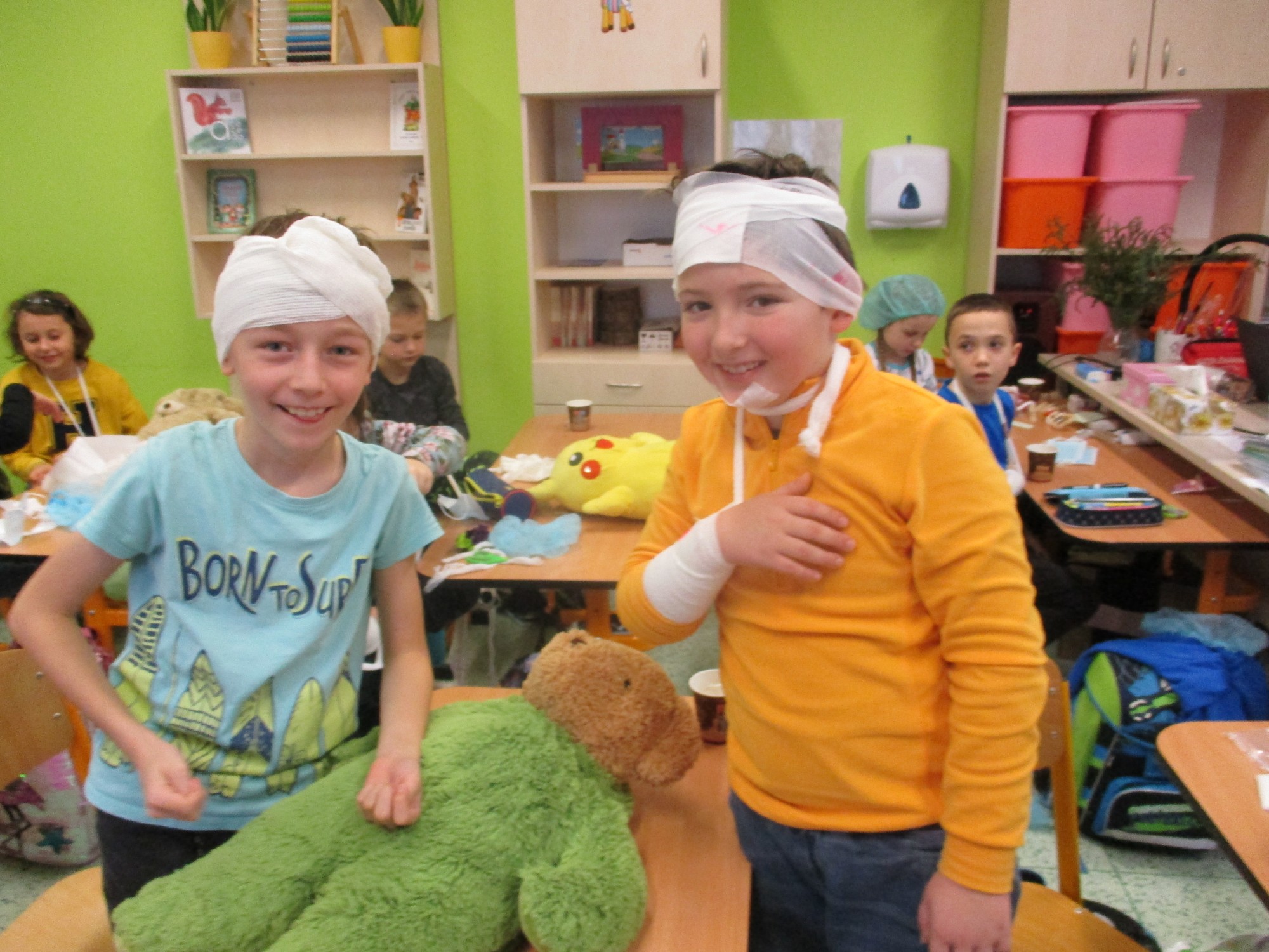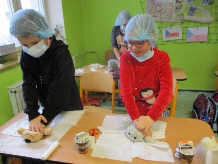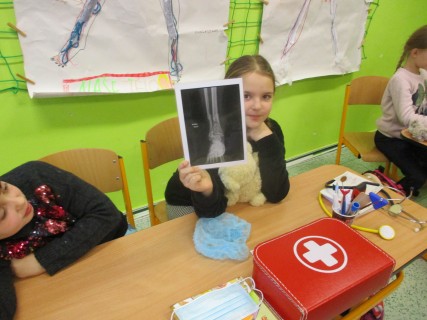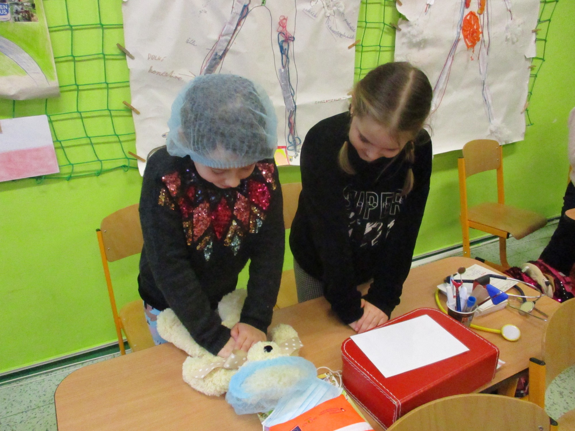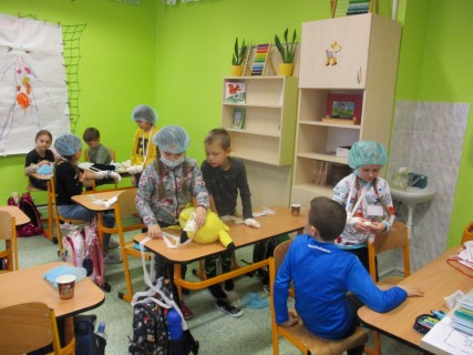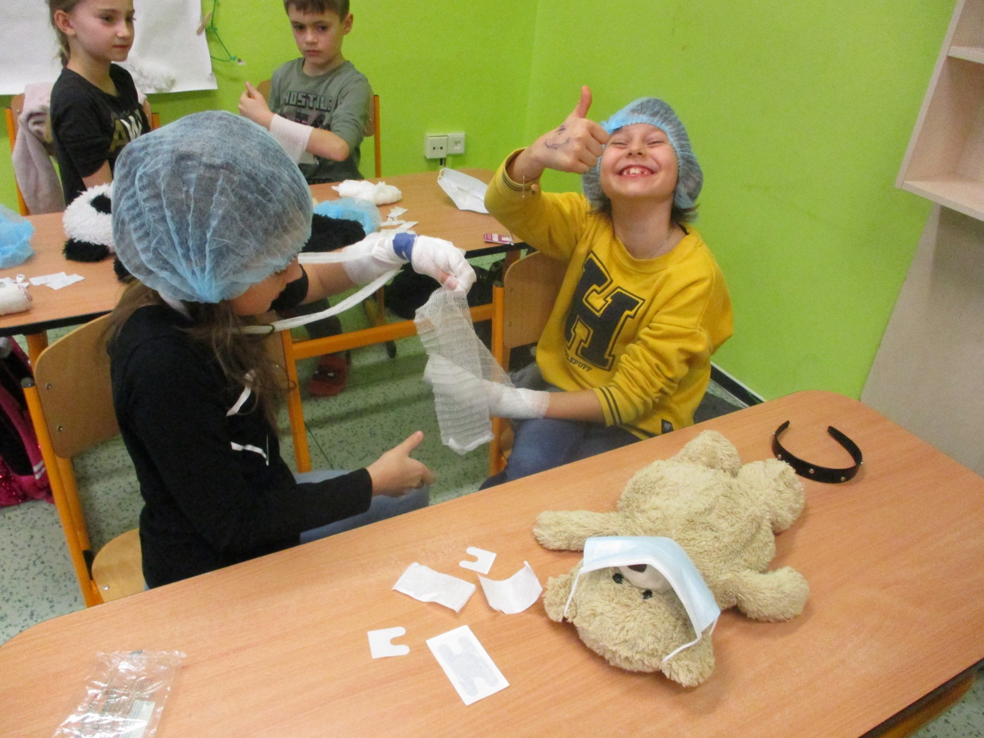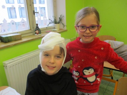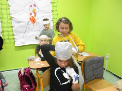 Žáci 2. B také využili obyčejné plyšové medvídky, sady imitací poranění a spotřební materiál.