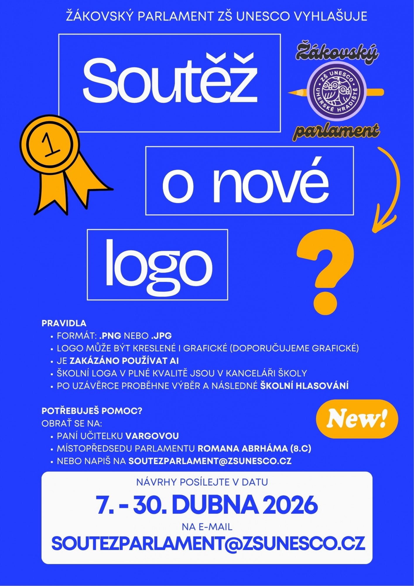 Žákovský parlament ZŠ UNESCO vyhlašuje kreativní soutěž pro všechny žáky školy – navrhni nové logo Žákovského parlamentu a pomoz vytvořit vizuální symbol, který nás bude reprezentovat v dalších letech.