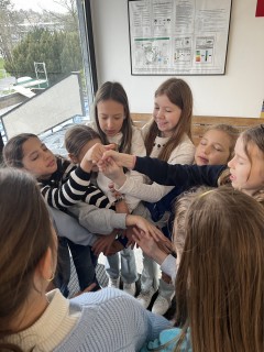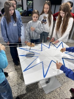Na dalších stanovištích si žáci vyzkoušeli aktivity zaměřené na komunikaci, například gesto a slovo, kde si uvědomili, jak náročné může být dorozumívání bez běžných komunikačních prostředků. Velmi zajímavé byly i úkoly jako gordický uzel, kreslící bludiště, skládání puzzle nebo diktát písmen na záda, které rozvíjely spolupráci, trpělivost a schopnost soustředění.