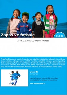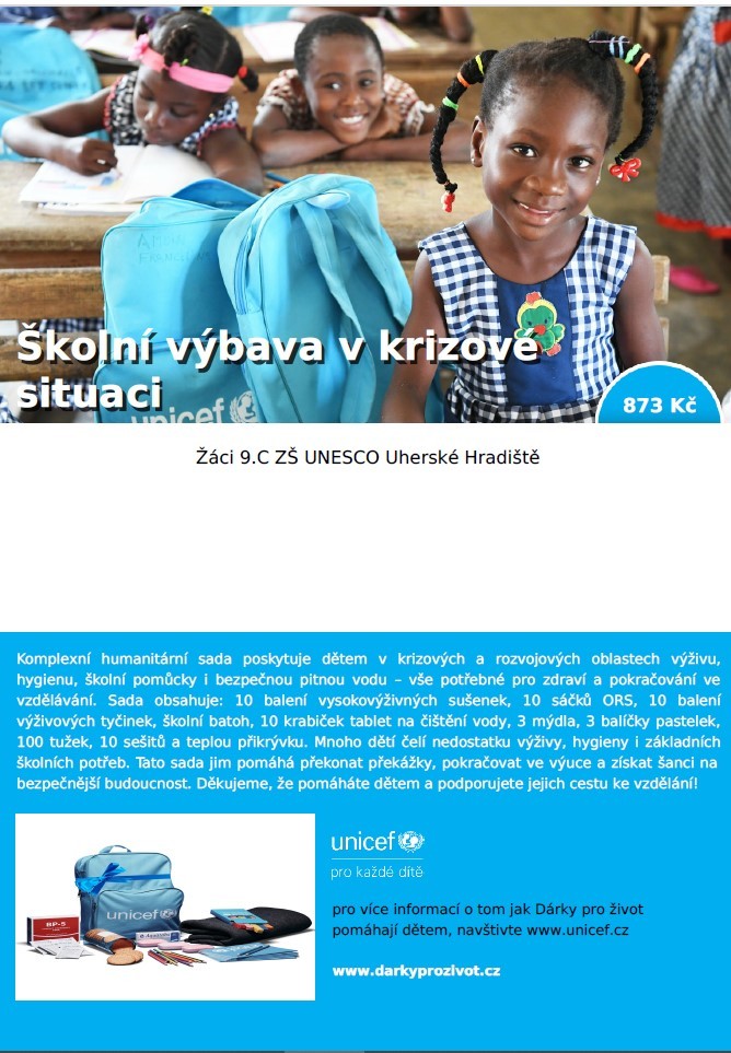 Žáci 9.C se rozhodli v rámci programu Dárek pro život organizace UNICEF zakoupit jeden zápas ve fotbale a školní výbavu v krizové situaci ....jedny z možností humanitární pomoci dětem v postižených oblastech světa.