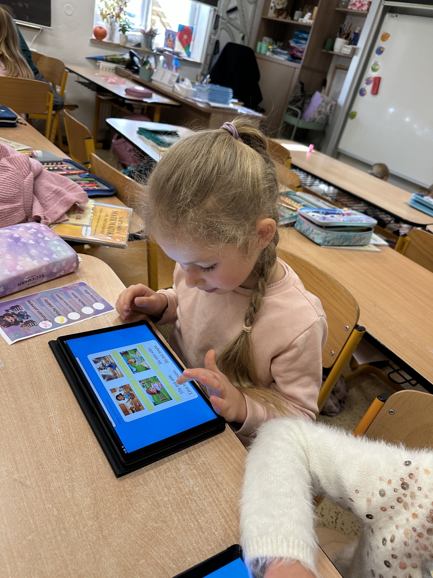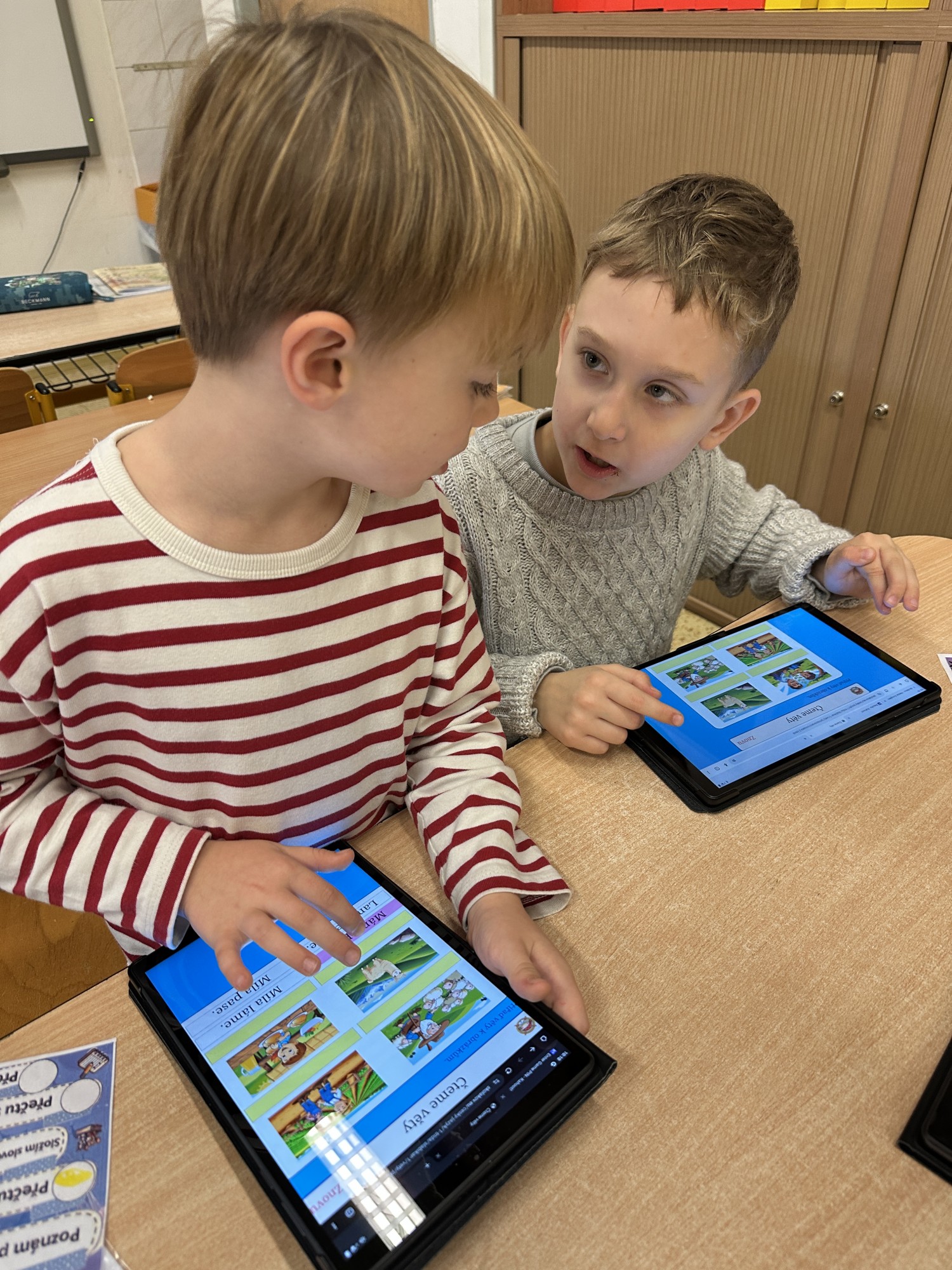 - Práce na tabletu – prvňáčci si poprvé vyzkoušeli jednoduché interaktivní úkoly, které je nejen bavily, ale zároveň rozvíjely jemnou motoriku i čtenářské dovednosti.