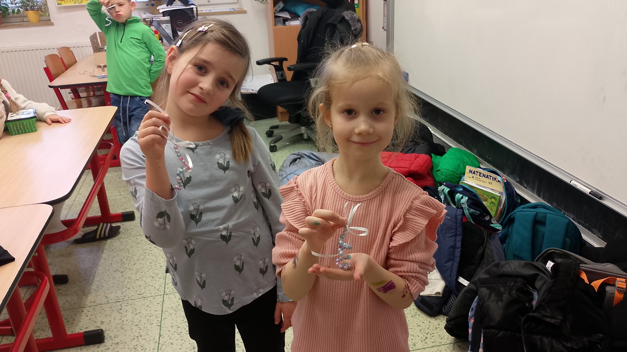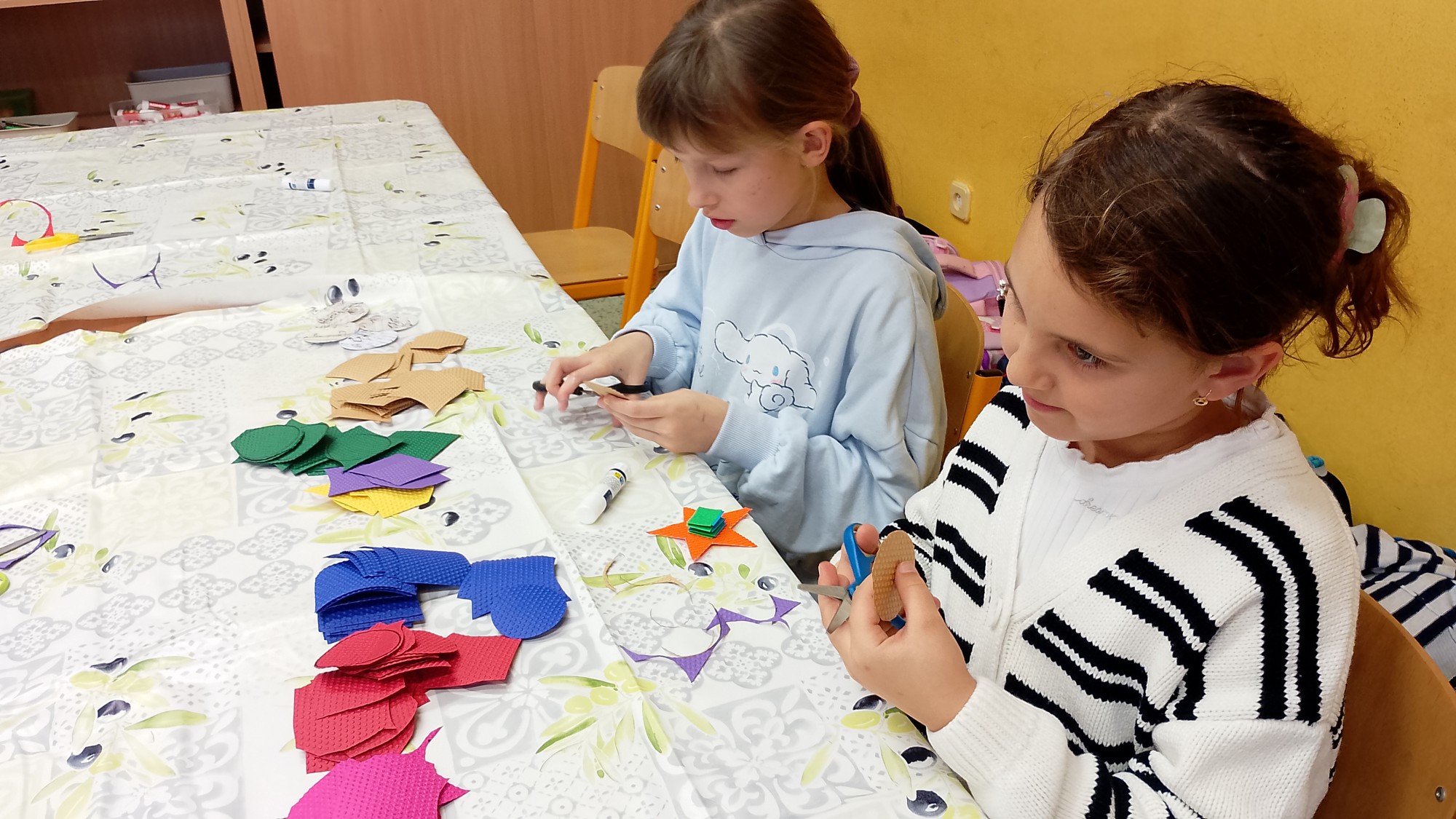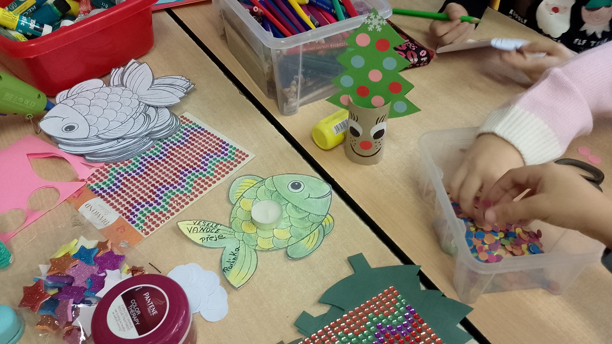 Paní vychovatelky měly pro děti připravené veškeré potřebné materiály a pomáhaly jim s výrobou. Děti si s nadšením a elánem vyráběly například třpytivé baňky jako ozdoby na vánoční stromeček, korálkové spirály, vánoční masky nebo svícen s kapříkem.