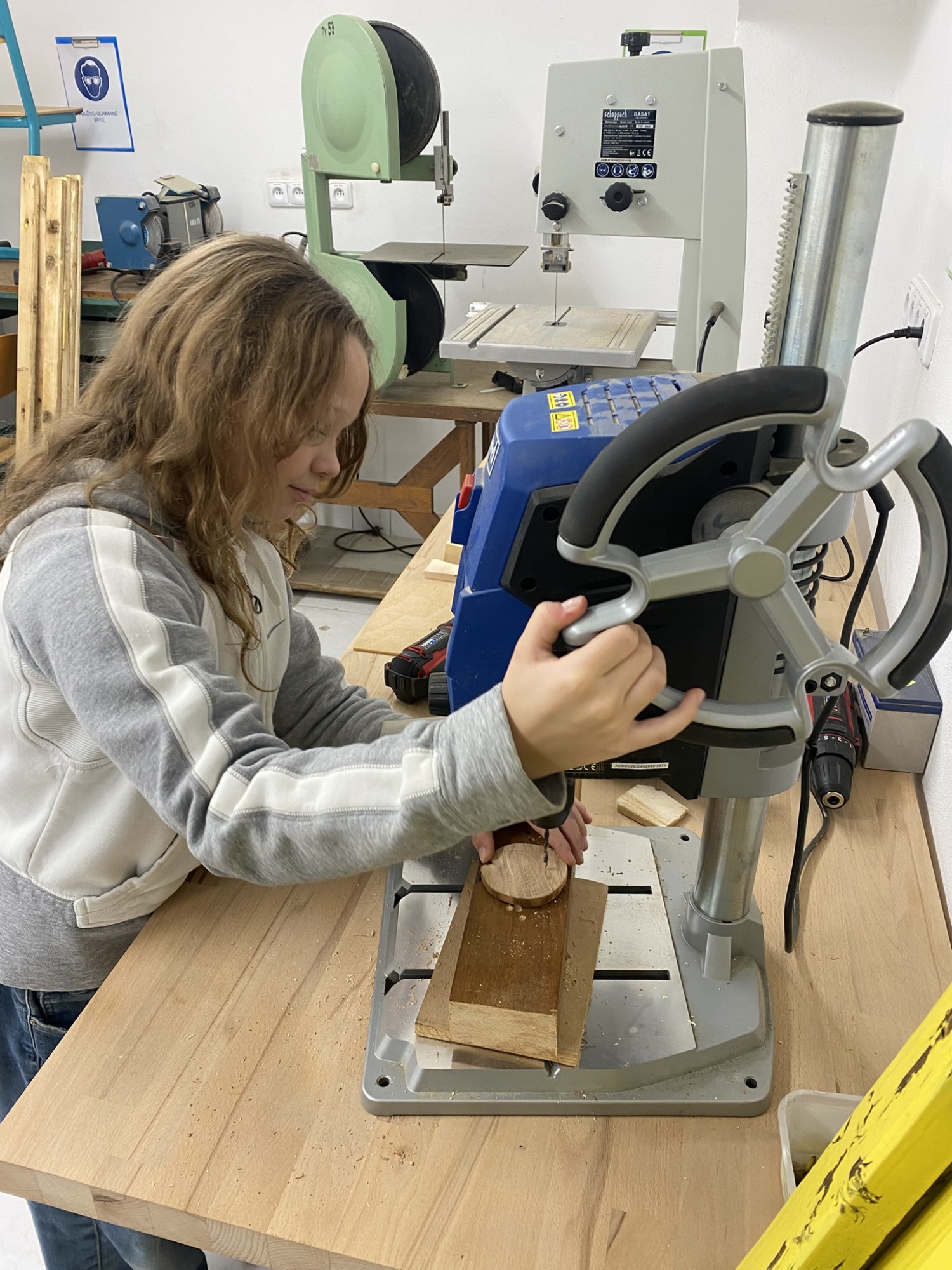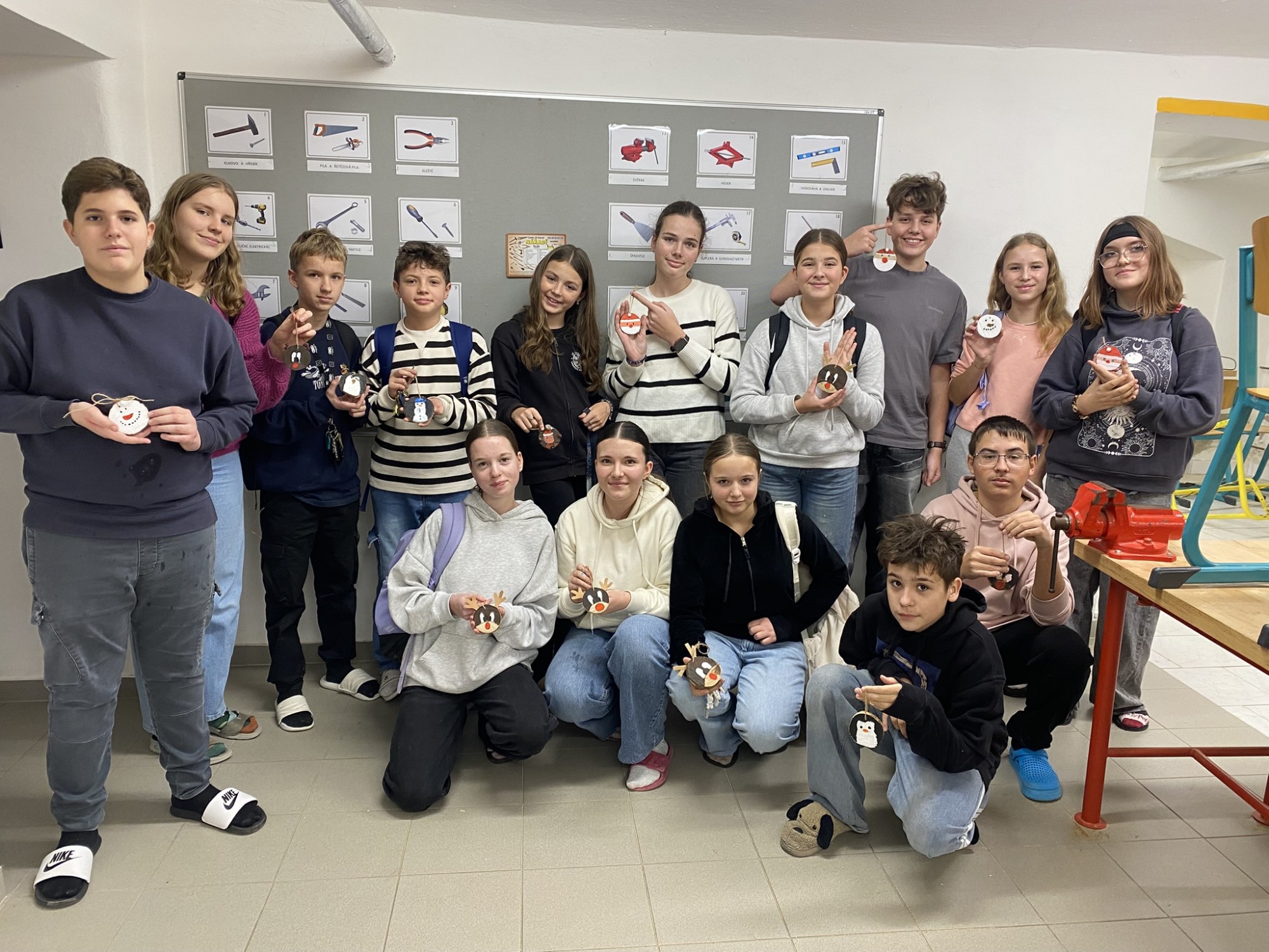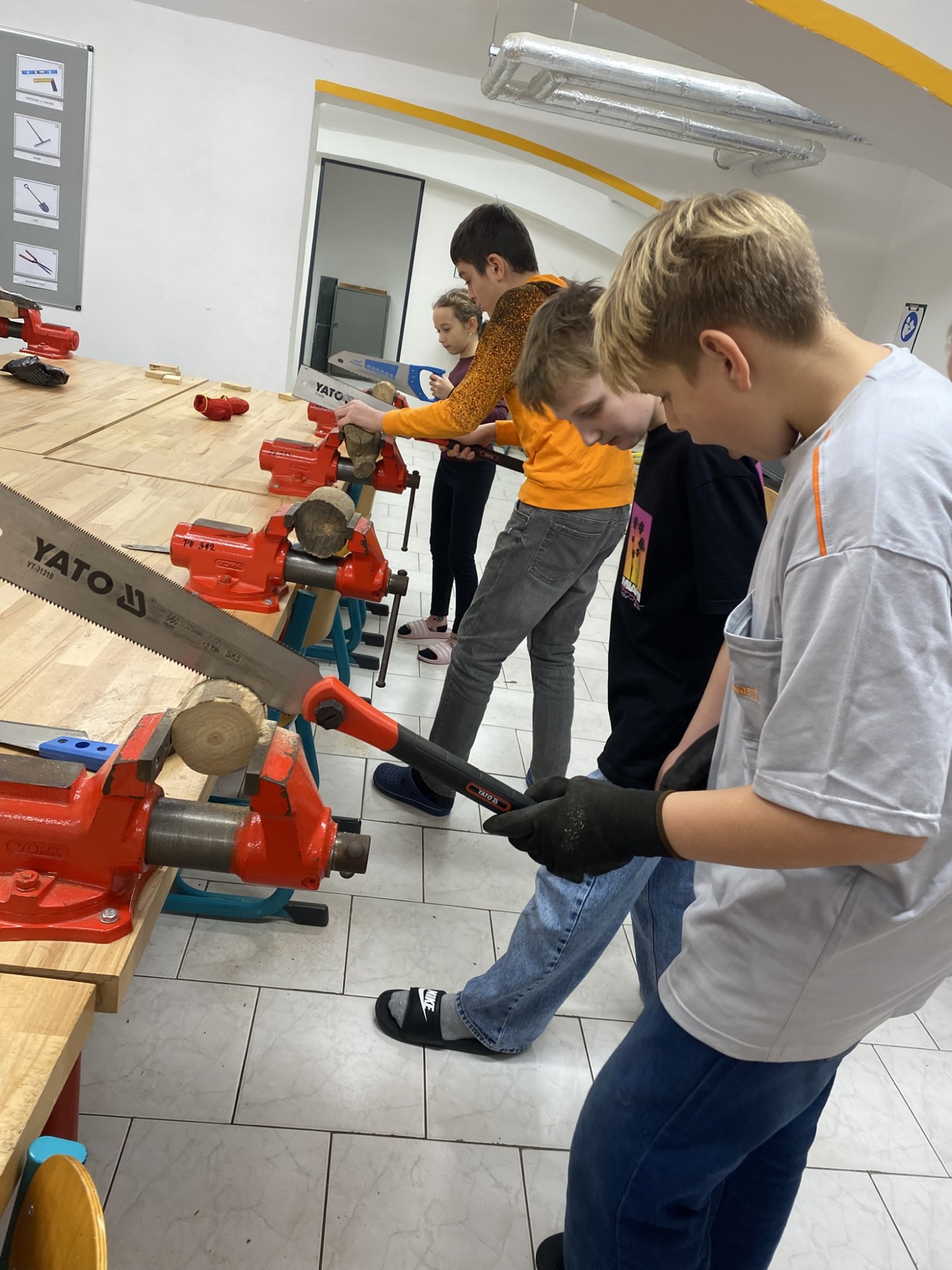 Nejprve si každý žák nařezal kulatinu ruční pilou na jednotlivá kolečka. Po úvodní práci s pilou následovalo pilování pilníkem, aby byly hrany i povrch dřevěných koleček hladké. Jakmile byly plátky připravené, přesunuli se žáci ke stolní vrtačce, kde si pod dohledem vyvrtali dírku na provázek.