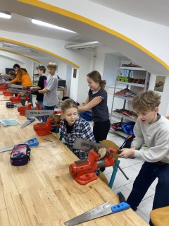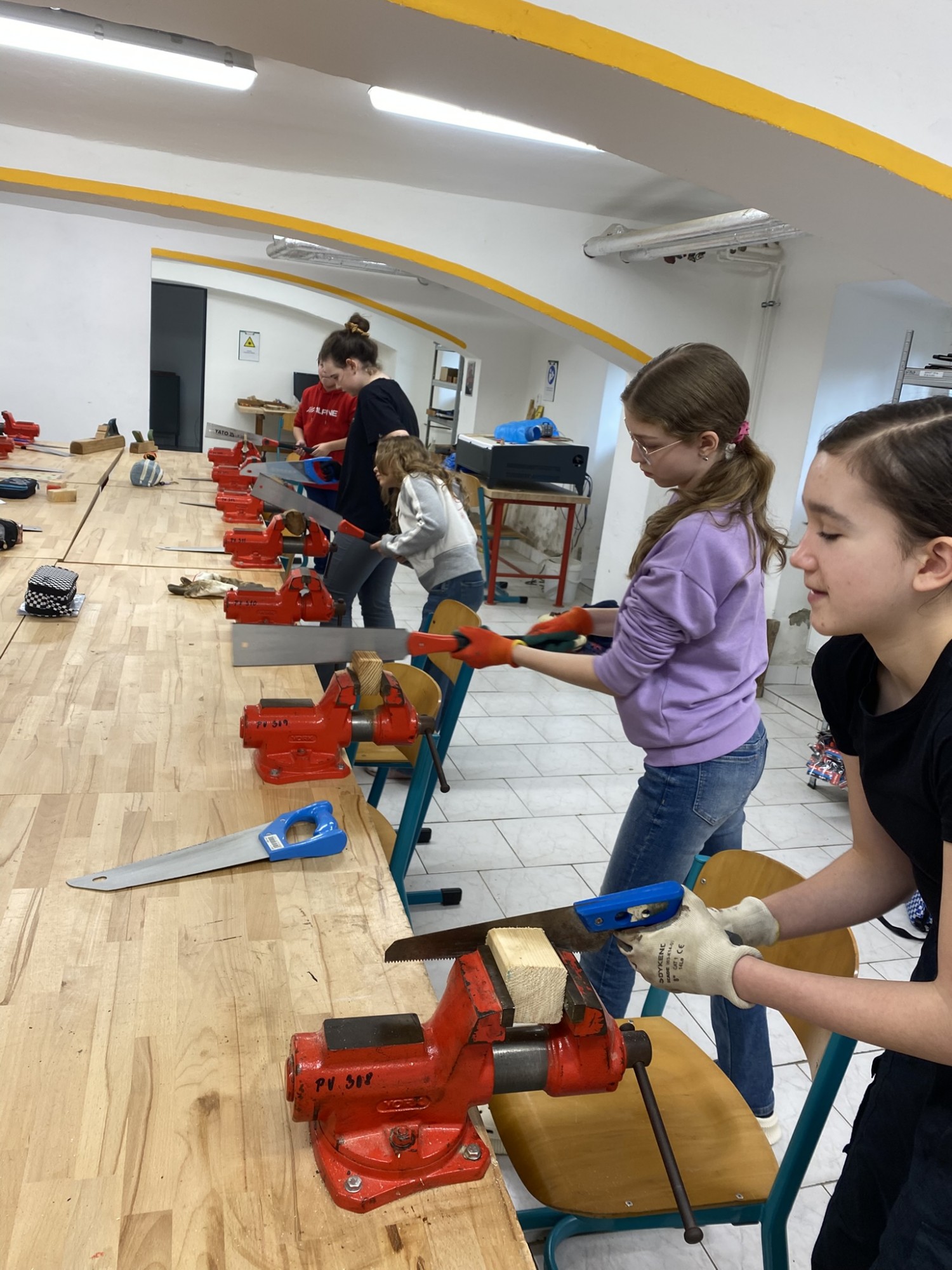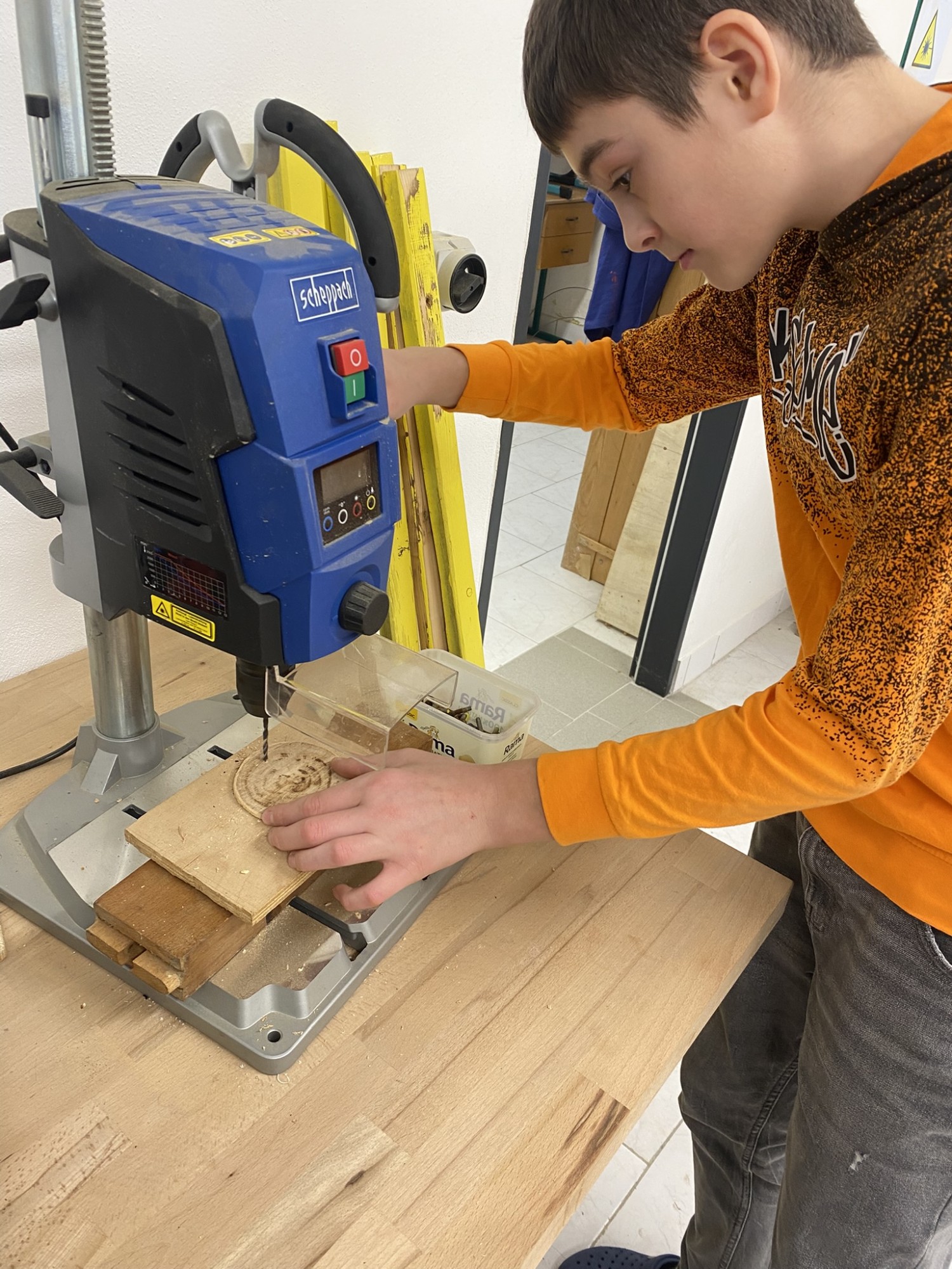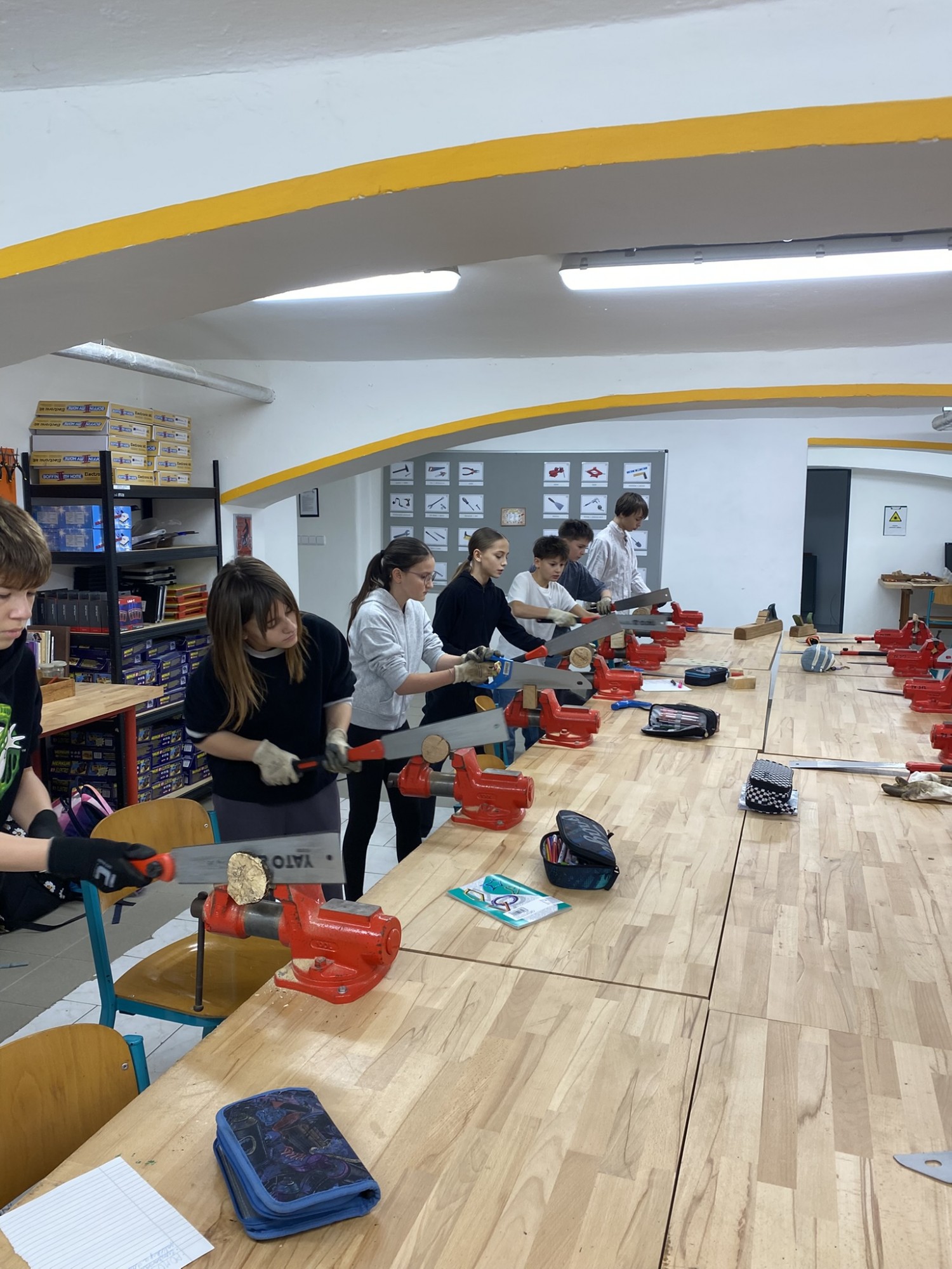 Nejprve si každý žák nařezal kulatinu ruční pilou na jednotlivá kolečka. Po úvodní práci s pilou následovalo pilování pilníkem, aby byly hrany i povrch dřevěných koleček hladké. Jakmile byly plátky připravené, přesunuli se žáci ke stolní vrtačce, kde si pod dohledem vyvrtali dírku na provázek.