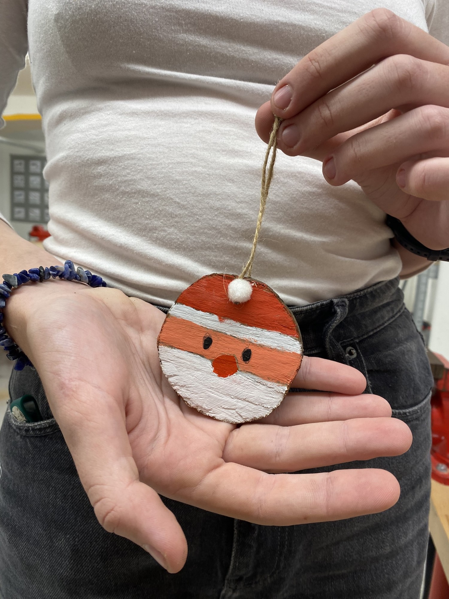 V závěrečné fázi přišlo na řadu zdobení – a právě tady naplno vynikla kreativita všech. Dřevěná kolečka žáci barvili akrylovými barvami, vytvářeli sněhuláky, Mikuláše, zimní scenérie i veselé obličejíčky. Nakonec své výtvory doplnili ozdobnými bambulkami, které ozdobám dodaly hravý a slavnostní vzhled.