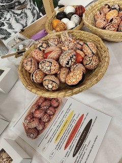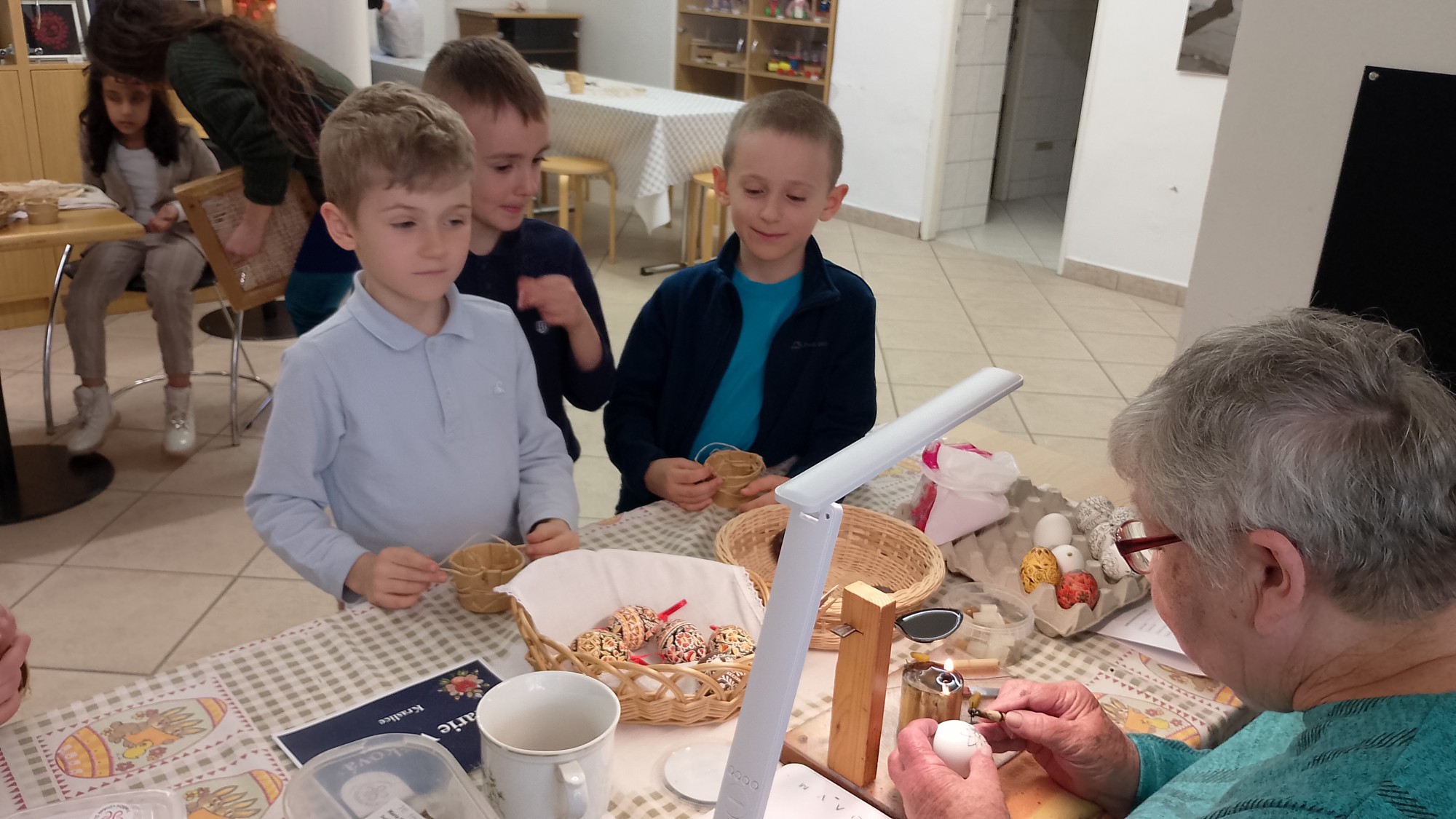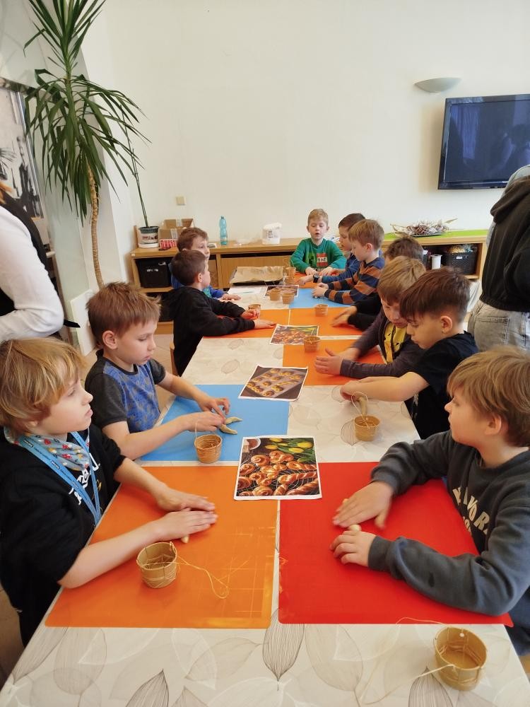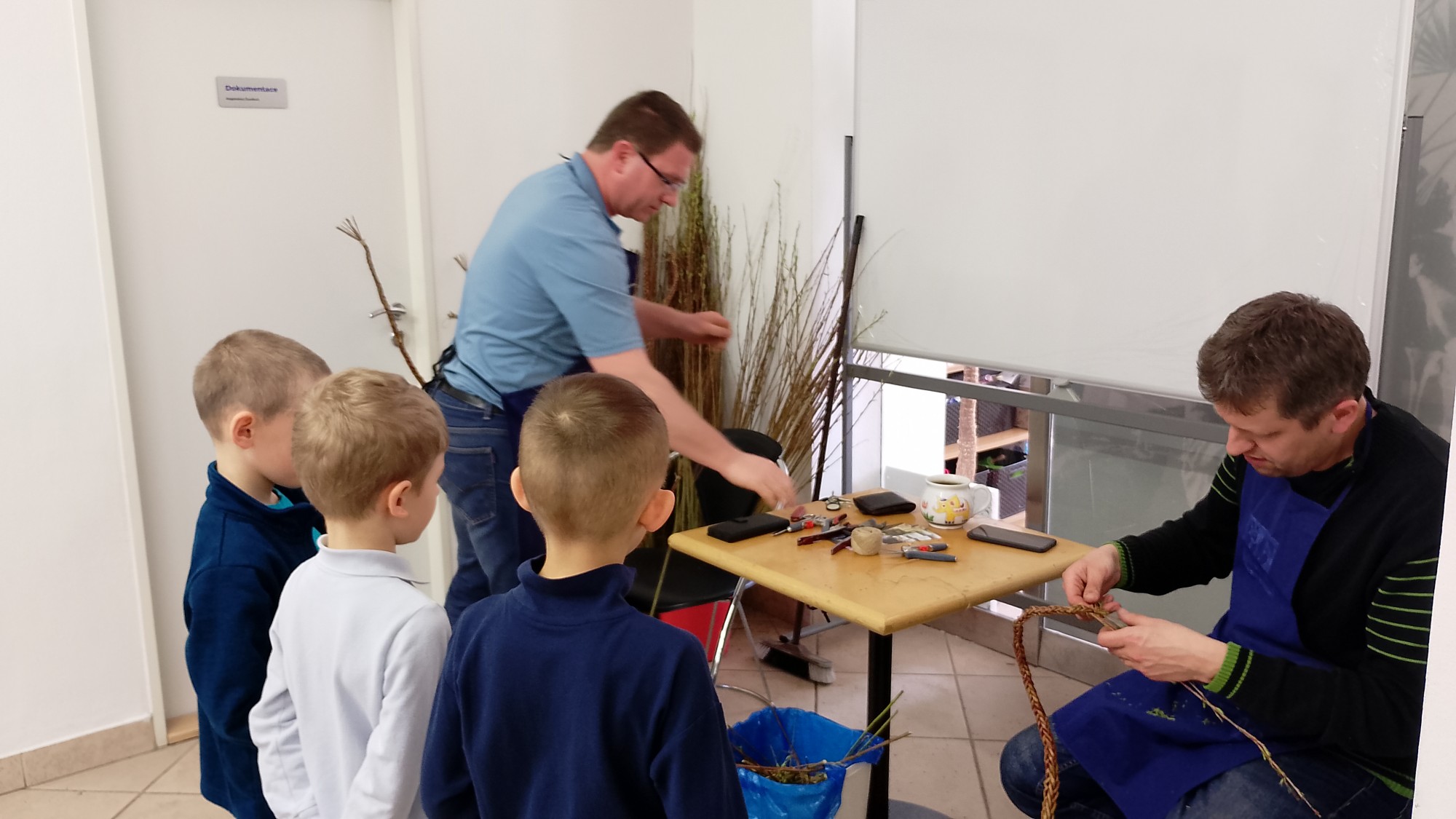 Jako každý rok, tak i letos Slovácké muzeum v Uh. Hradišti uspořádalo Velikonoční tvořivé dílničky. Děti si mohly upéct jidáše, potom si vyrobily papírový košíček s lýkem. První se navnadily u paní, která zdobila vajíčka roztopeným voskem, tak si udělaly své vlastní papírové vajíčko taky voskem. Potom se mohly podívat jak se plete pomlázka nebo vyrábí různé ozdoby ze šustí.