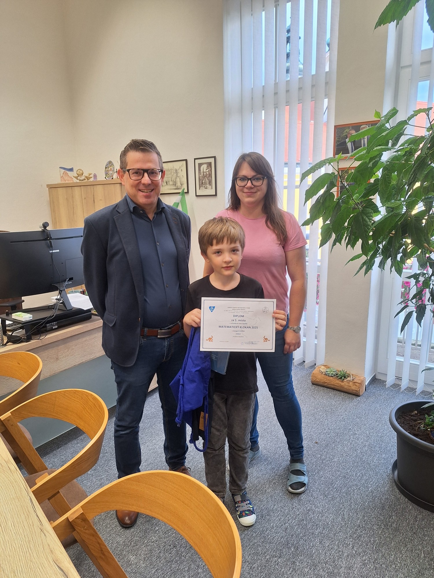 V pátek 12. září si András Szalma ze 4.A převzal diplom za 1. místo v celostátním kole soutěže Matematický klokan 2025, která se uskutečnila na jaře. András soutěžil v kategorii Cvrček pro žáky 2. a 3. ročníku. Gratulujeme k vítězství a přejeme spoustu úspěchů (nejen) v dalších ročnících.