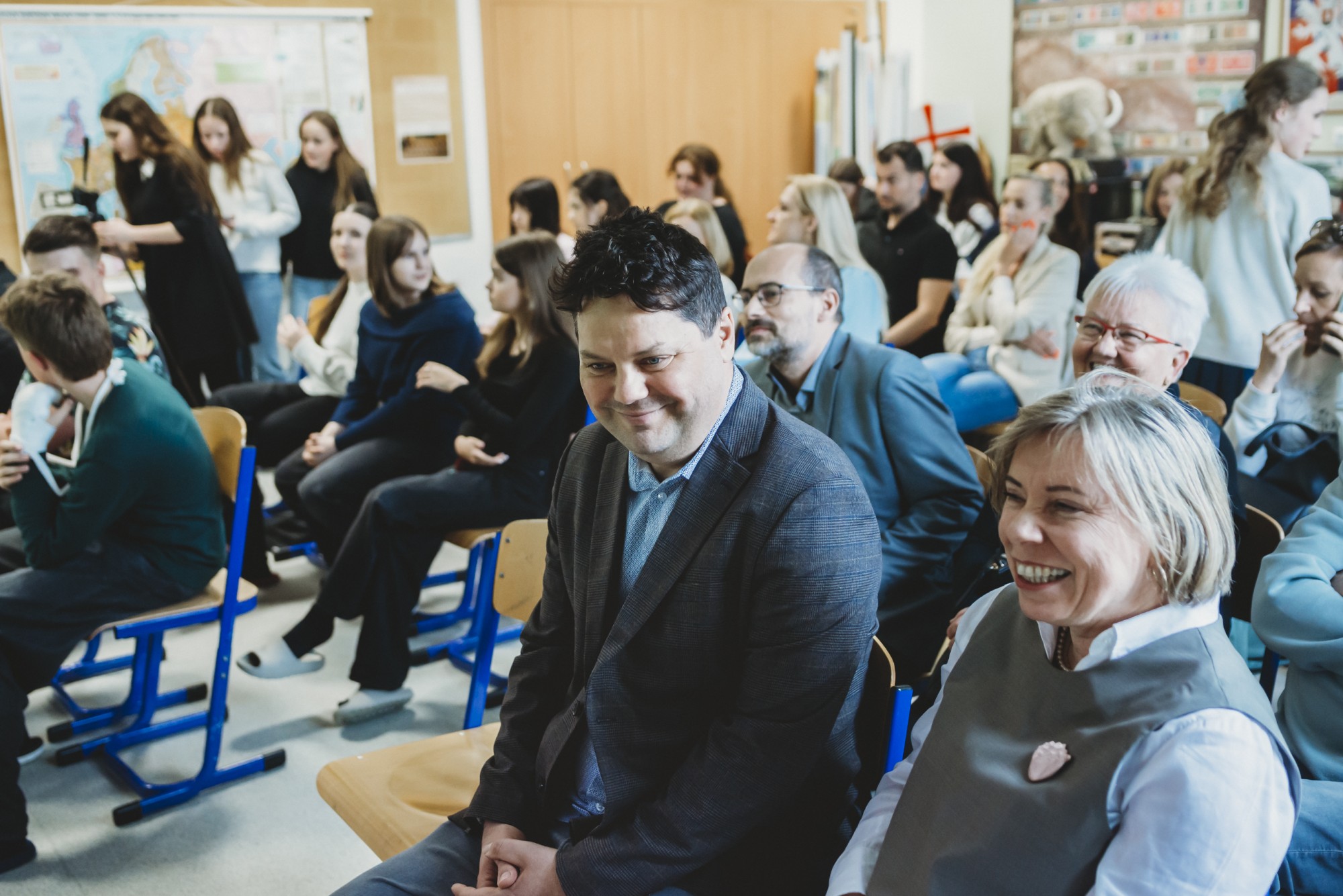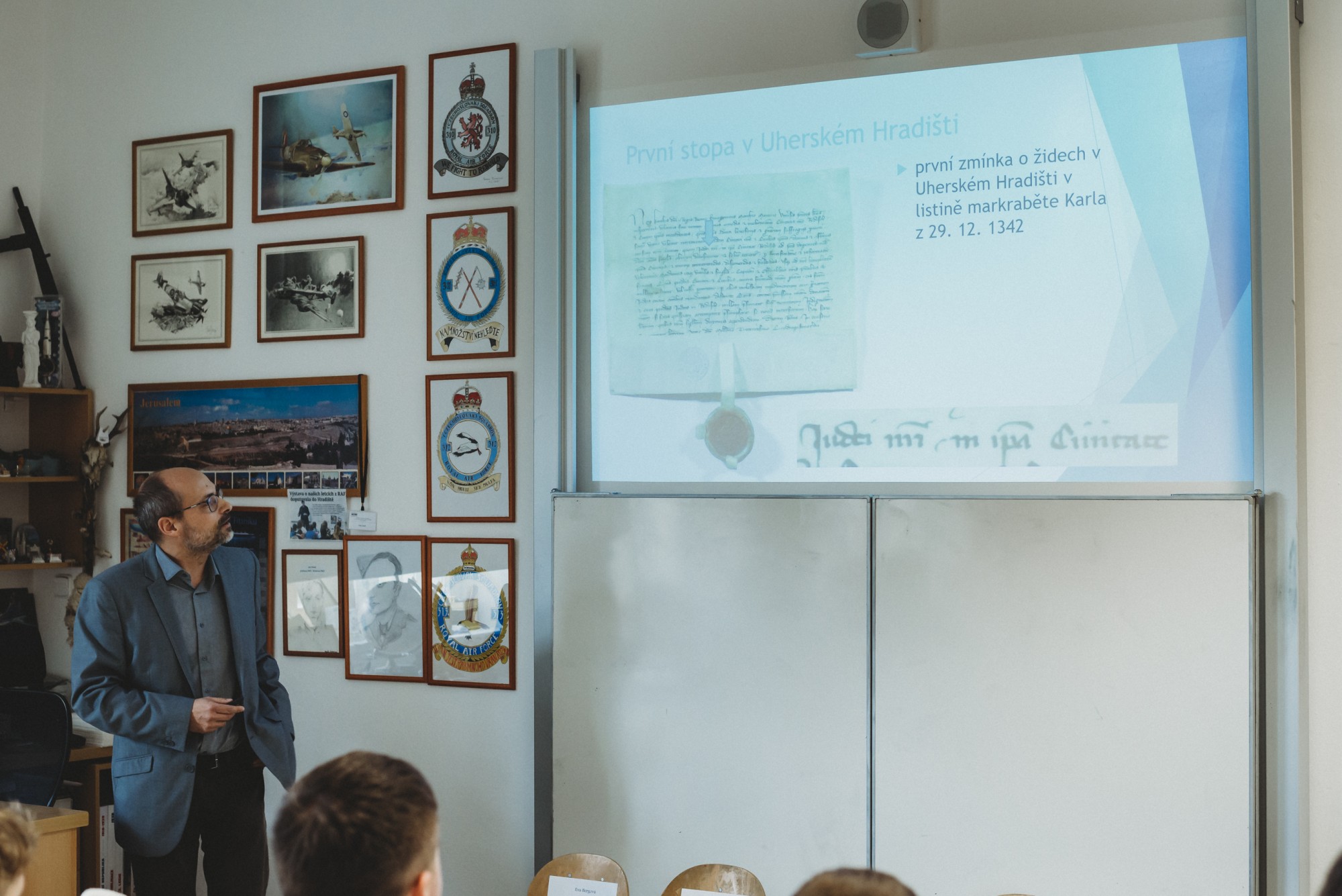 Významným hostem byl také ředitel Státního okresního archivu v Uherském Hradišti Mgr. Lukáš Čoupek, Ph.D., který měl pro účastníky připravenou odbornou prezentaci o historii židovské komunity v Uherském Hradišti. Představil také první archivní dokumenty, které pomohly identifikovat devět bývalých žáků naší školy, jimž byl v roce 1940 zakázán přístup ke vzdělání a kteří byli později deportováni do Terezína a následně do vyhlazovacích táborů.