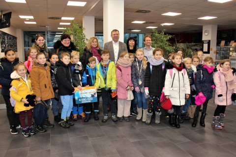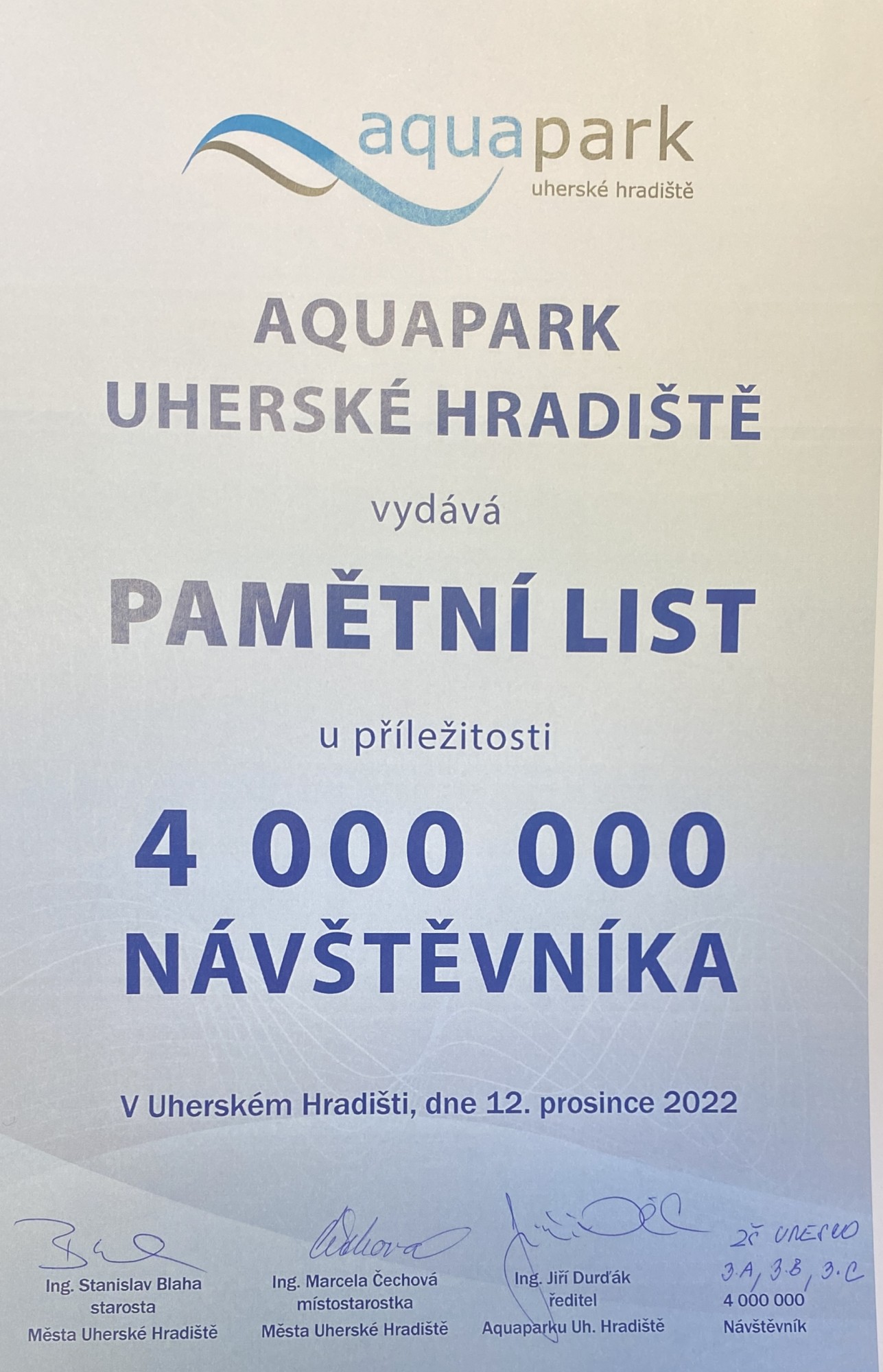 Při příchodu na dnešní plavání čekalo na naše třeťáky s doprovázejícími paními učitelkami neuvěřitelné překvapení - stali se čtyřmiliontými návštěvníky Aquaparku v Uherském Hradišti.