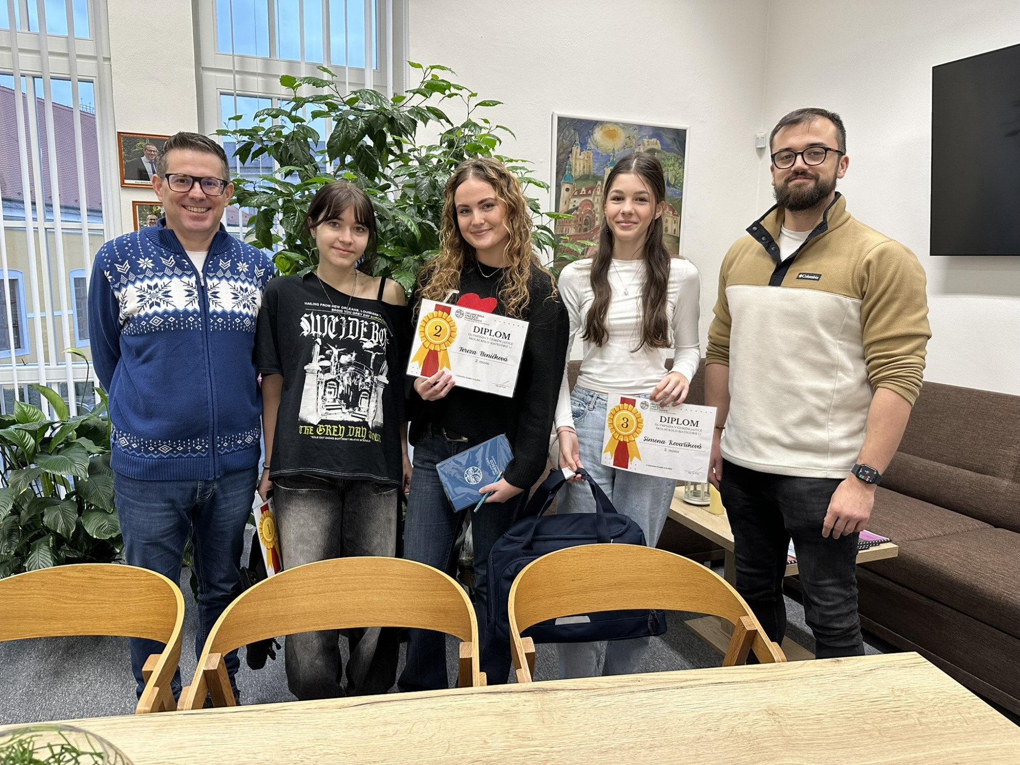 První dvě umístěné žákyně budou naši školu reprezentovat v okresním kole. Všem oceněným srdečně gratulujeme a děkujeme za jejich výbornou práci. Zároveň děkujeme všem soutěžícím za poctivou přípravu a odvahu pustit se do náročných jazykových úkolů.
